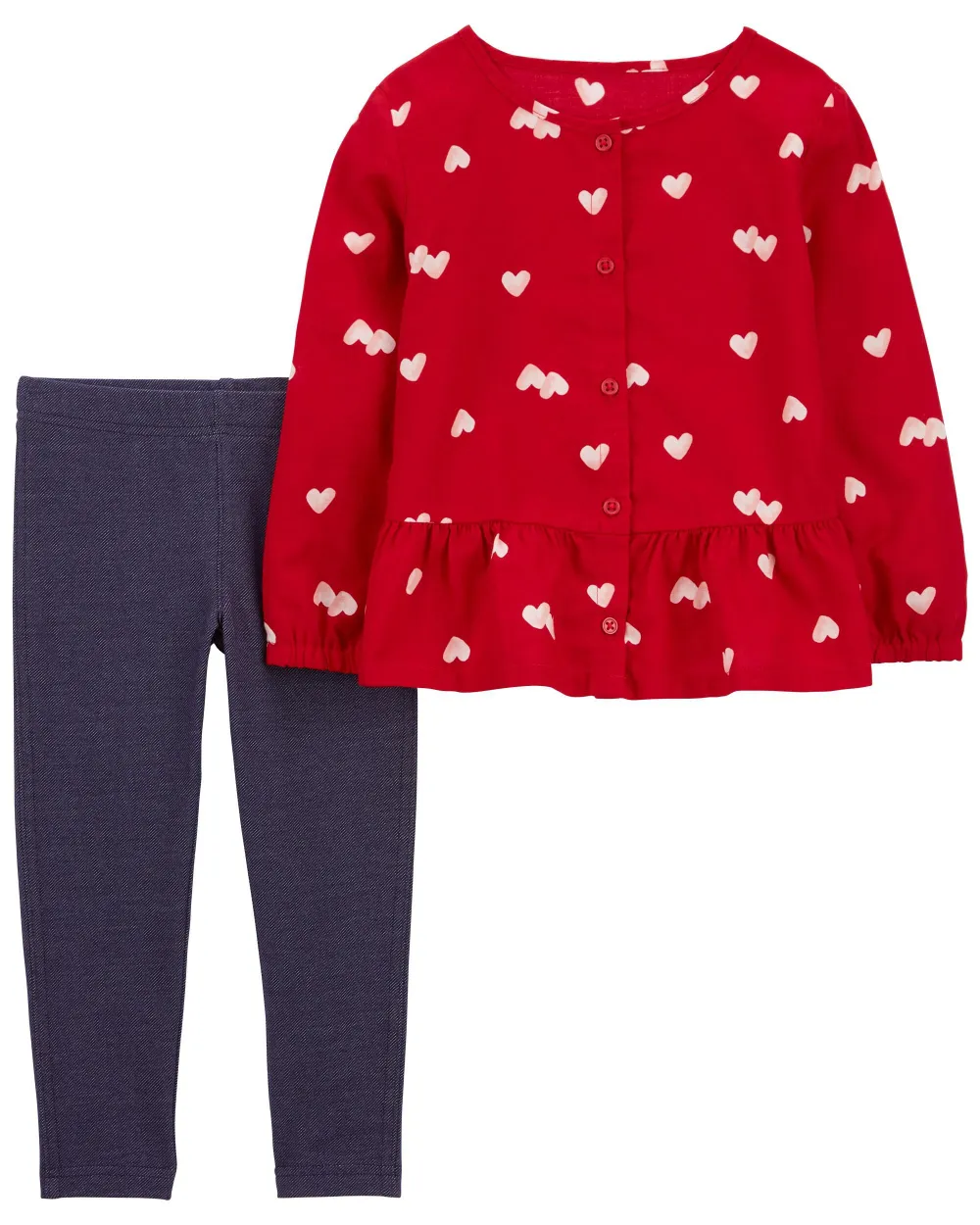 Made to match, this set is complete with a button-up heart tee and a pair of easy on knit denim leggings.