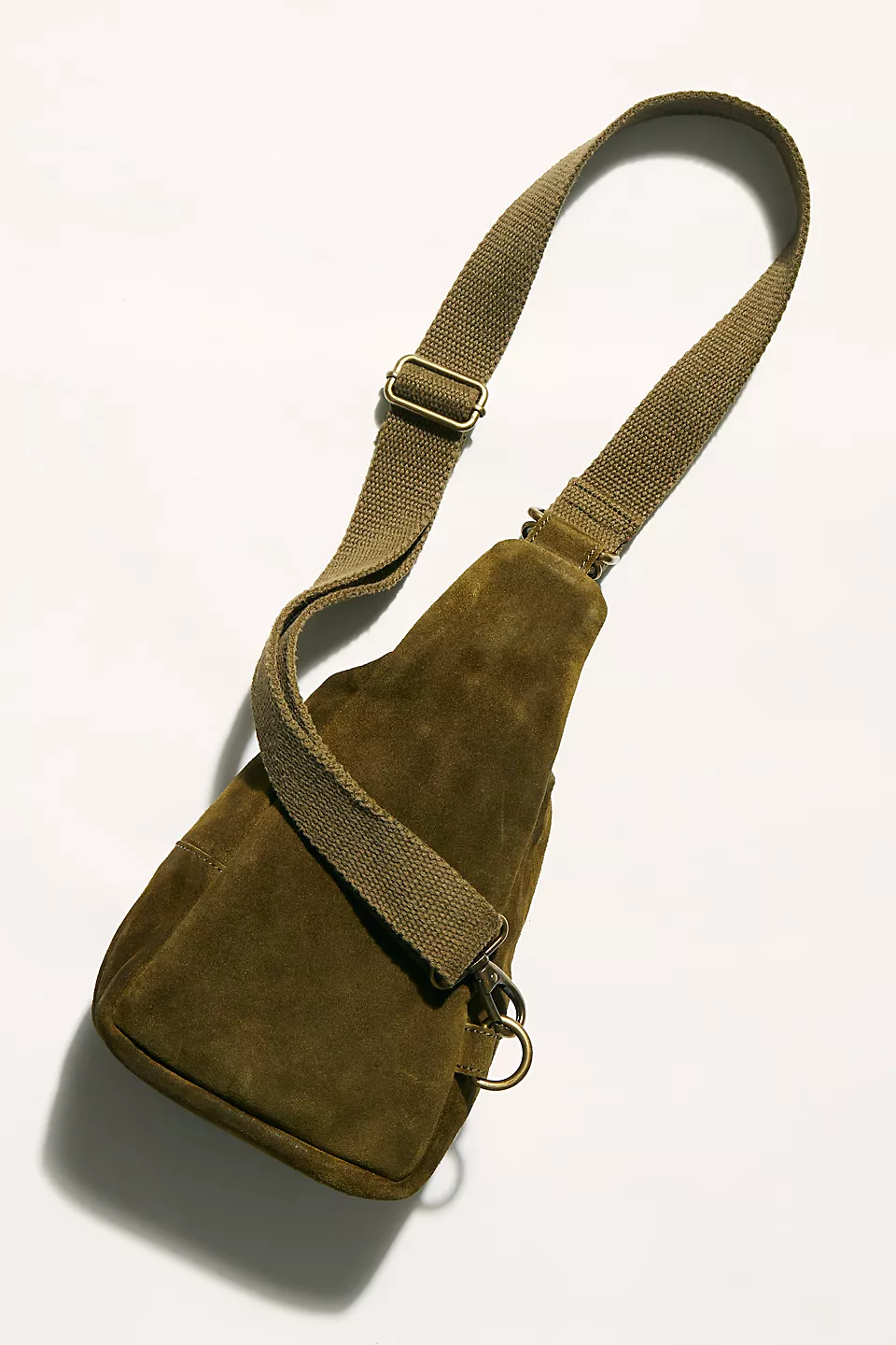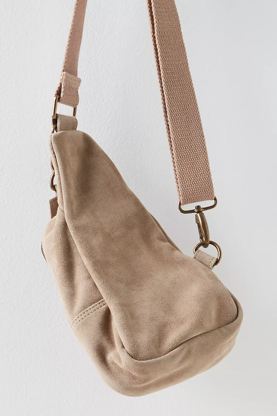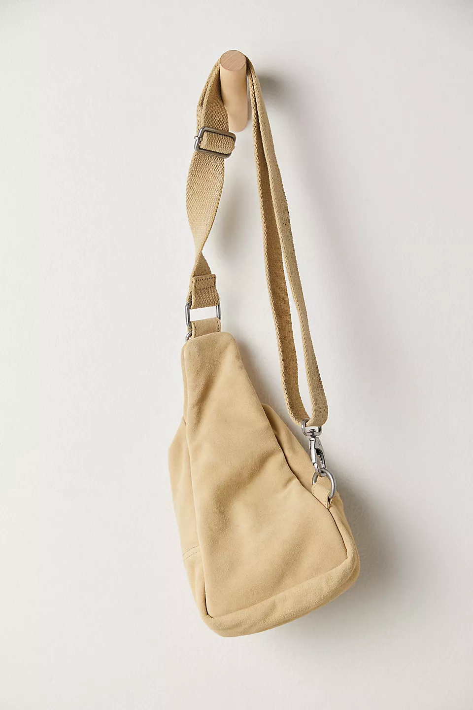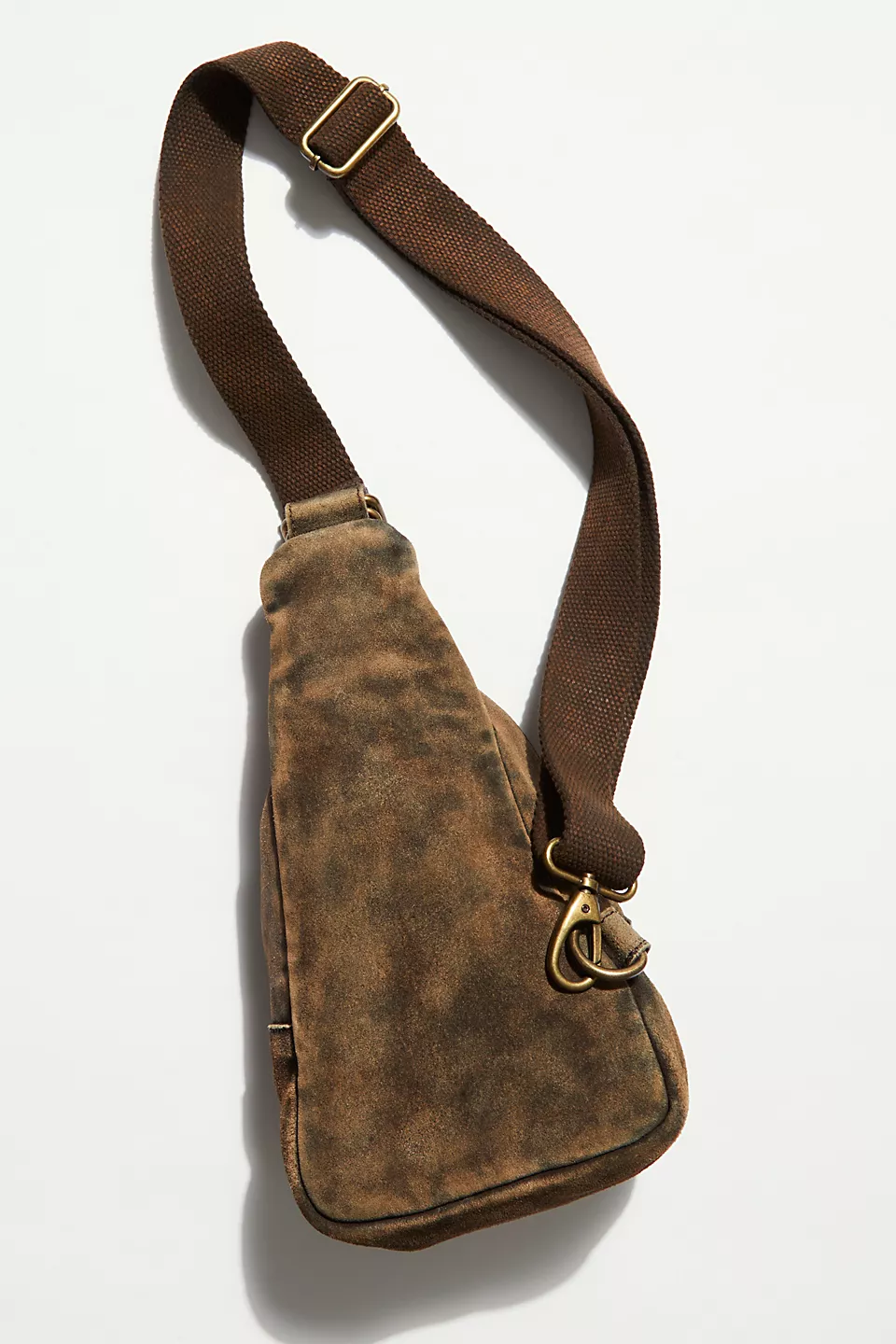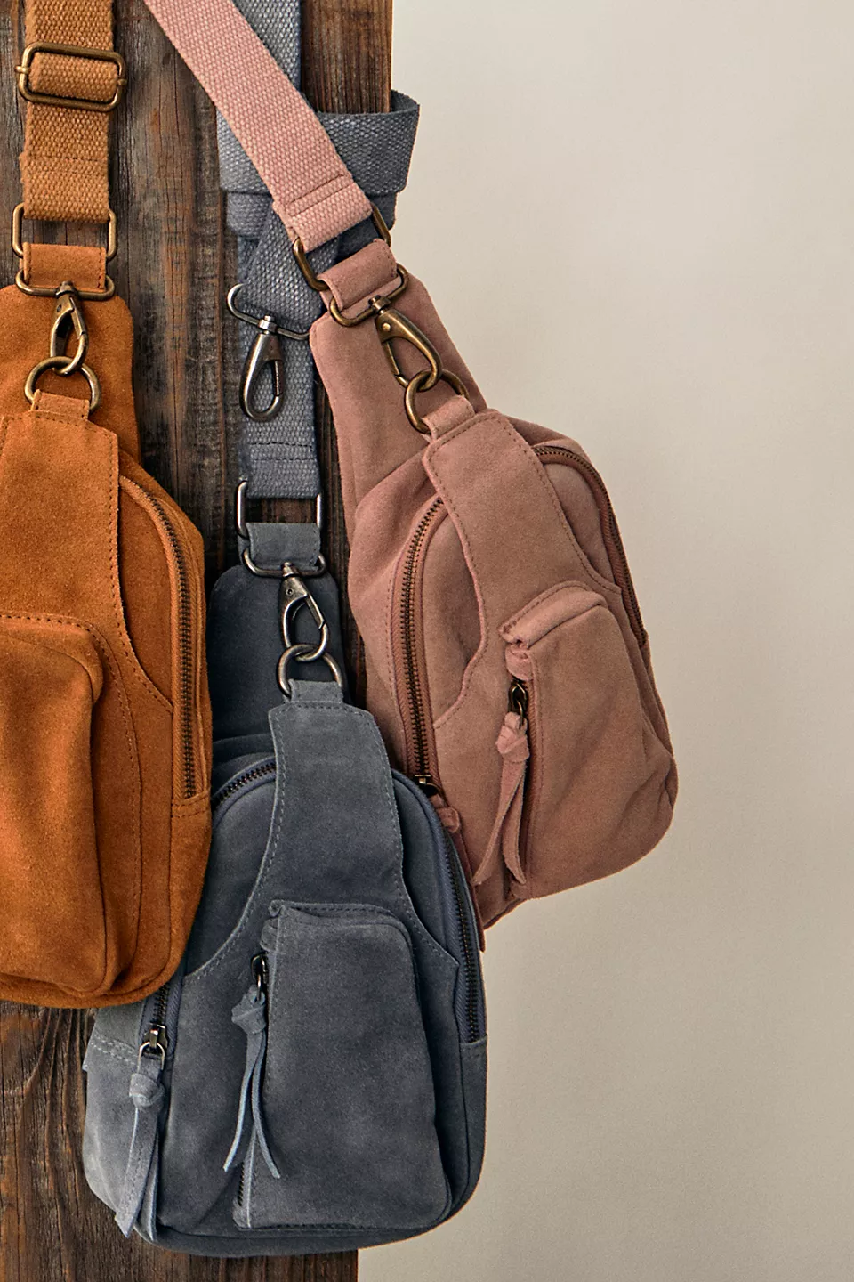 Shoulder the load with an of-the-moment sling bag, featured in a soft, velvety suede that is intentionally hand-finished.