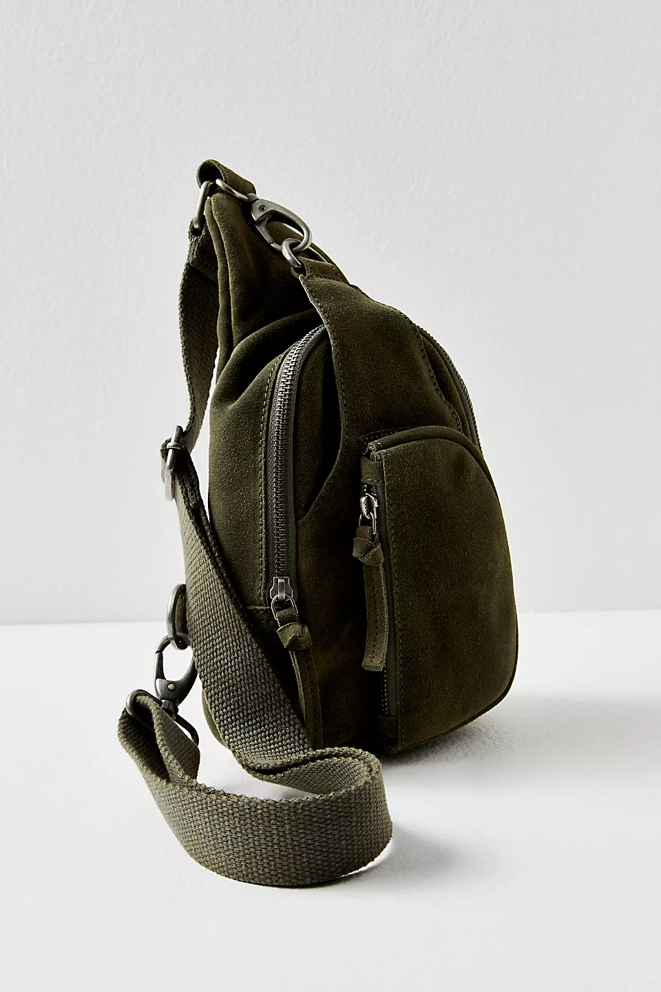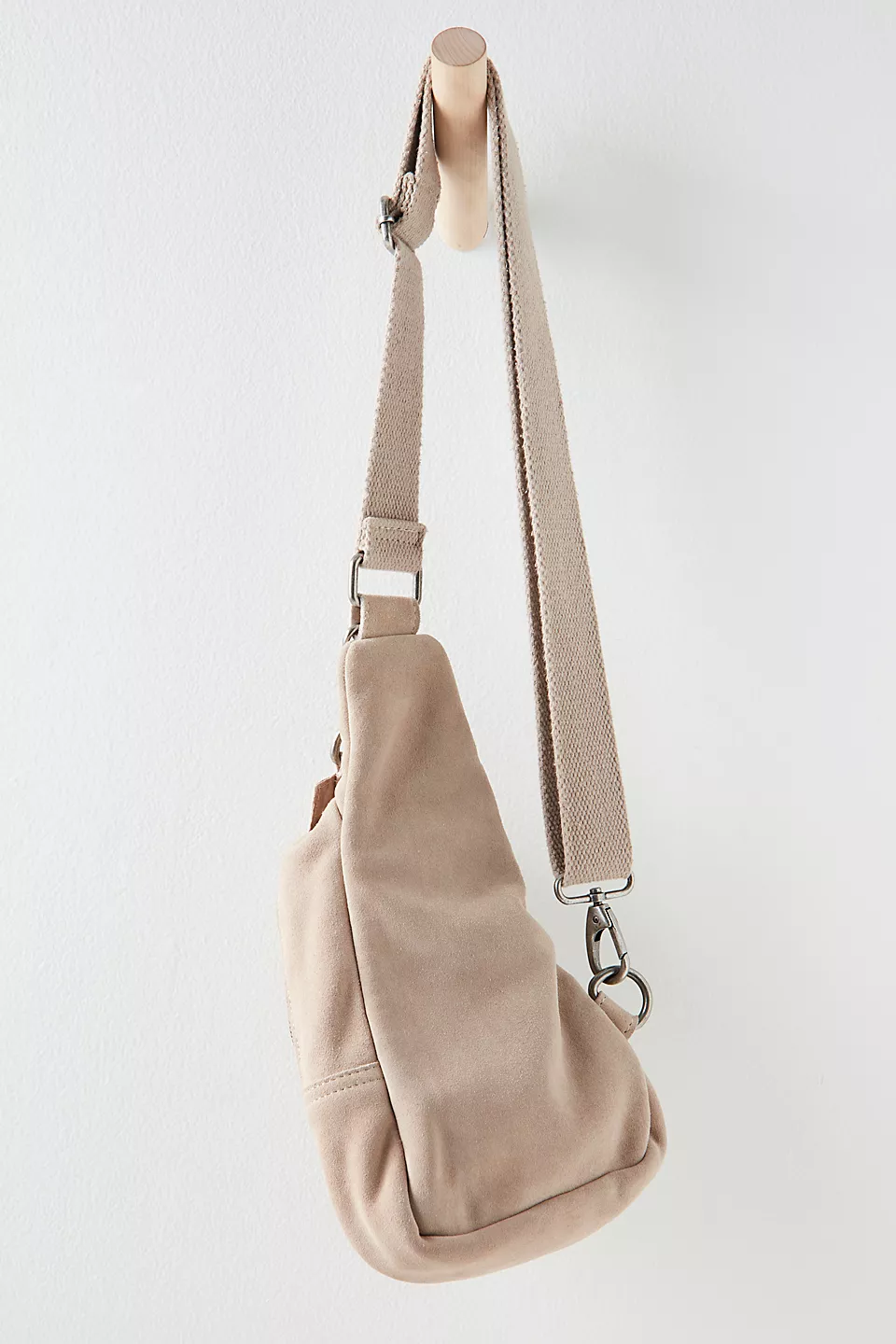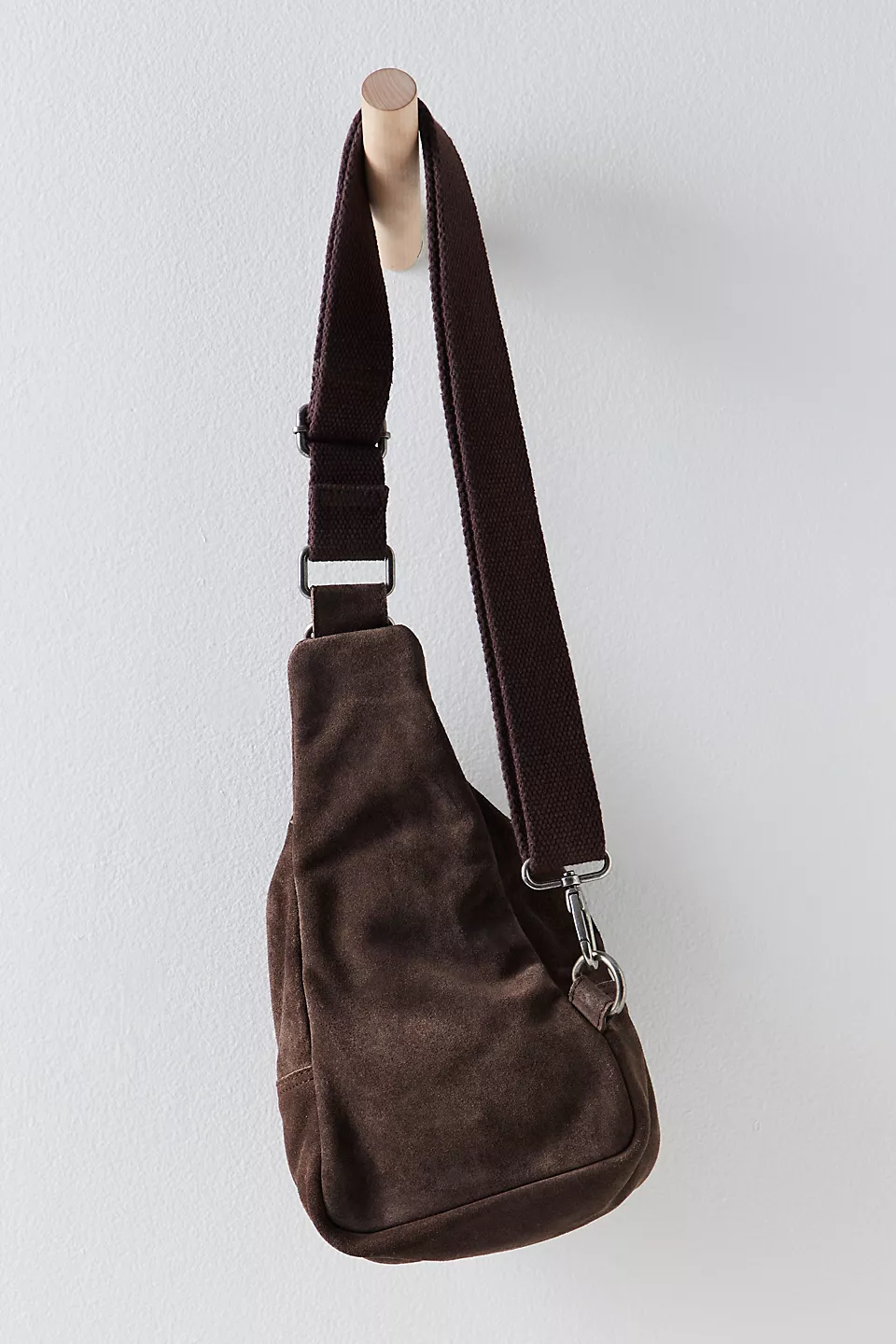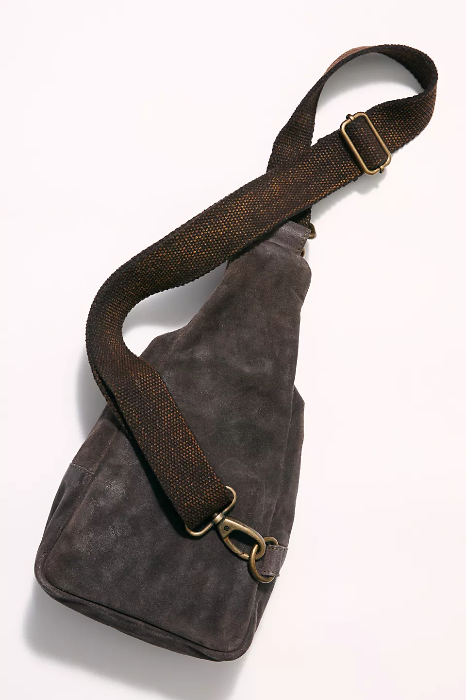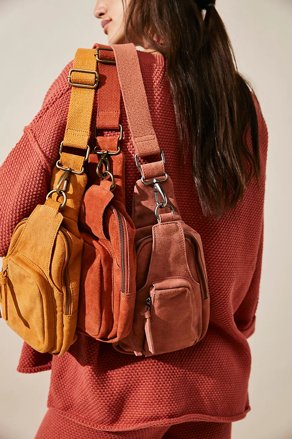 Shoulder the load with an of-the-moment sling bag, featured in a soft, velvety suede that is intentionally hand-finished.
