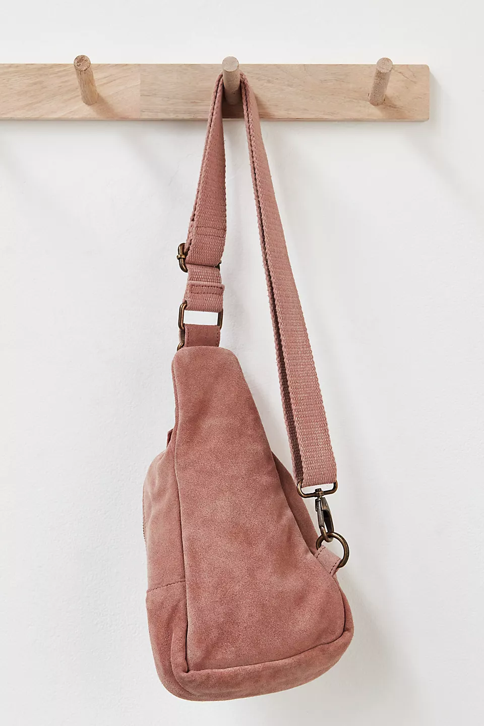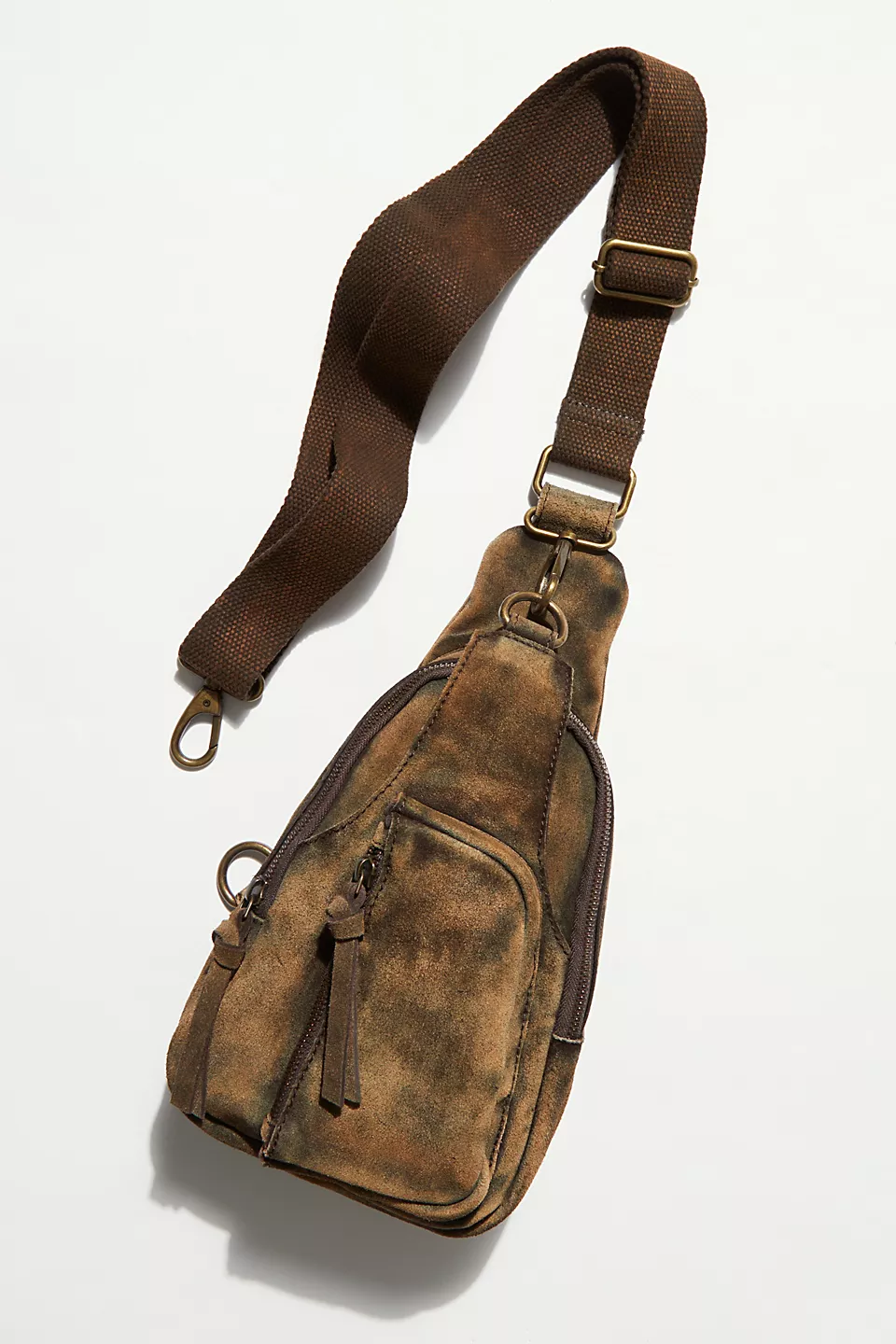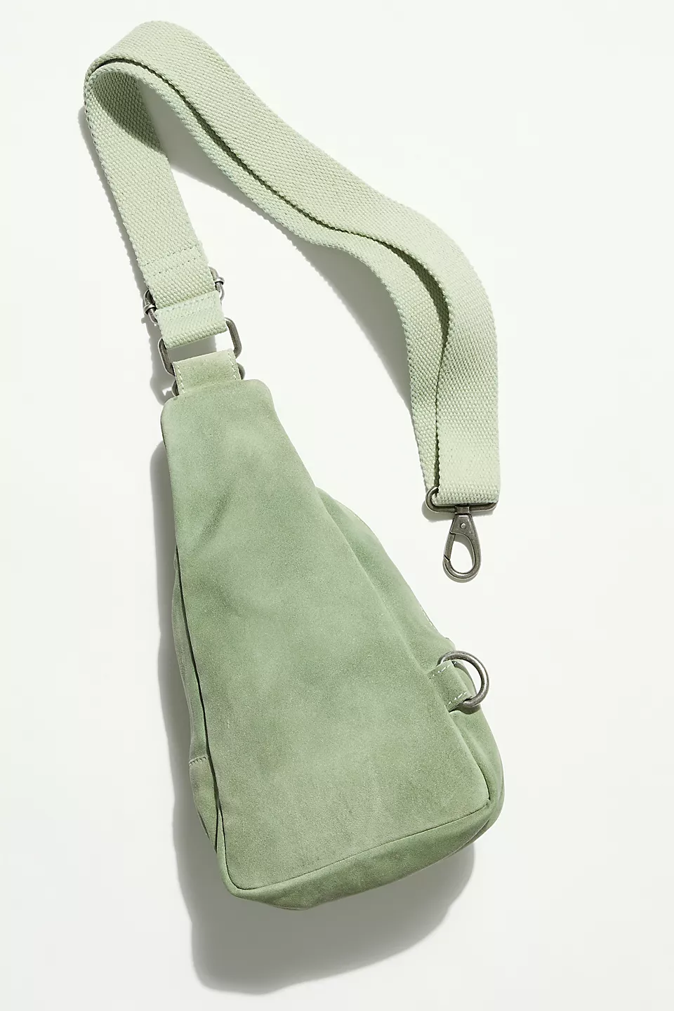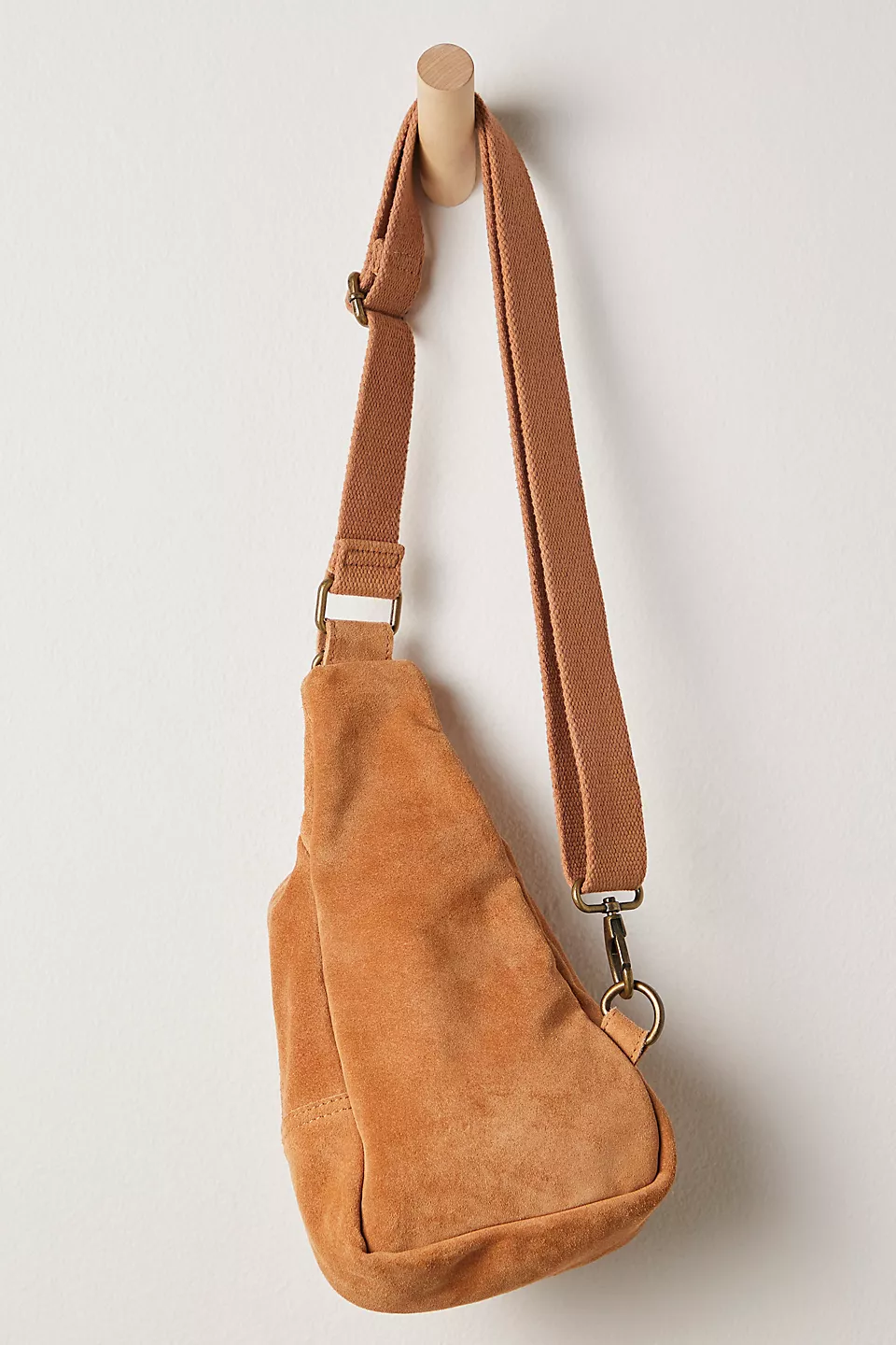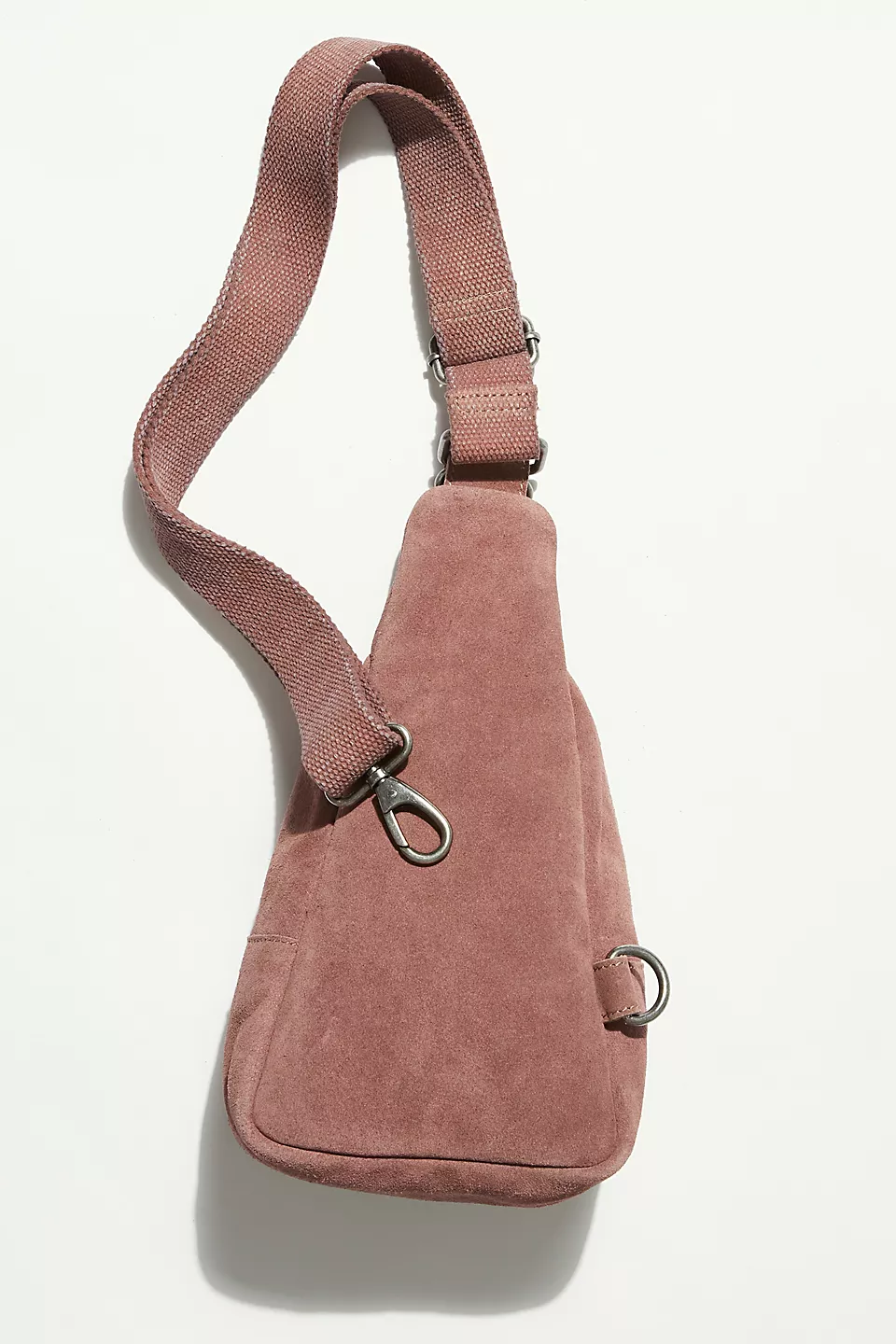 Shoulder the load with an of-the-moment sling bag, featured in a soft, velvety suede that is intentionally hand-finished.