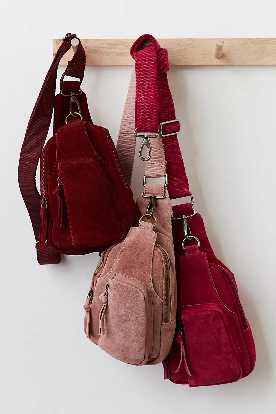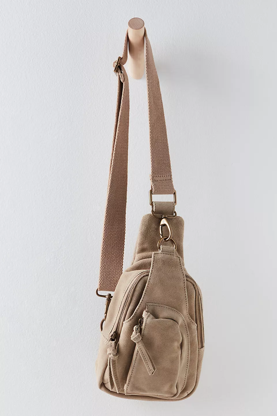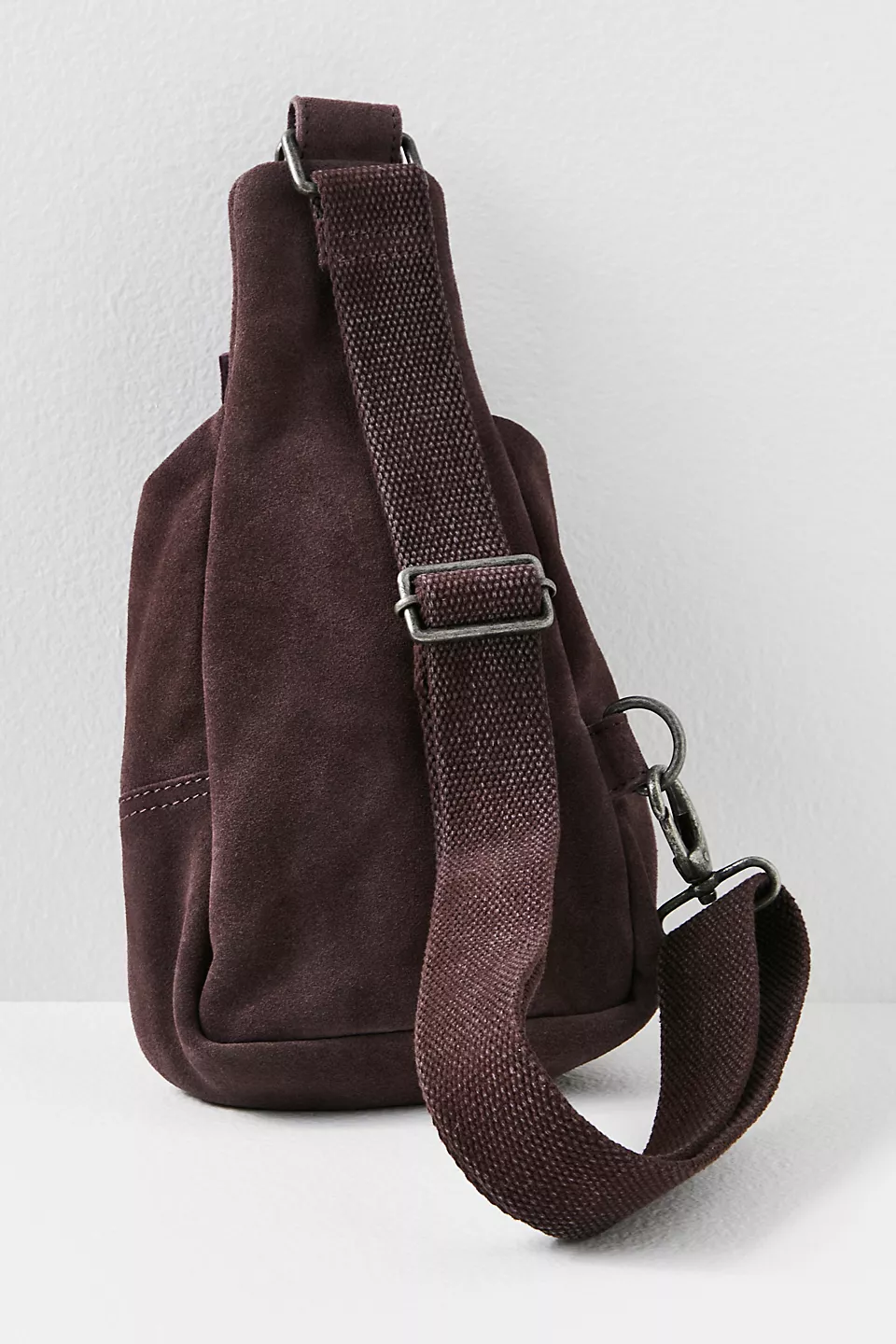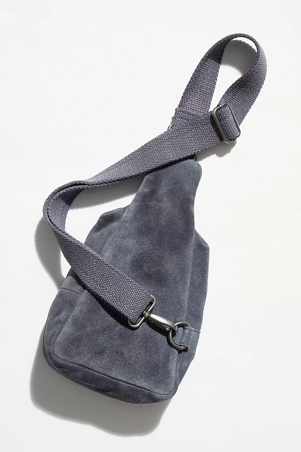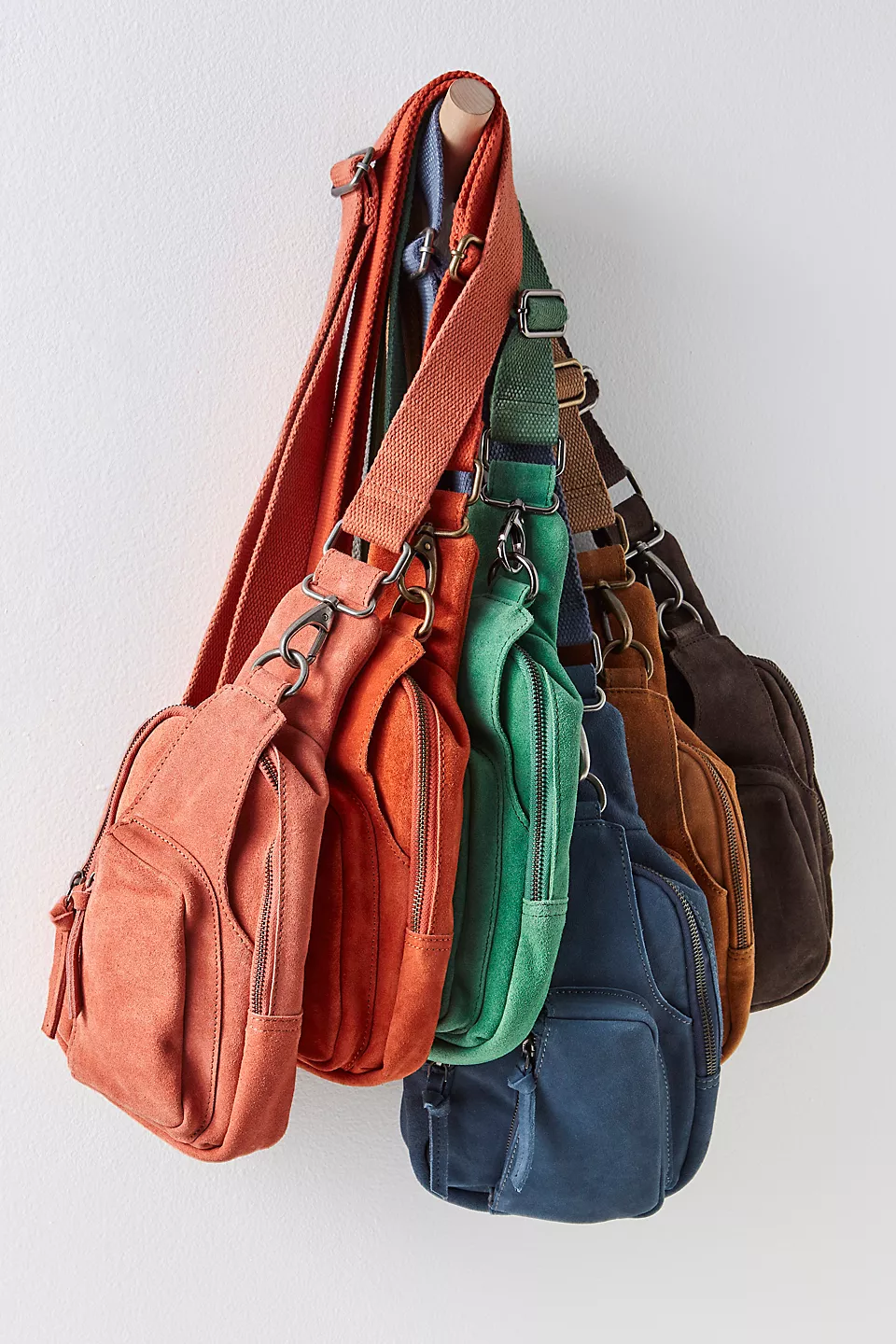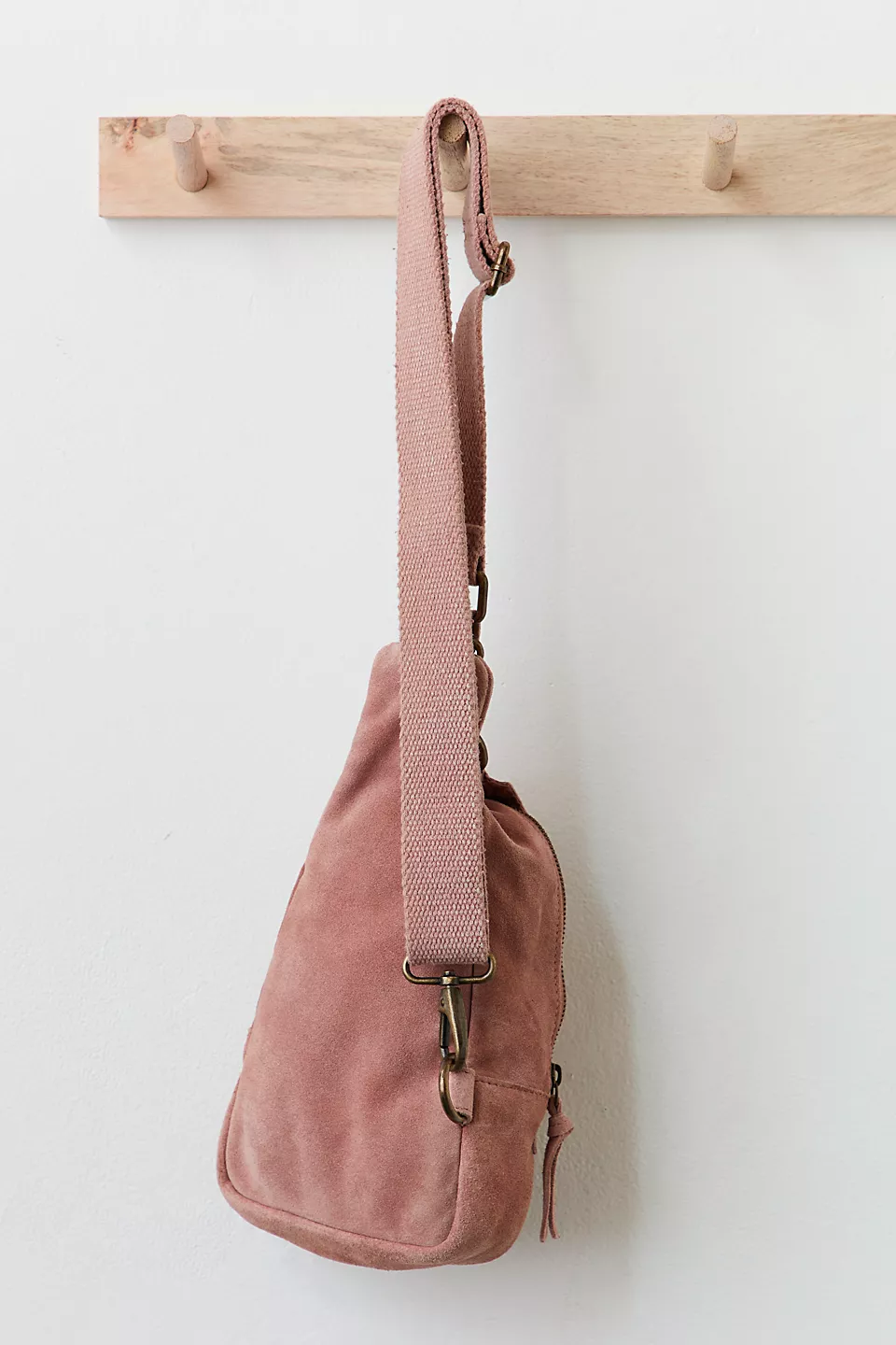 Shoulder the load with an of-the-moment sling bag, featured in a soft, velvety suede that is intentionally hand-finished.