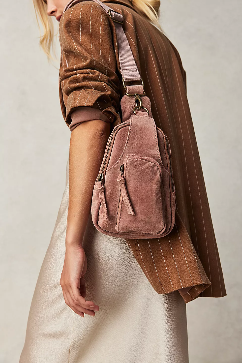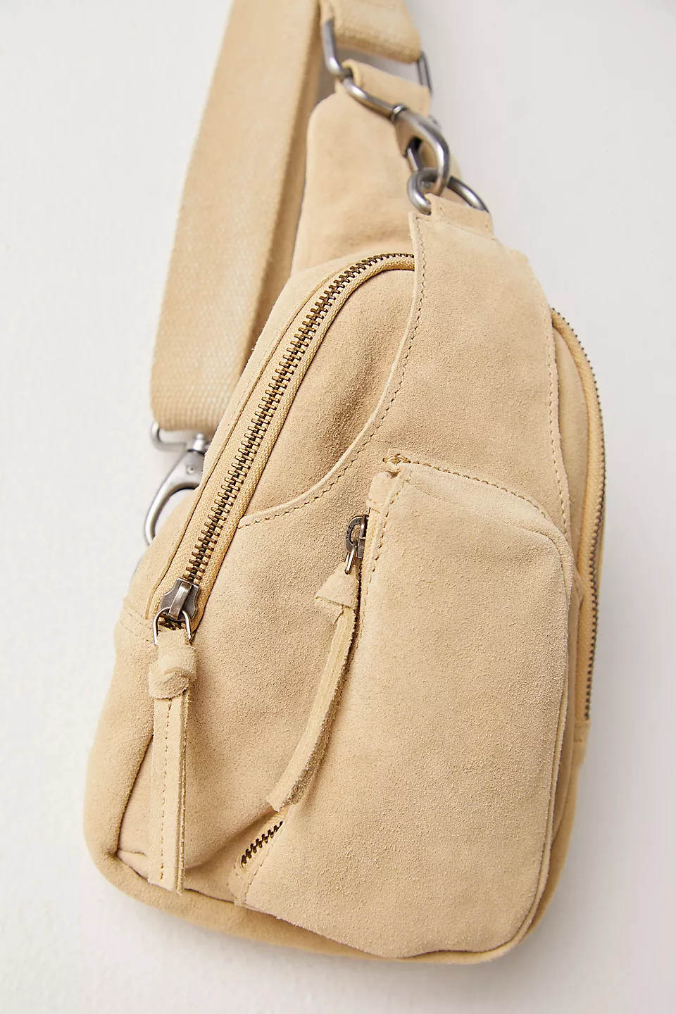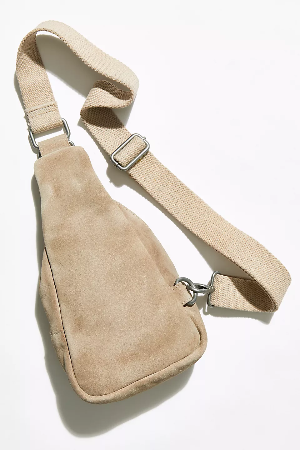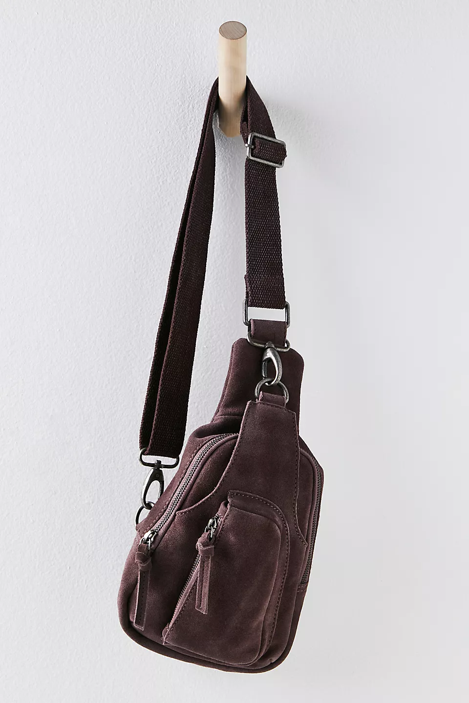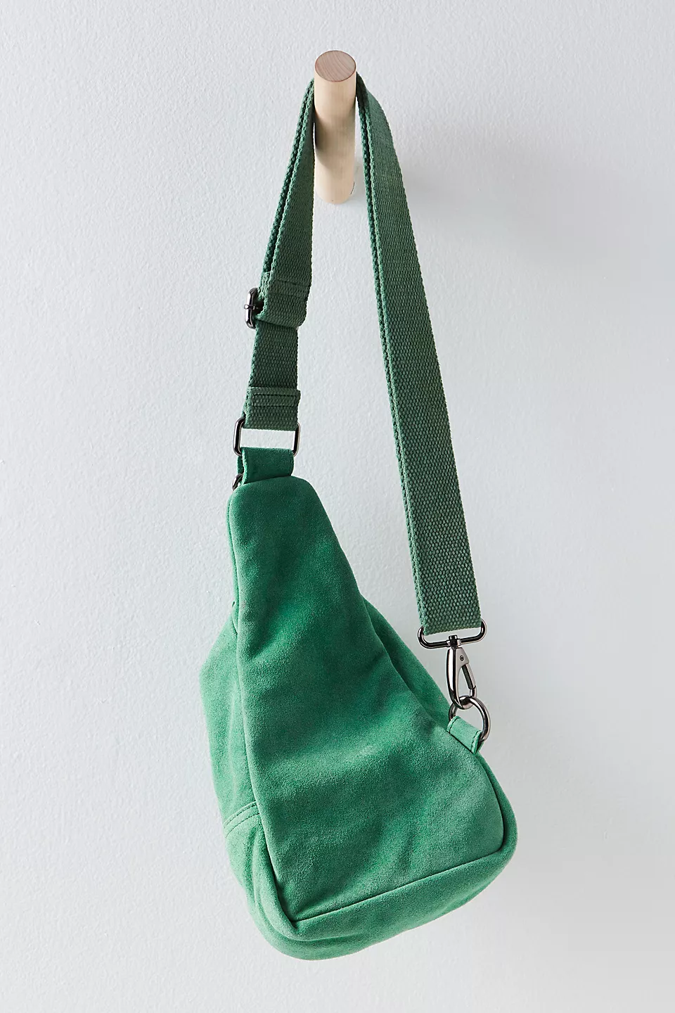 Shoulder the load with an of-the-moment sling bag, featured in a soft, velvety suede that is intentionally hand-finished.