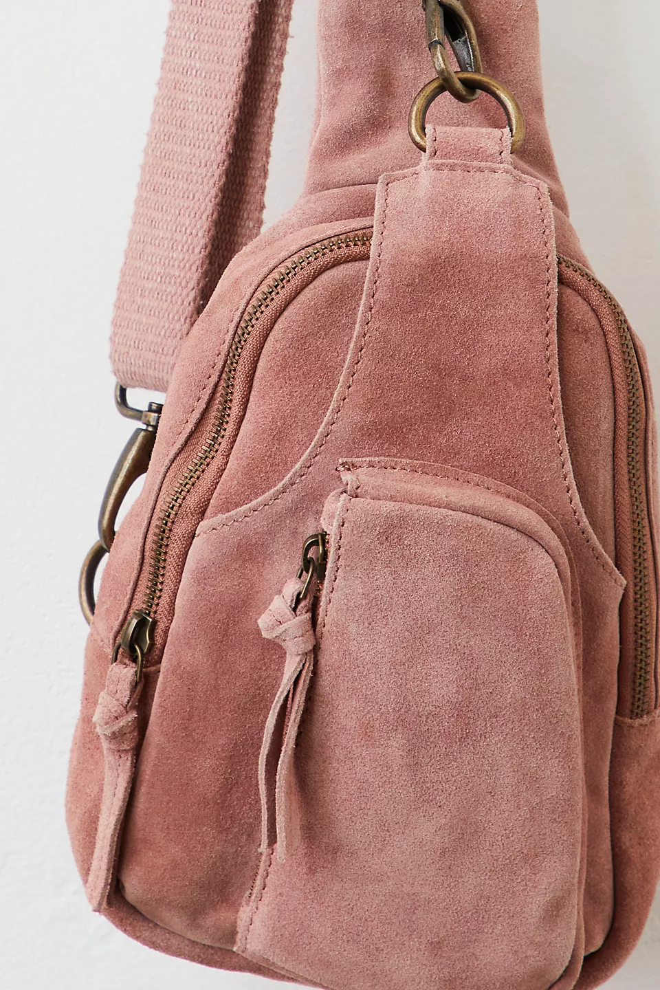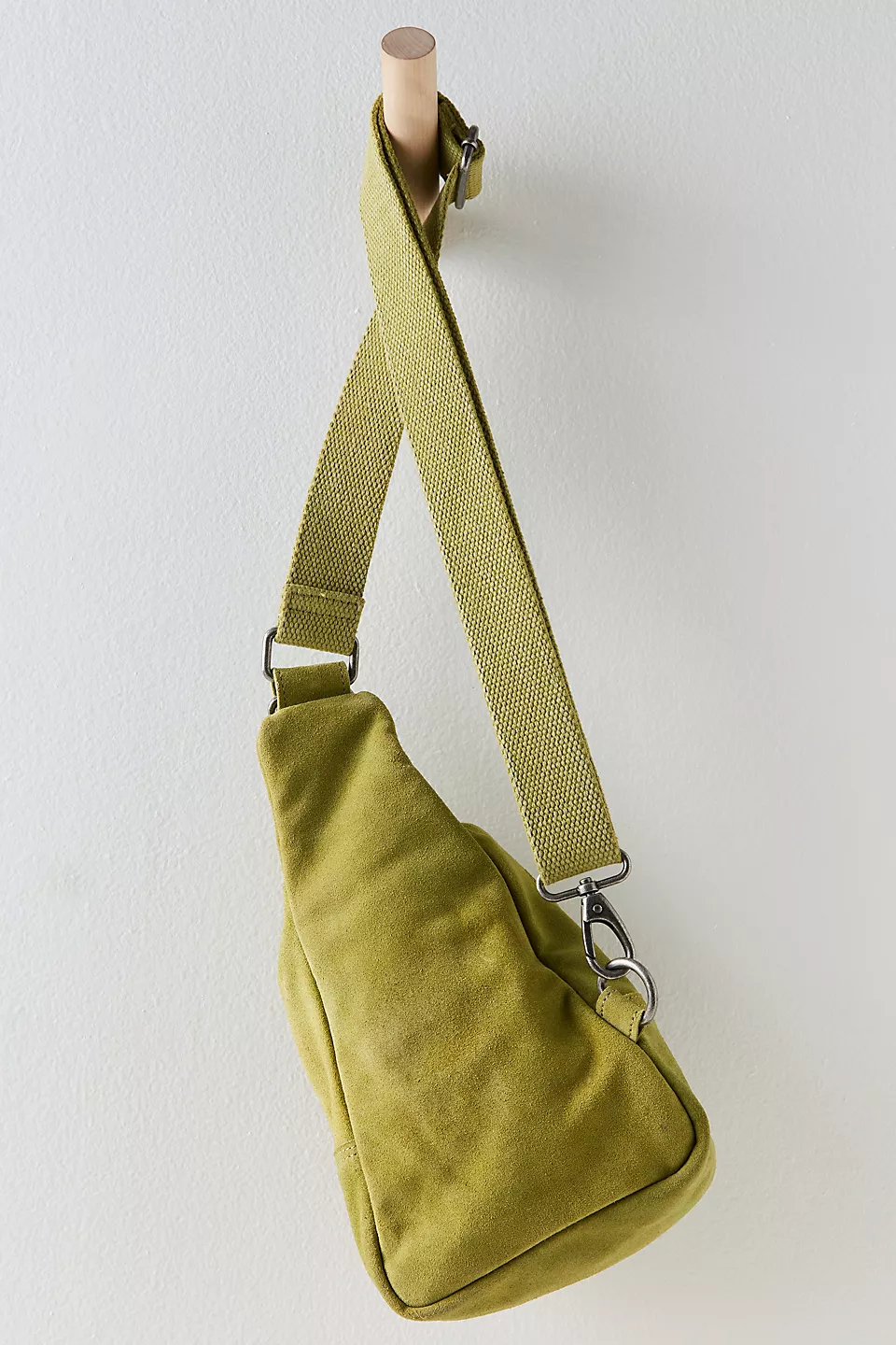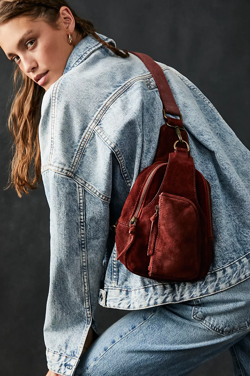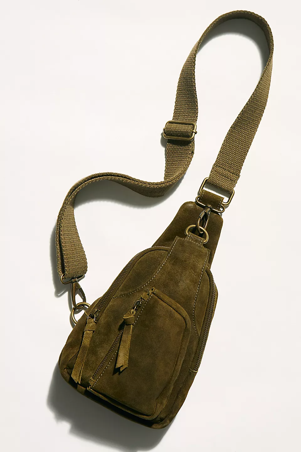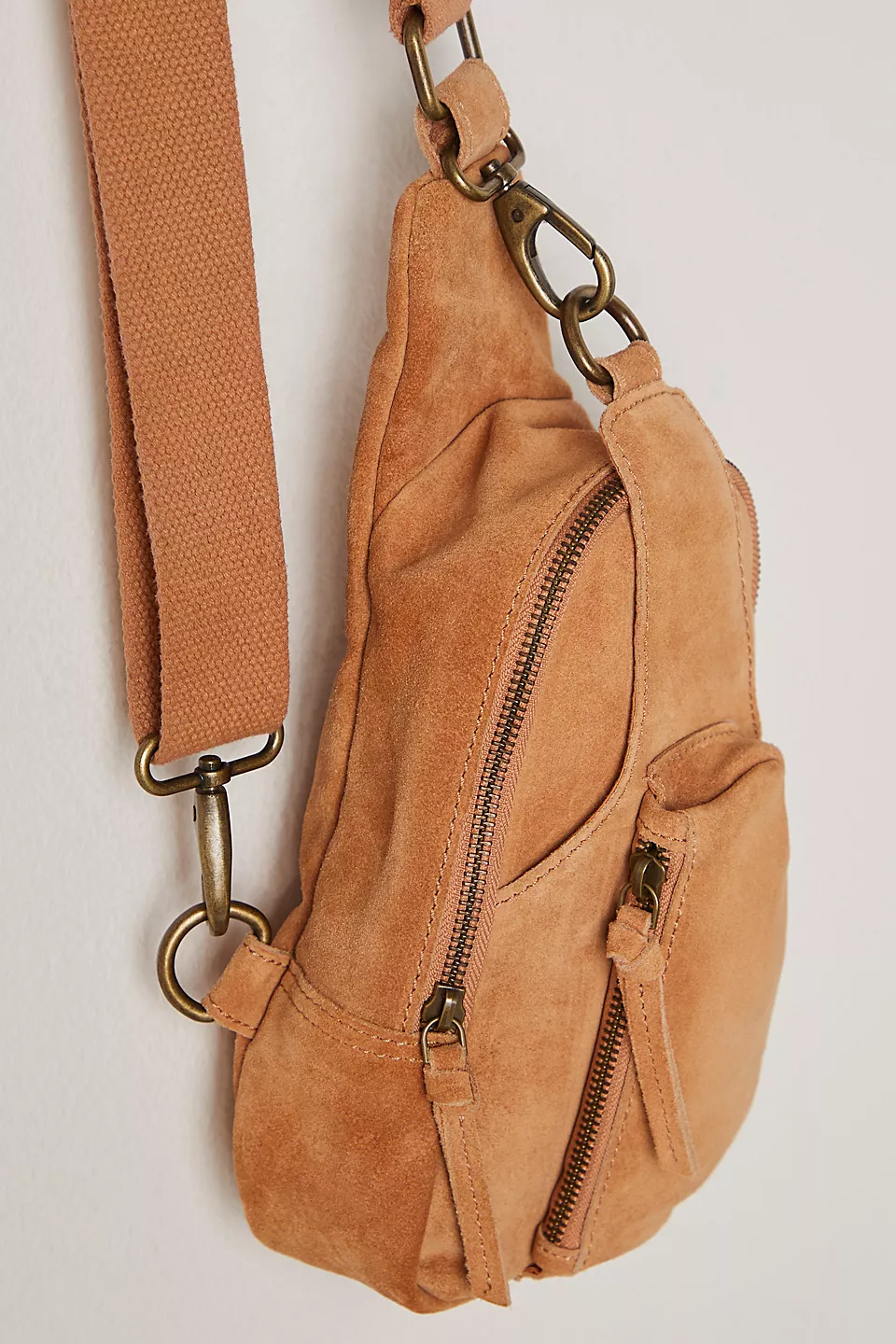 Shoulder the load with an of-the-moment sling bag, featured in a soft, velvety suede that is intentionally hand-finished.