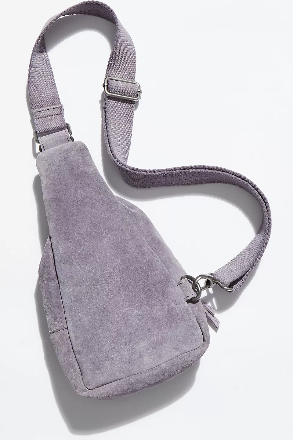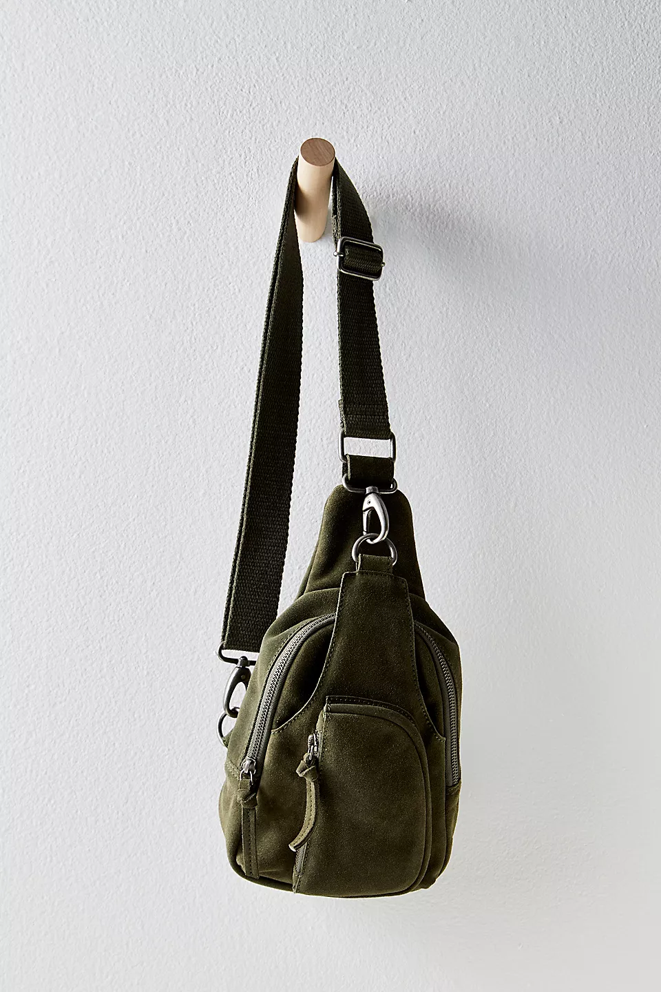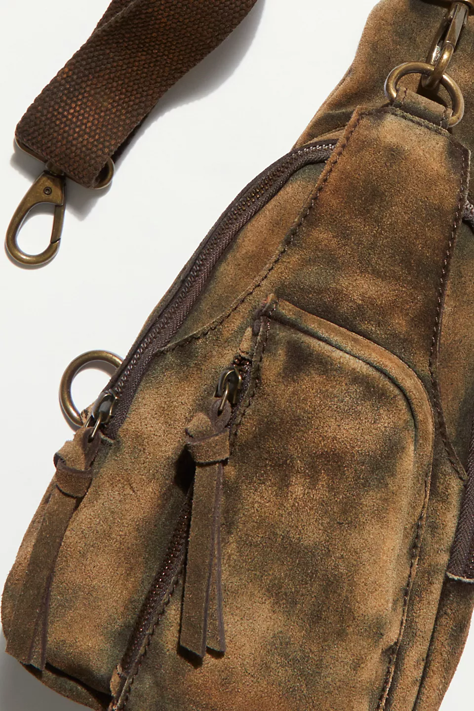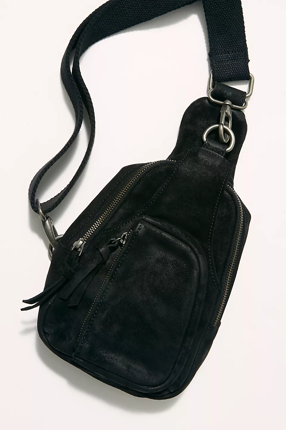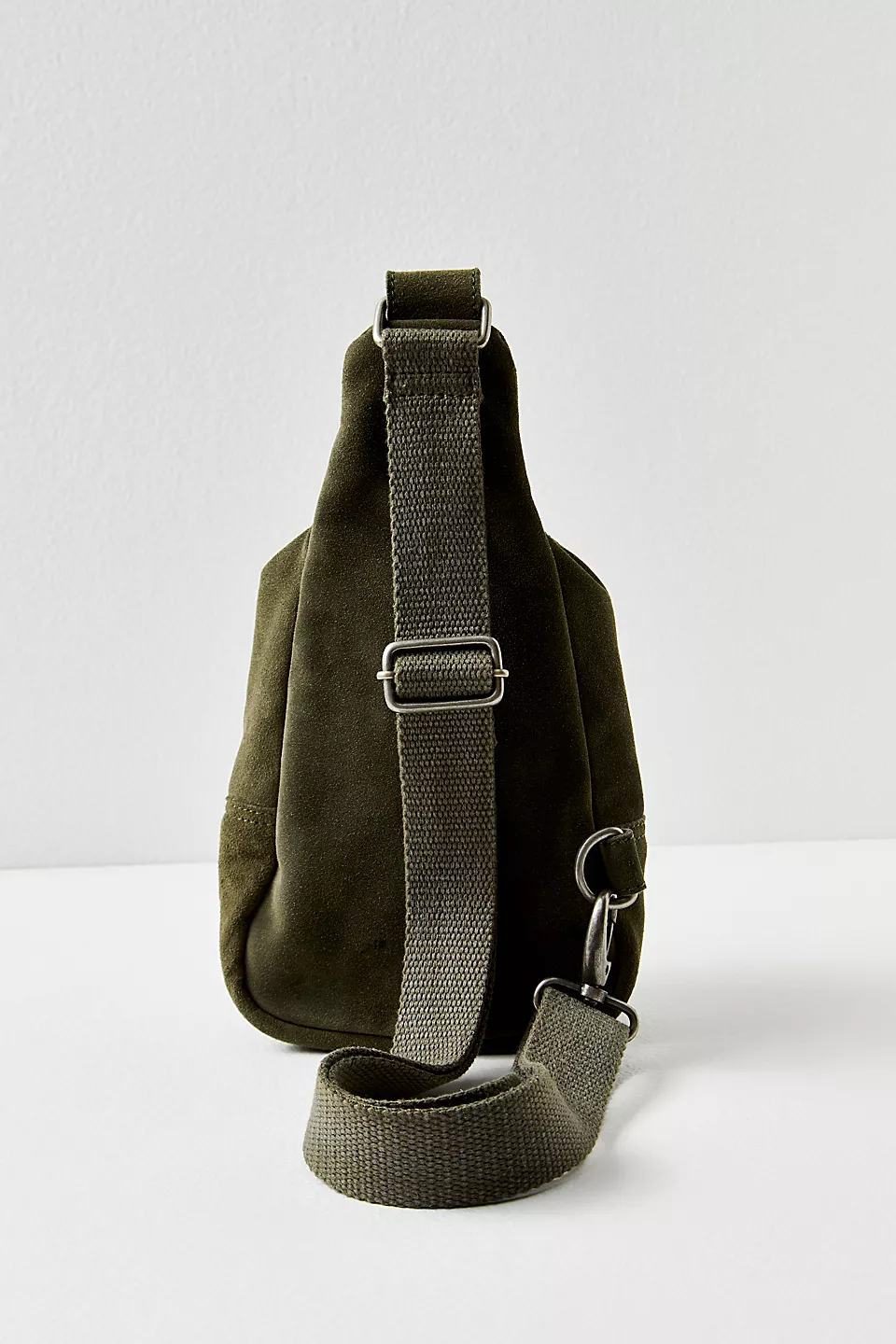 Shoulder the load with an of-the-moment sling bag, featured in a soft, velvety suede that is intentionally hand-finished.