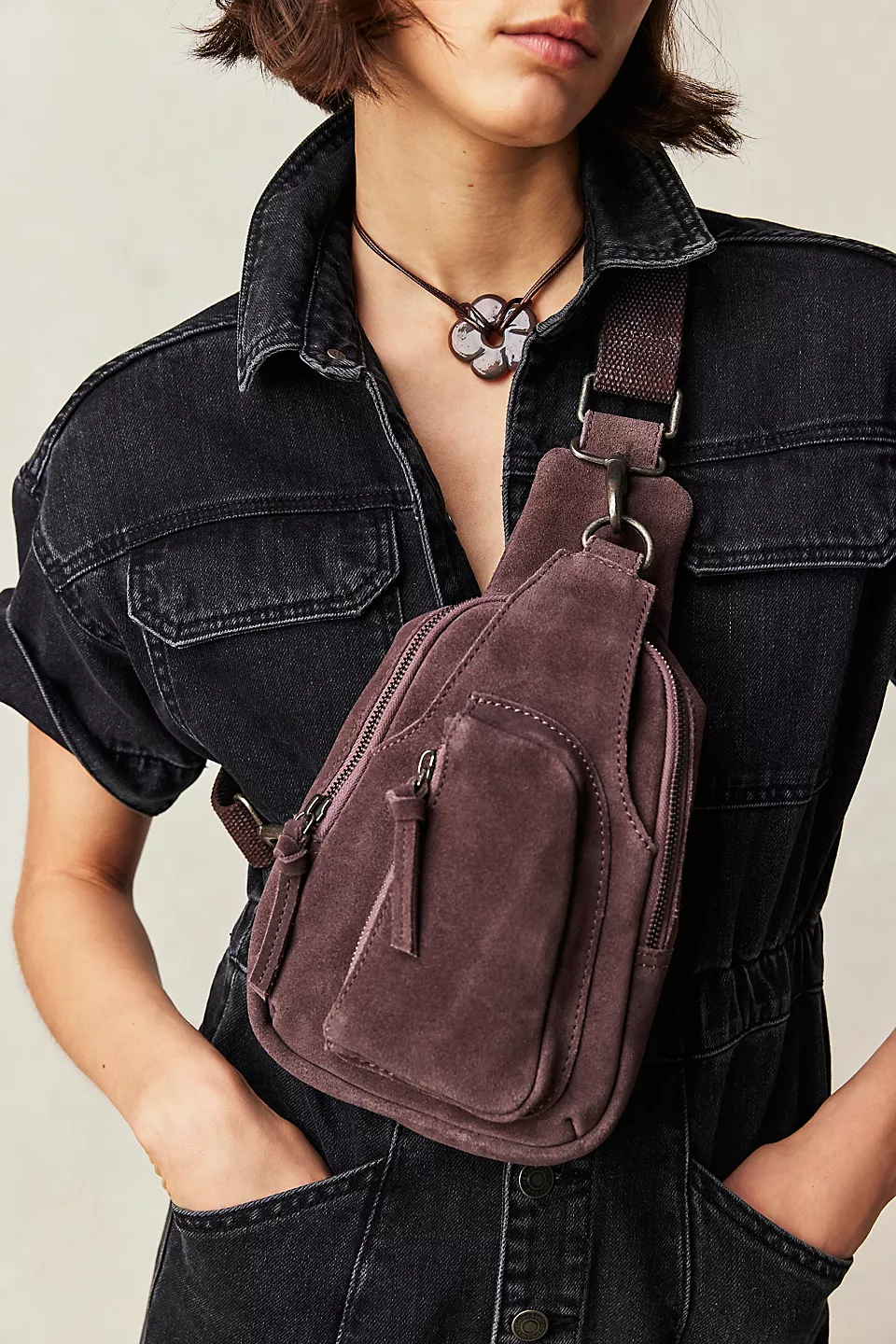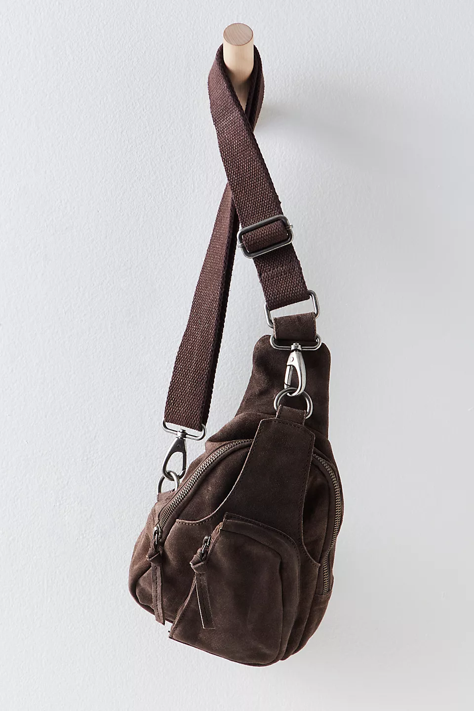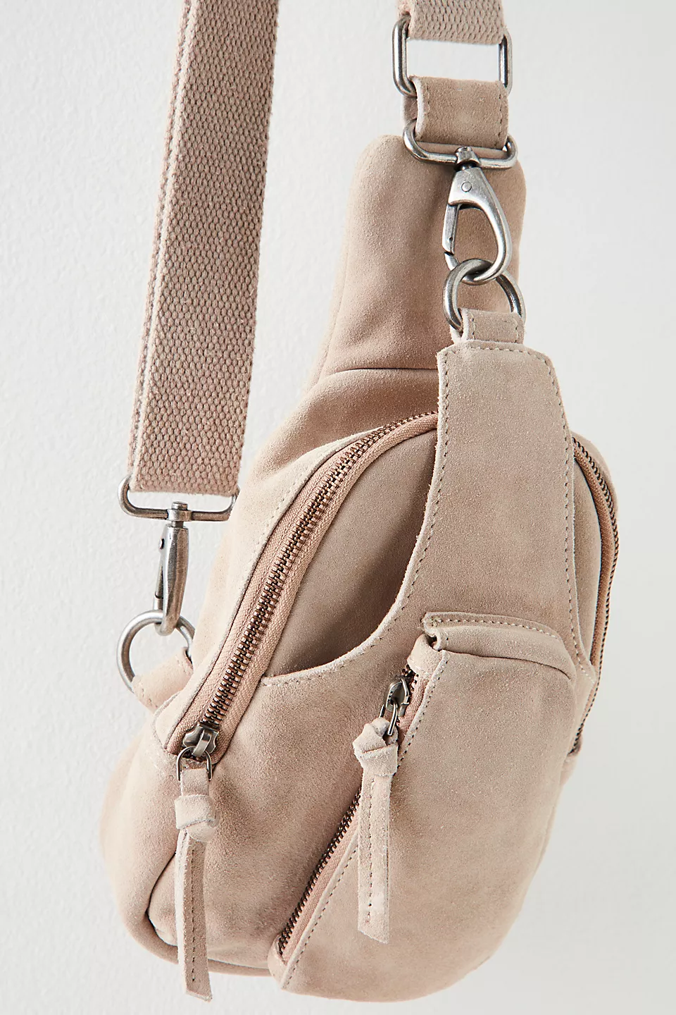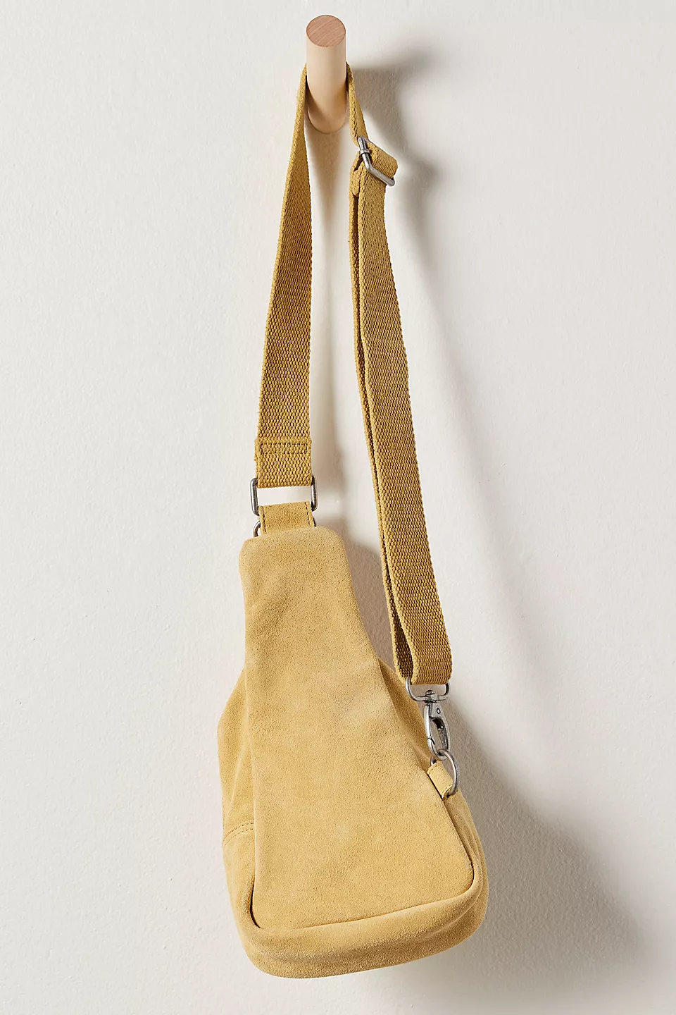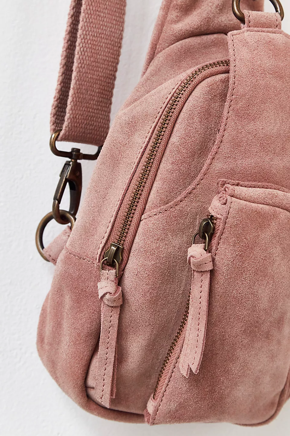 Shoulder the load with an of-the-moment sling bag, featured in a soft, velvety suede that is intentionally hand-finished.