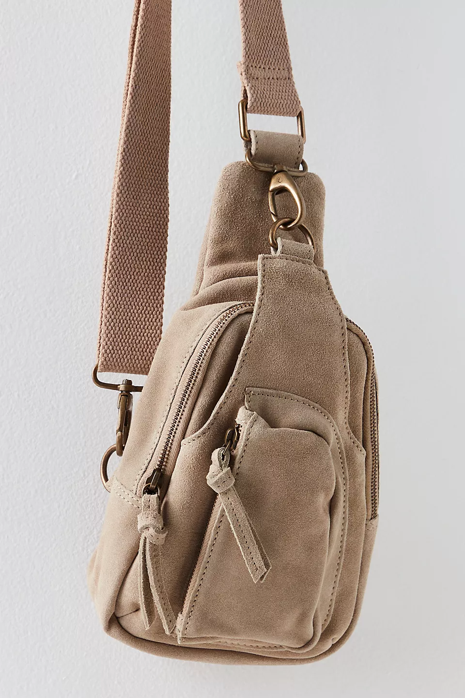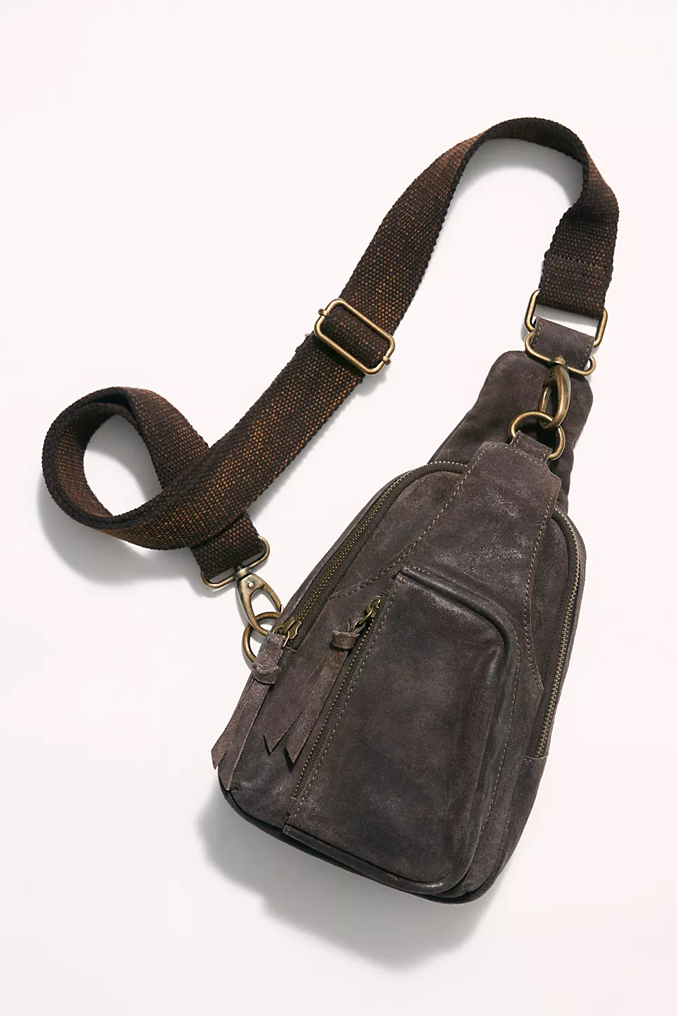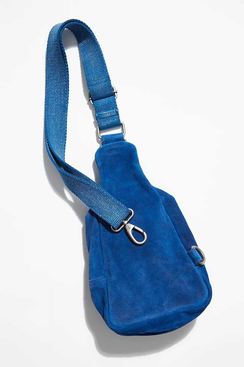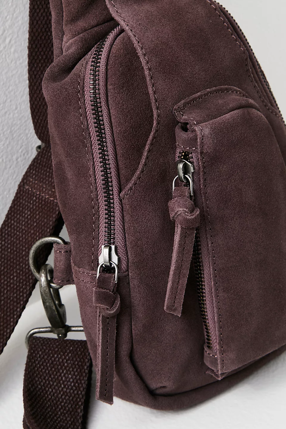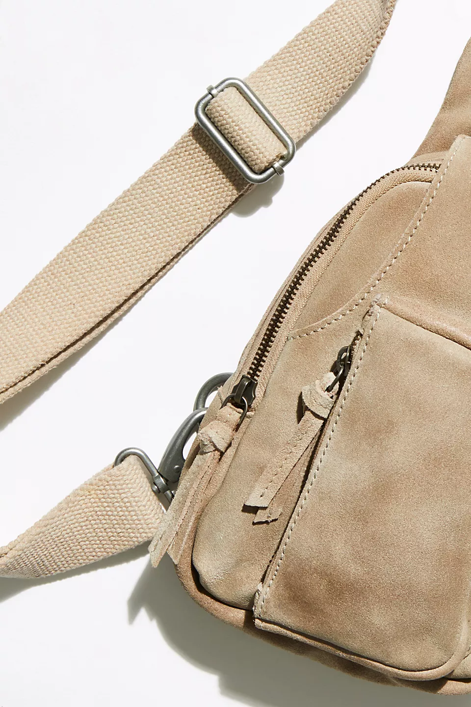 Shoulder the load with an of-the-moment sling bag, featured in a soft, velvety suede that is intentionally hand-finished.