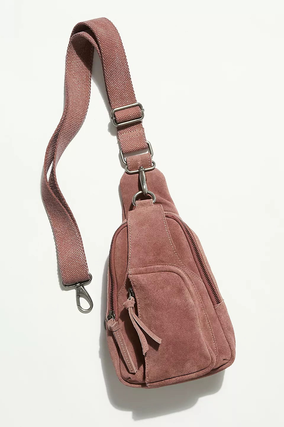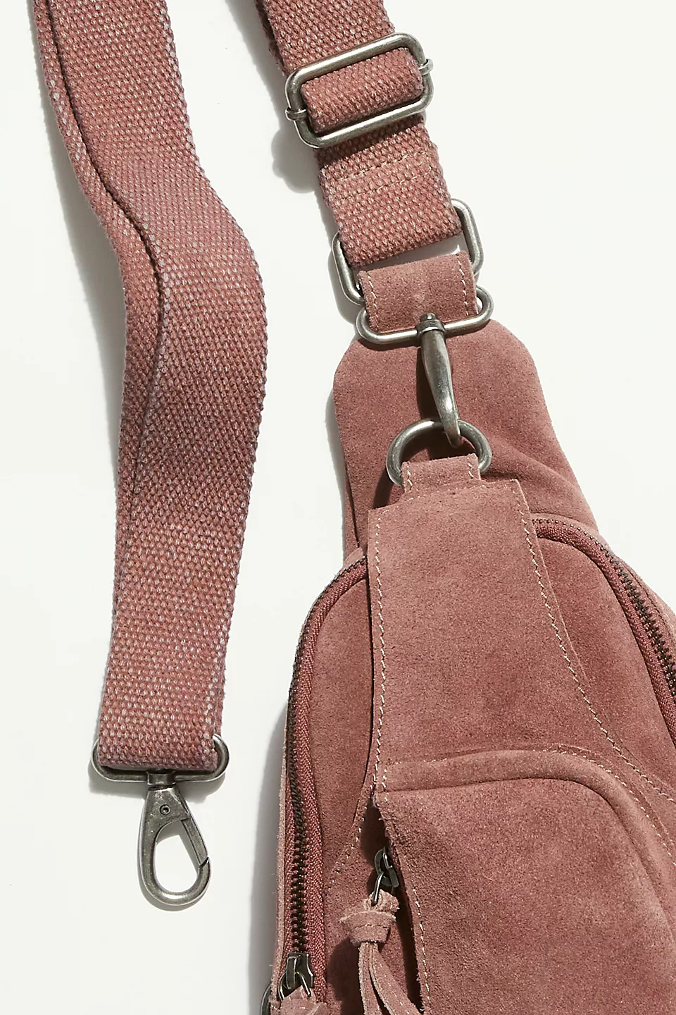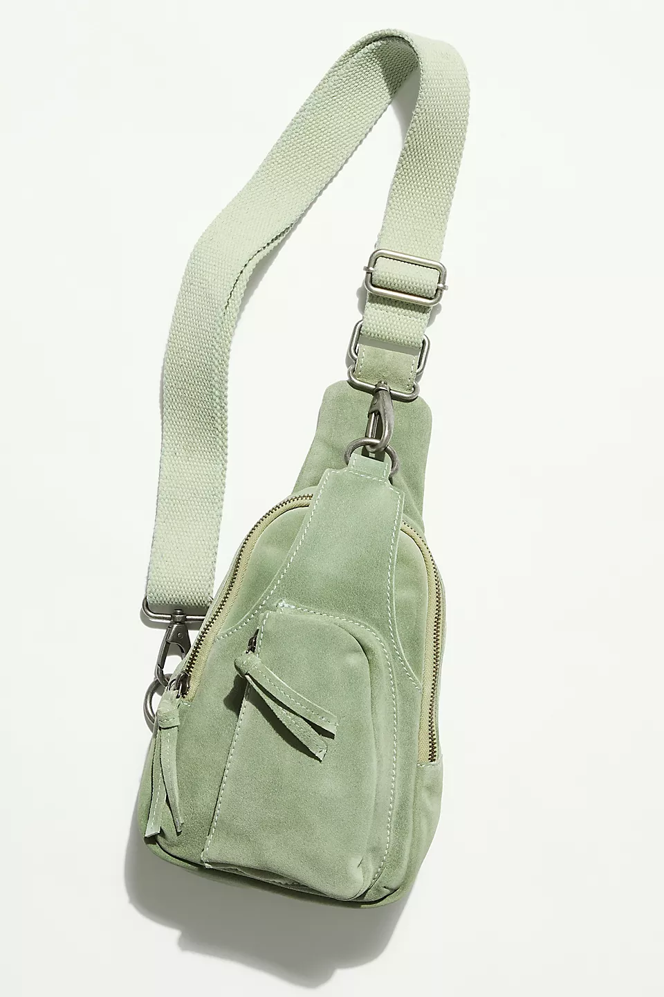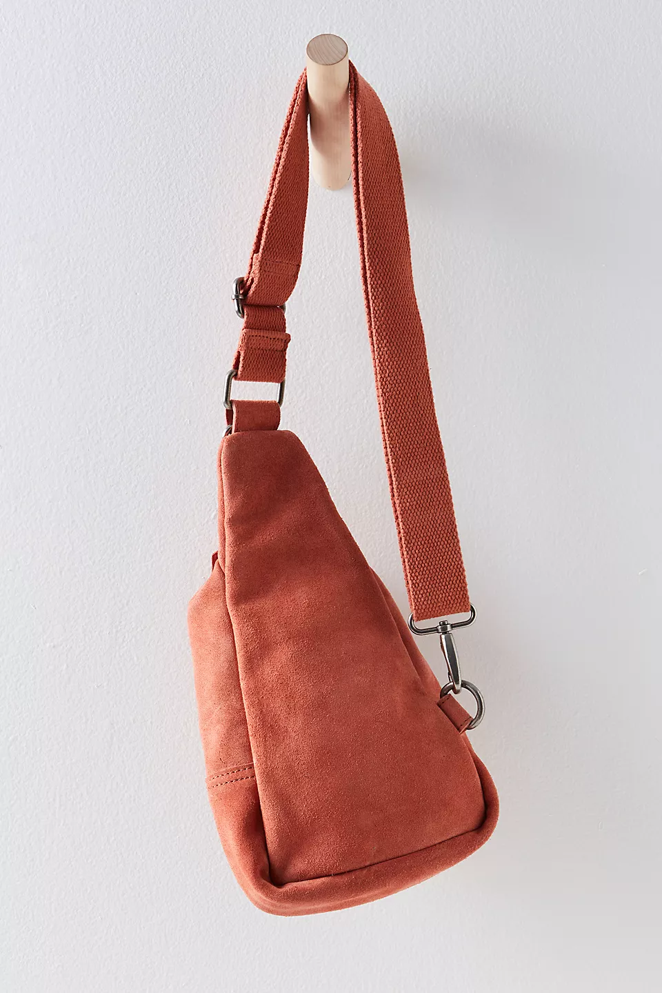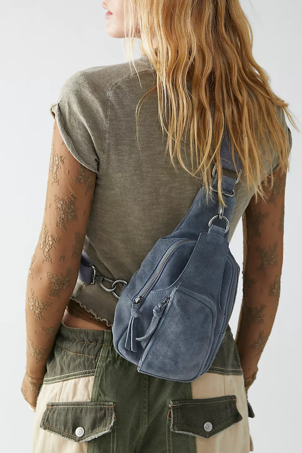 Shoulder the load with an of-the-moment sling bag, featured in a soft, velvety suede that is intentionally hand-finished.