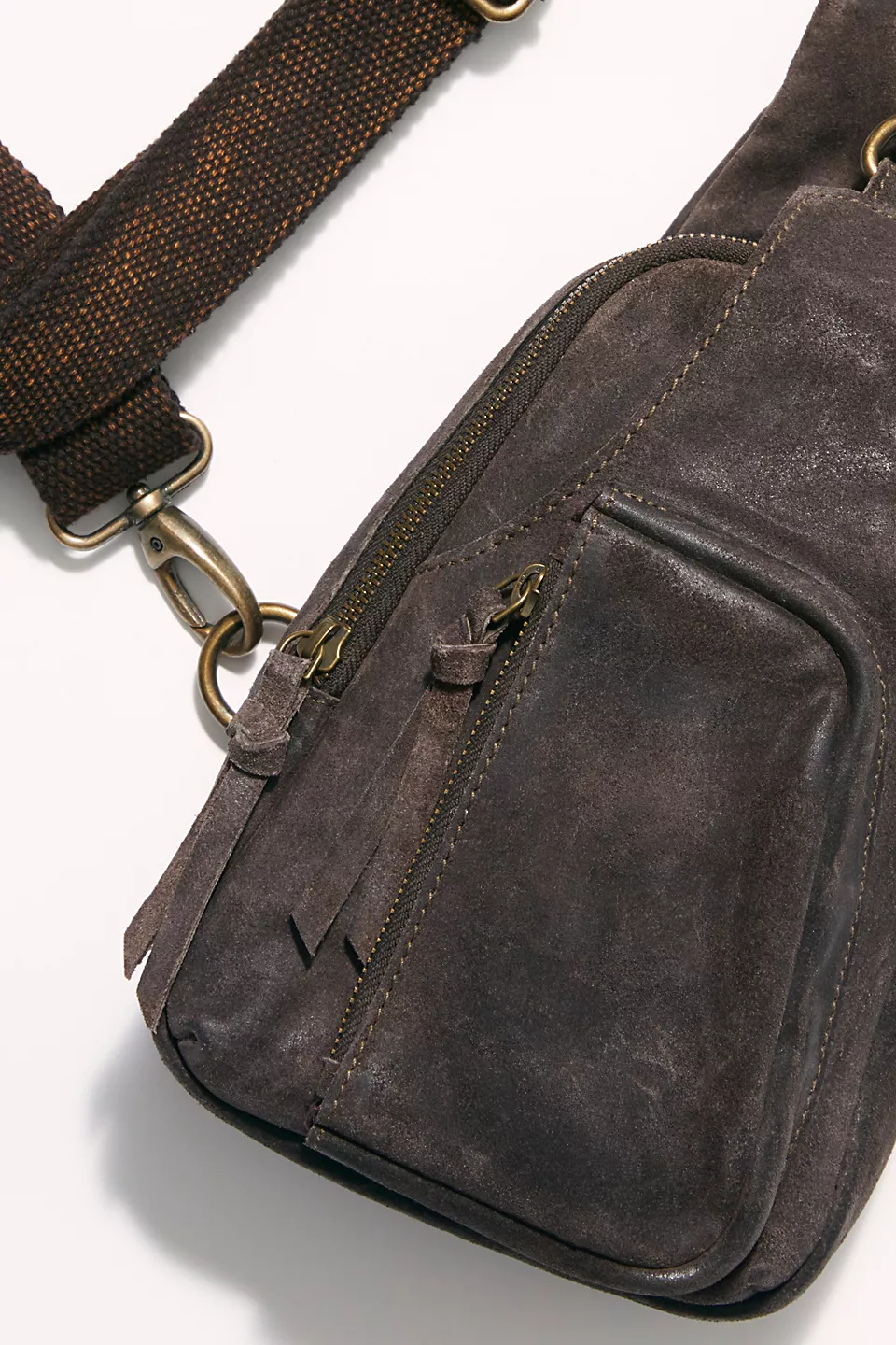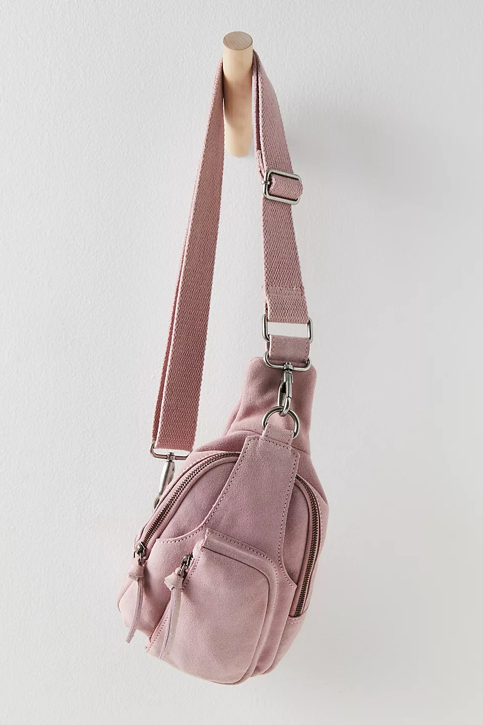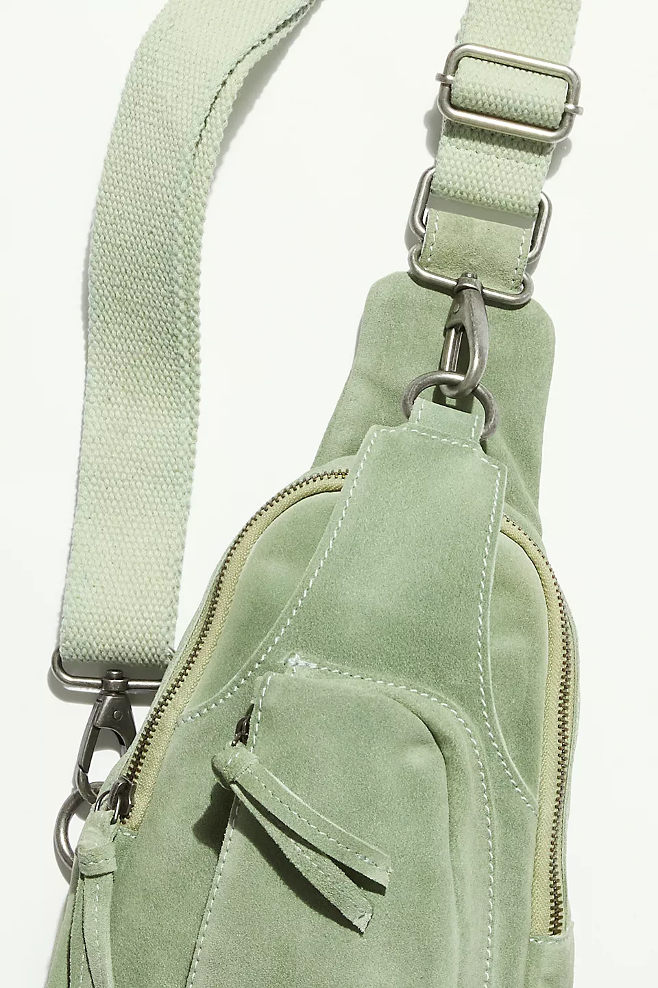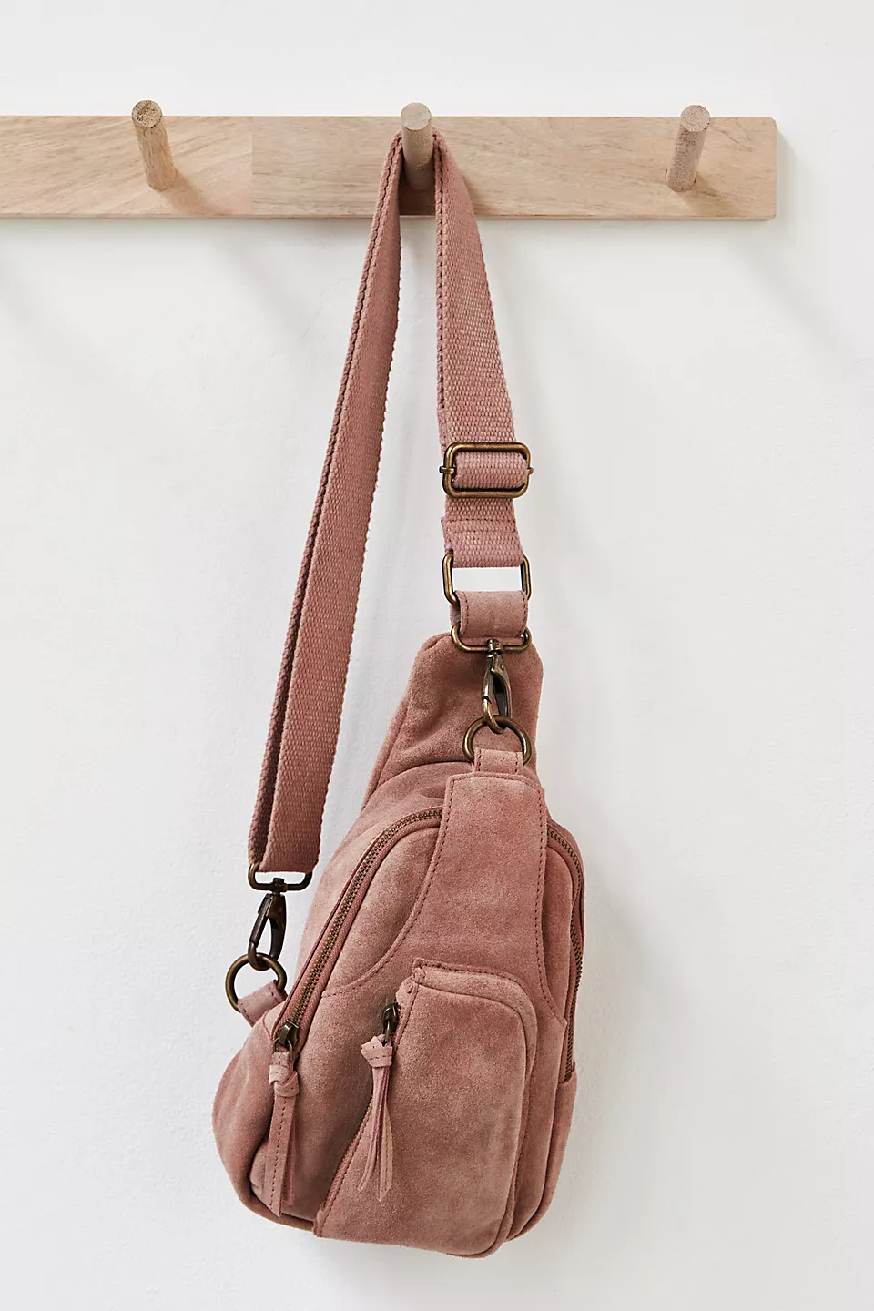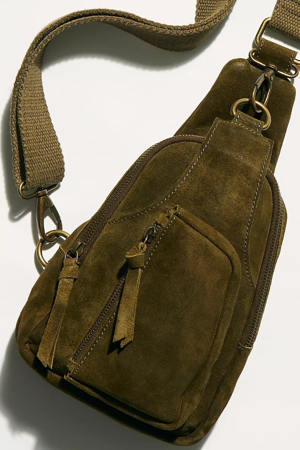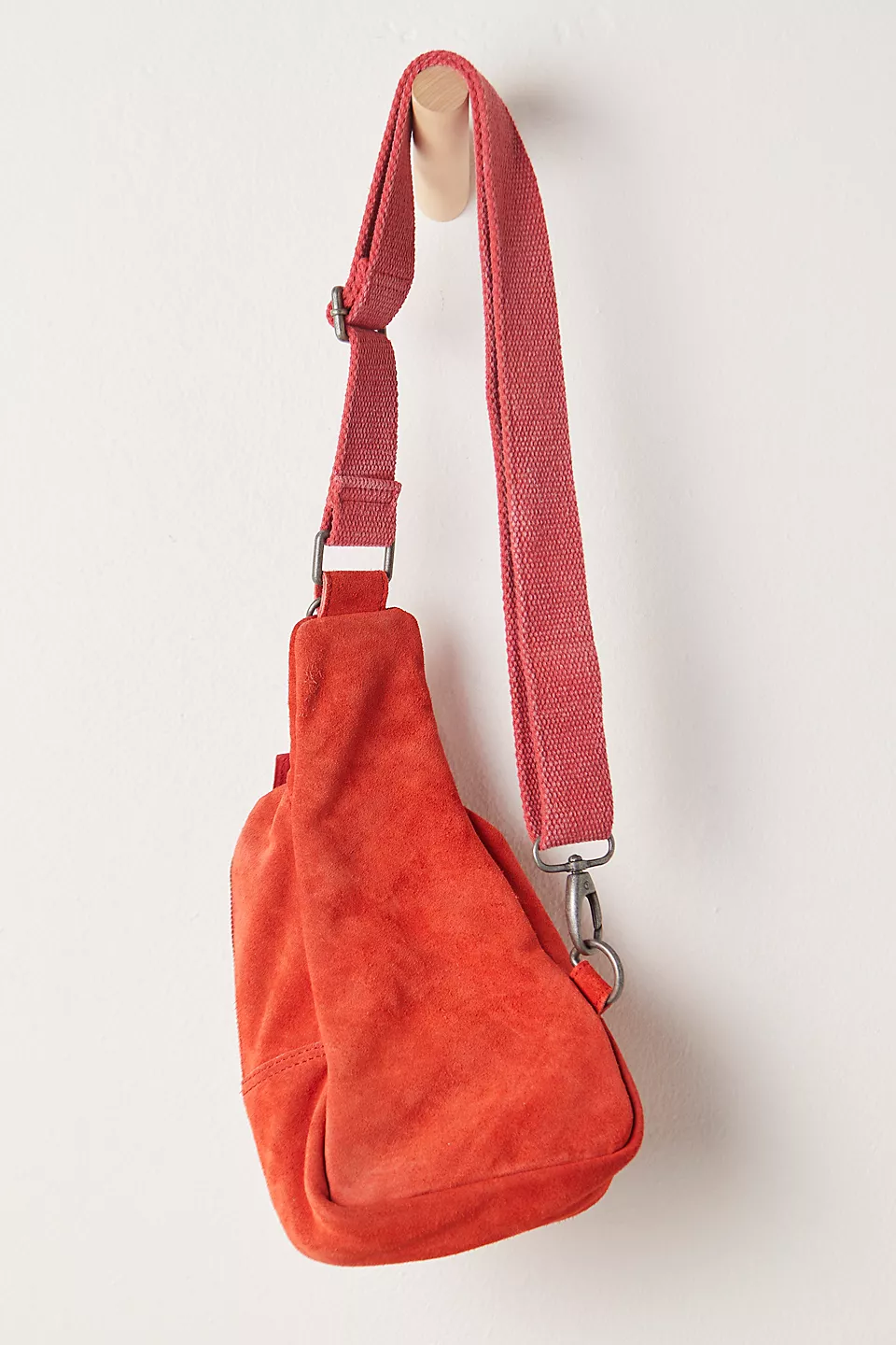 Shoulder the load with an of-the-moment sling bag, featured in a soft, velvety suede that is intentionally hand-finished.