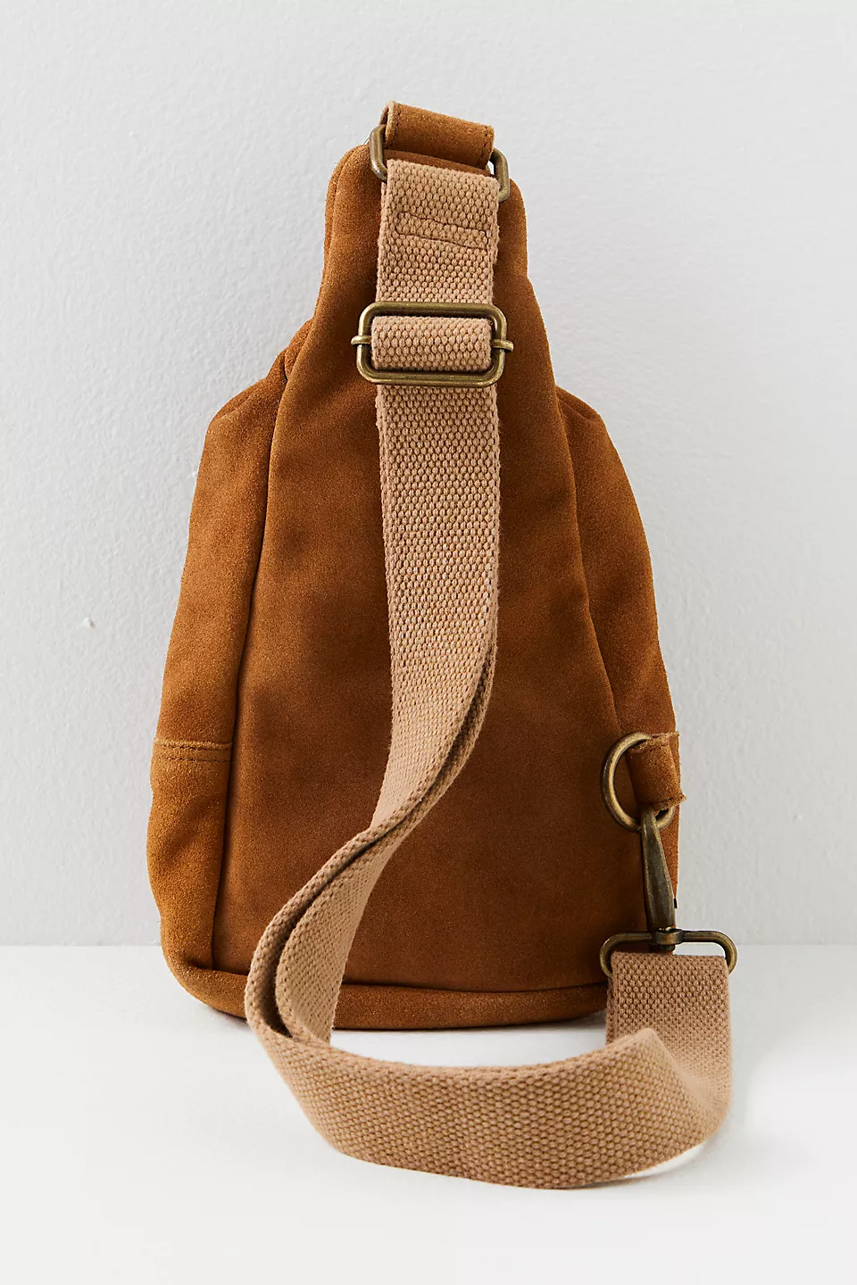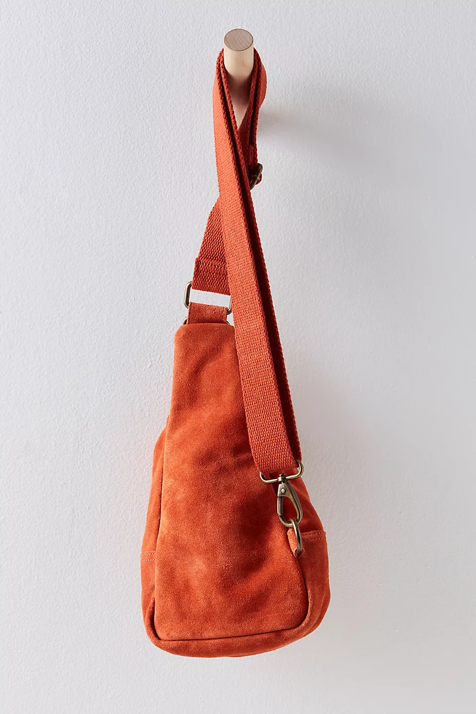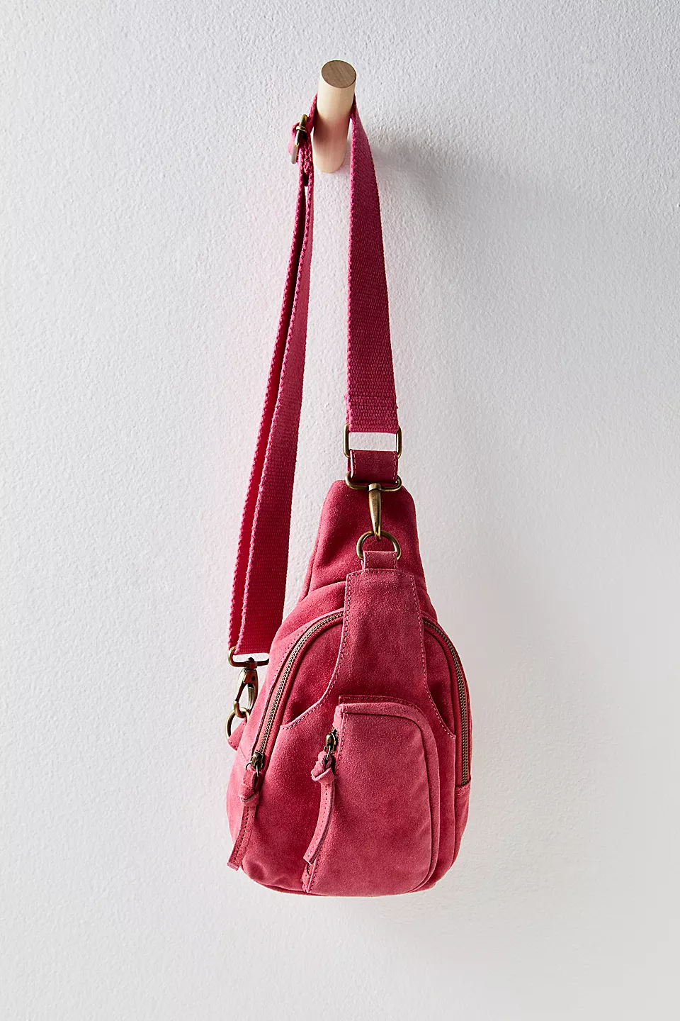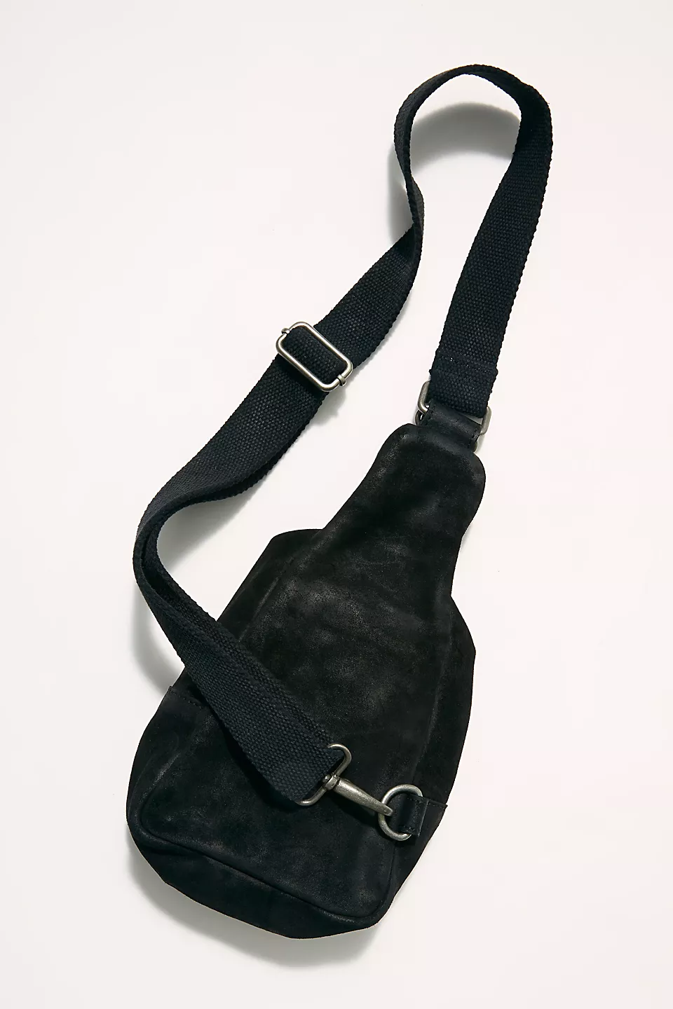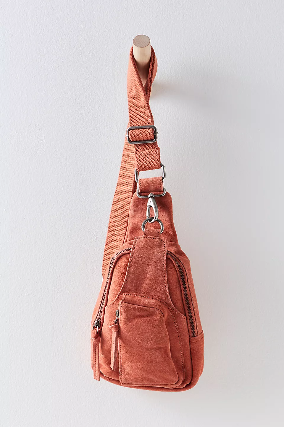 Shoulder the load with an of-the-moment sling bag, featured in a soft, velvety suede that is intentionally hand-finished.