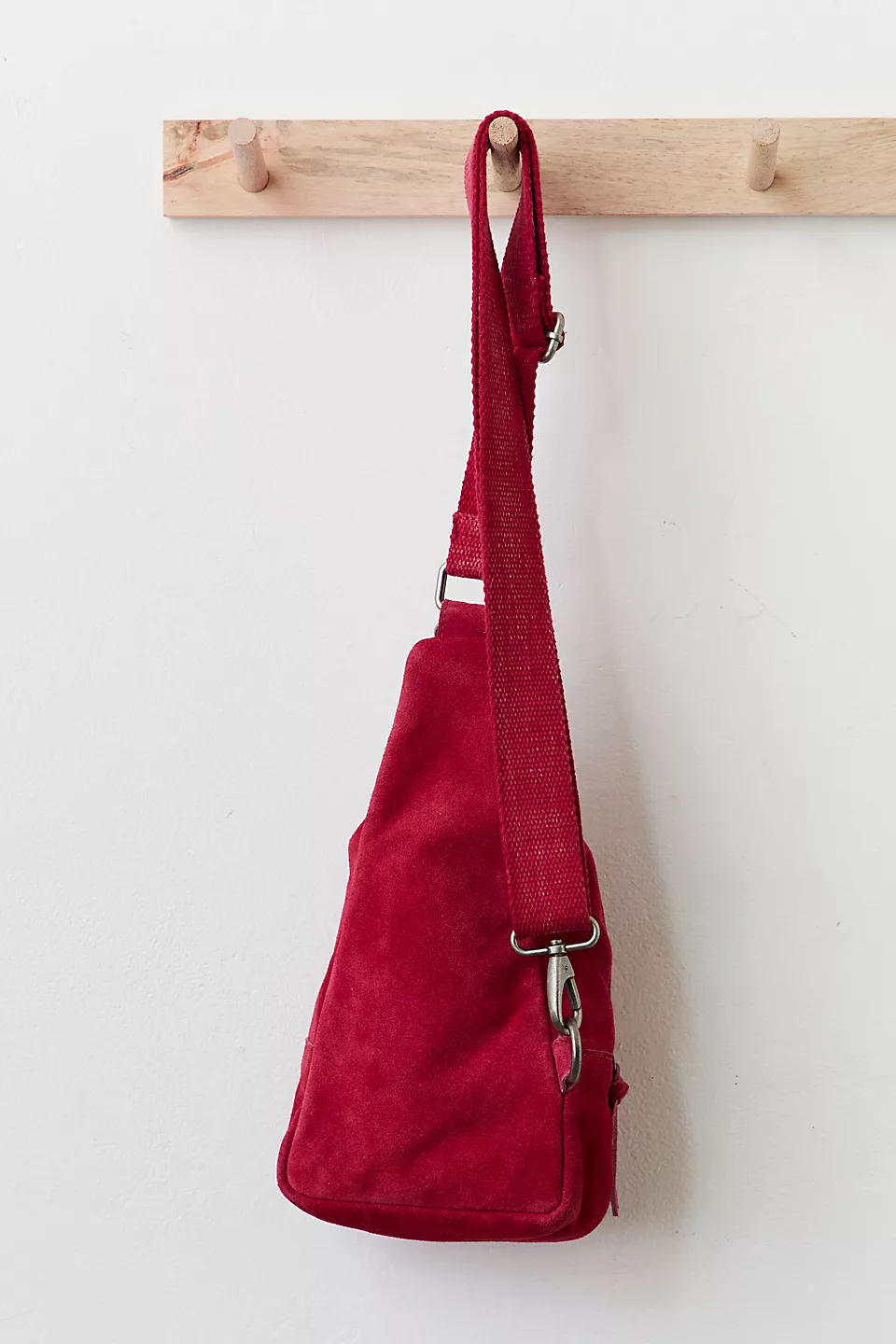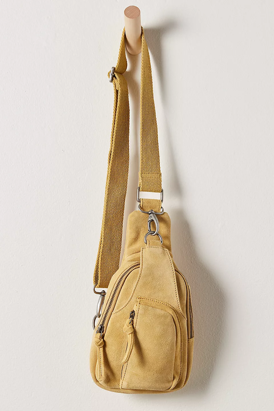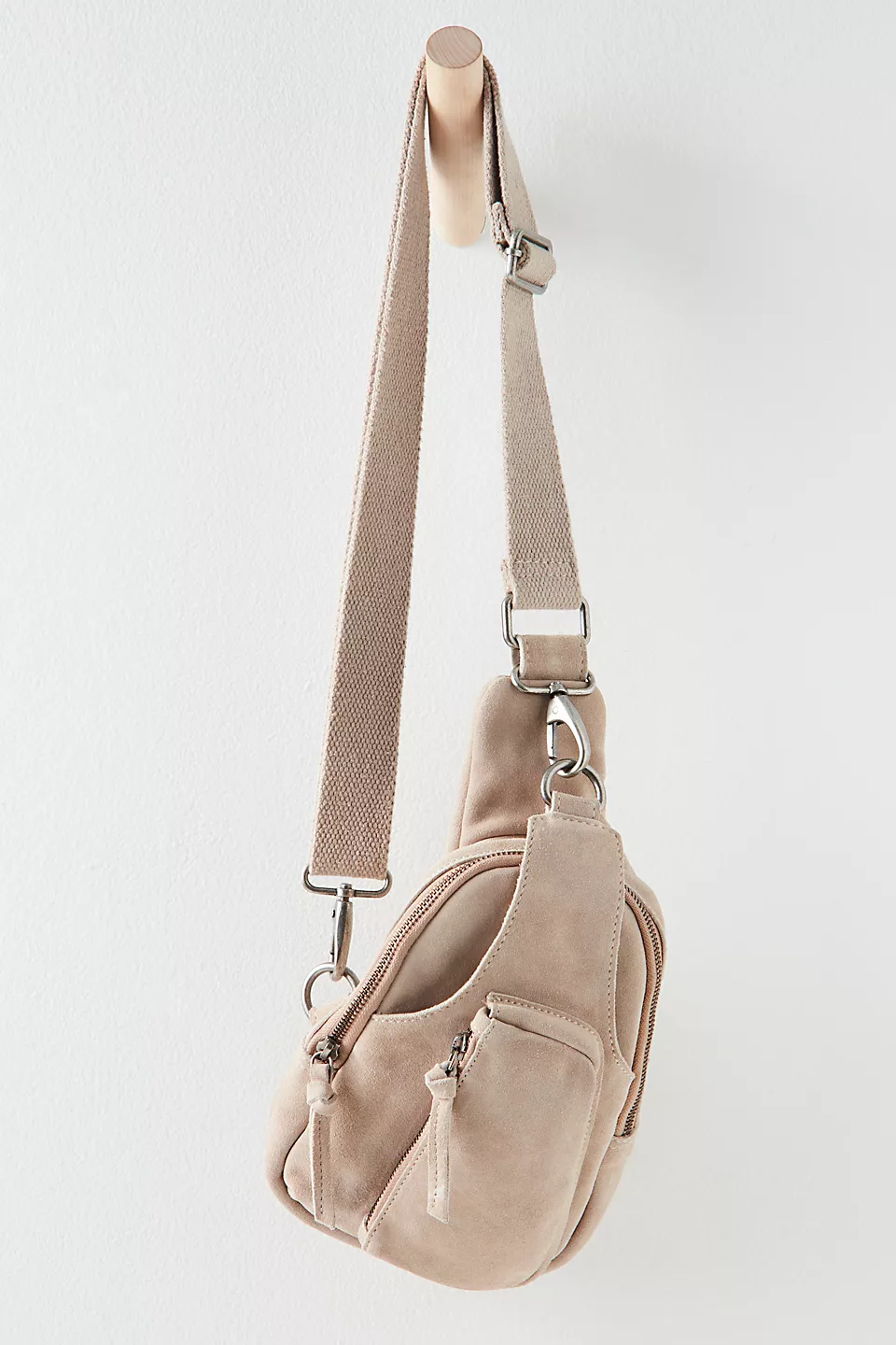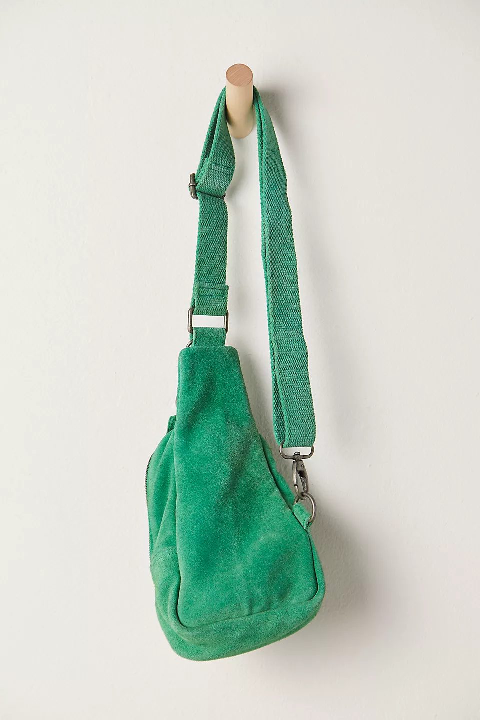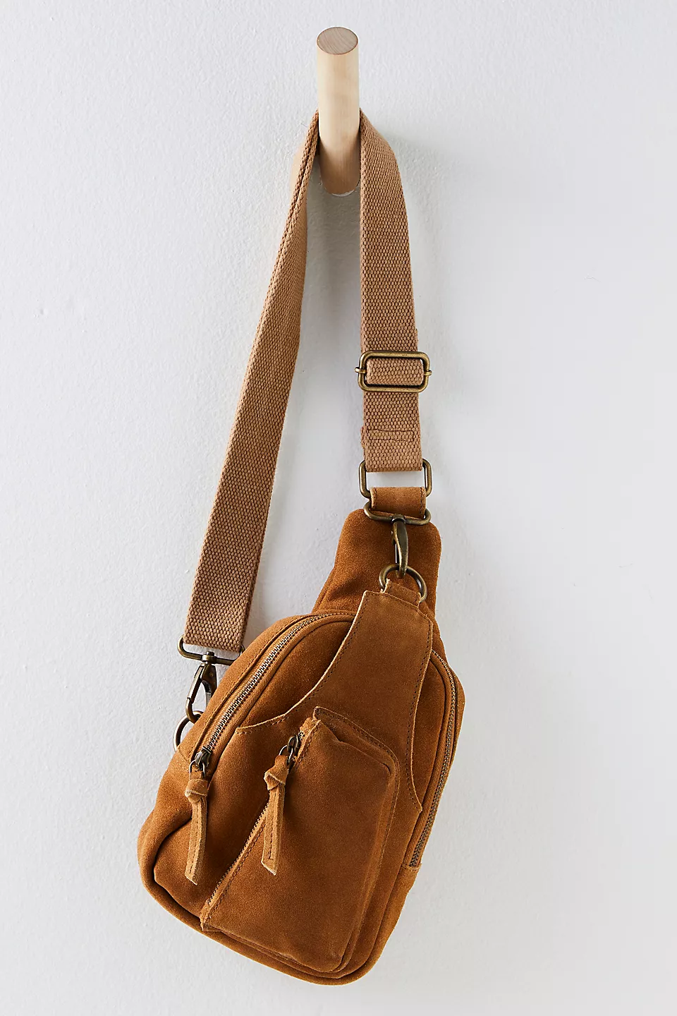 Shoulder the load with an of-the-moment sling bag, featured in a soft, velvety suede that is intentionally hand-finished.