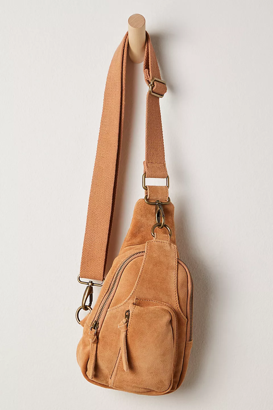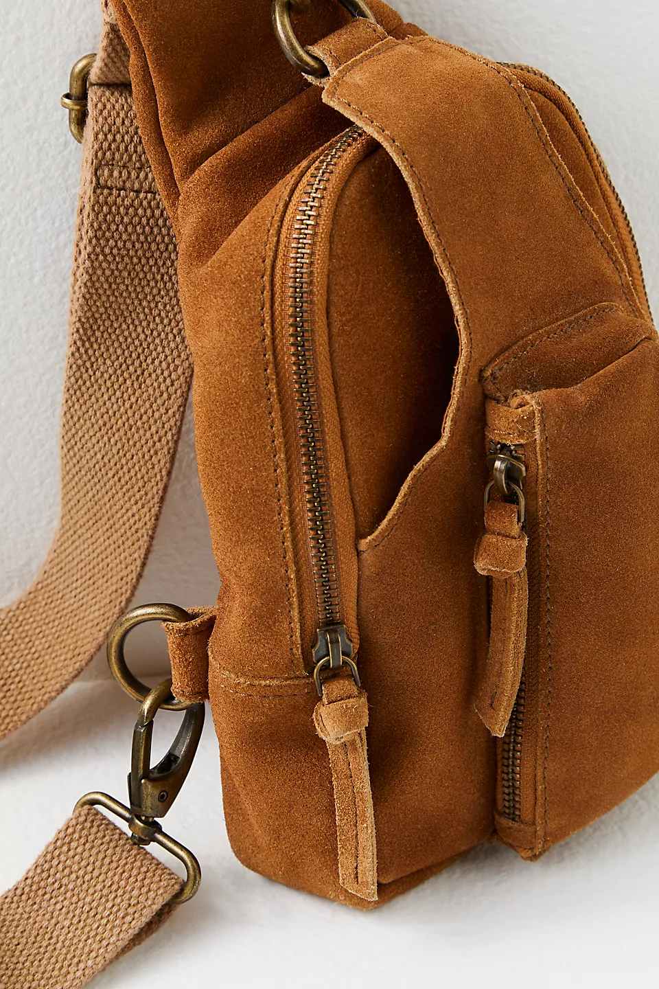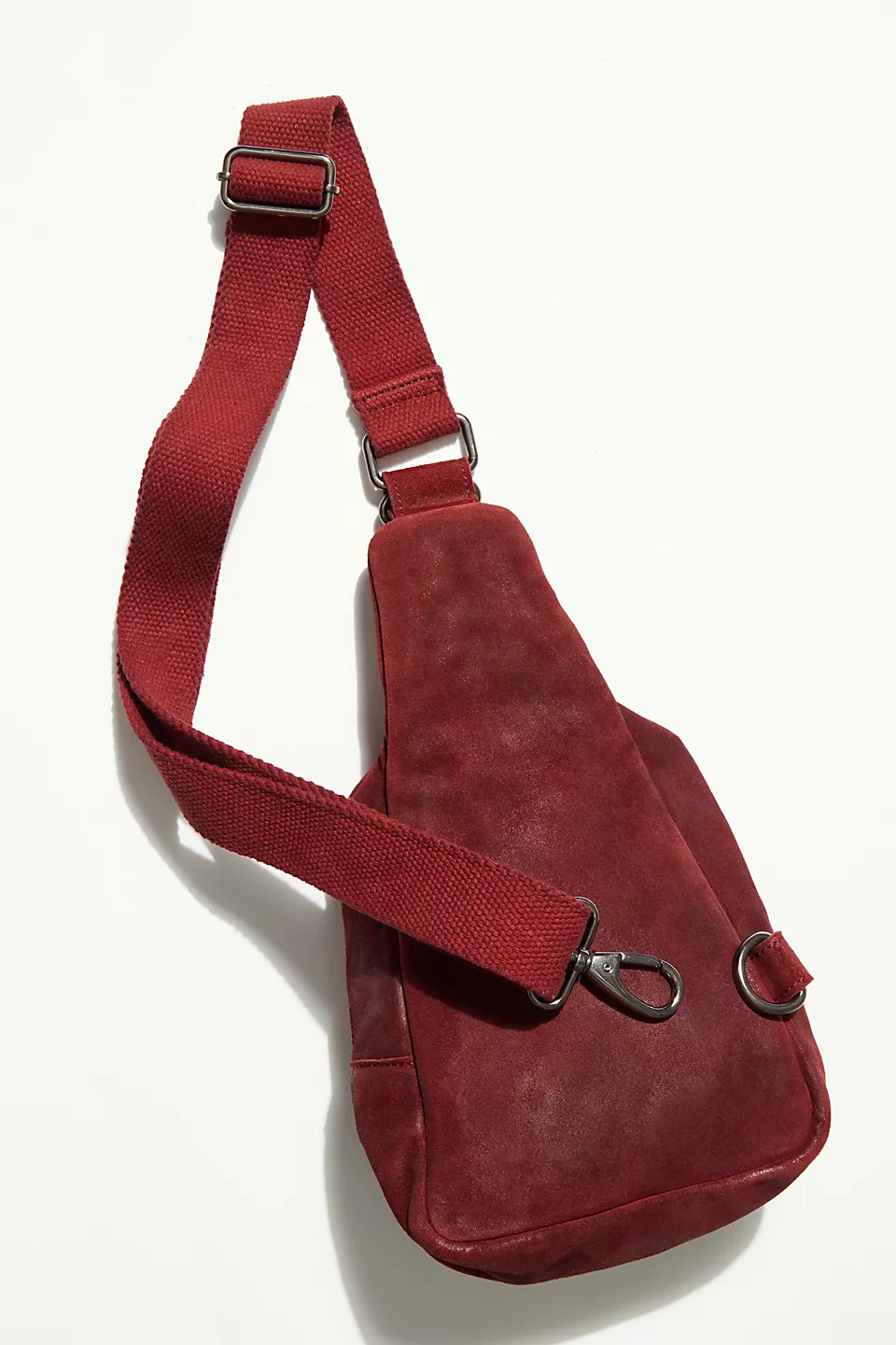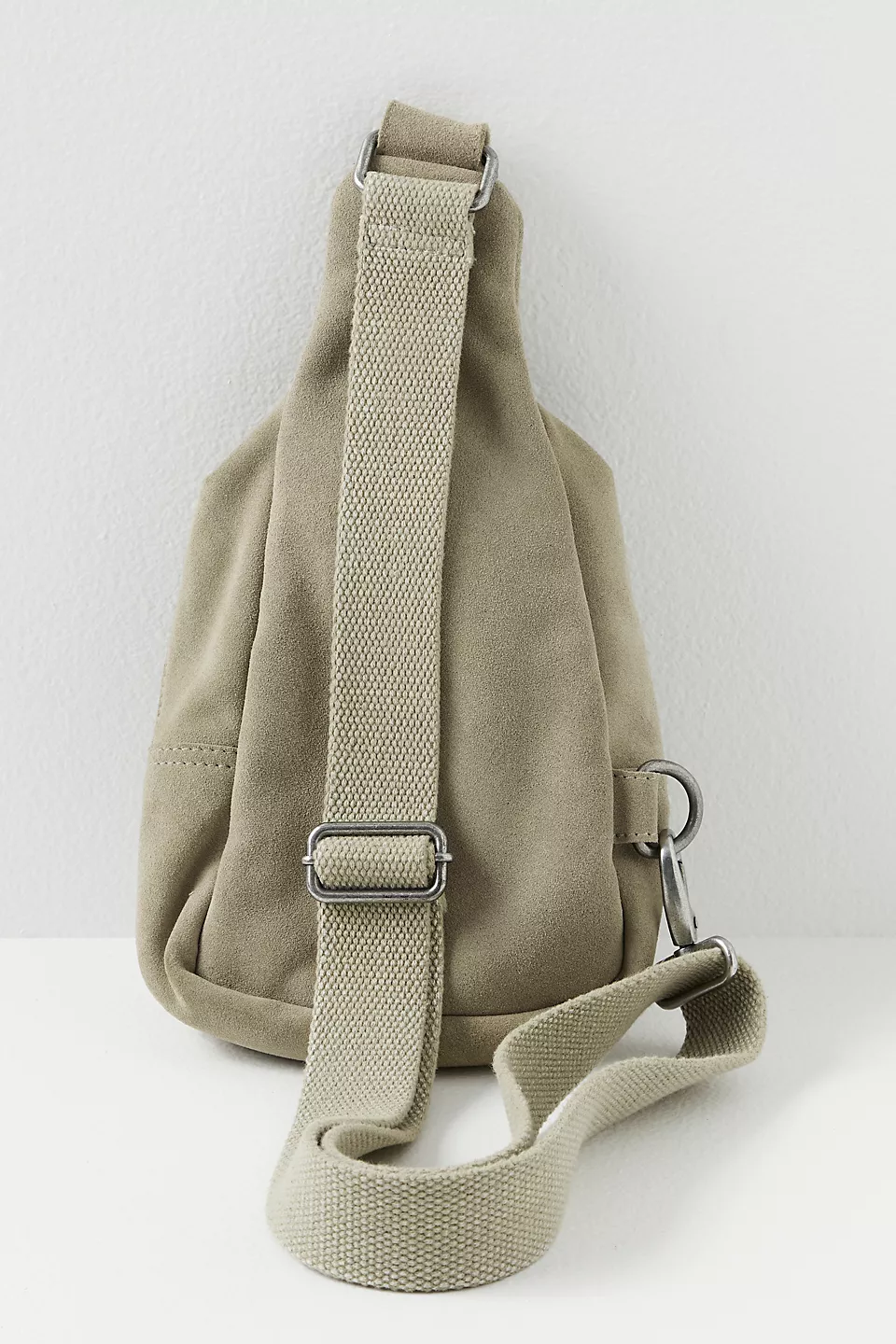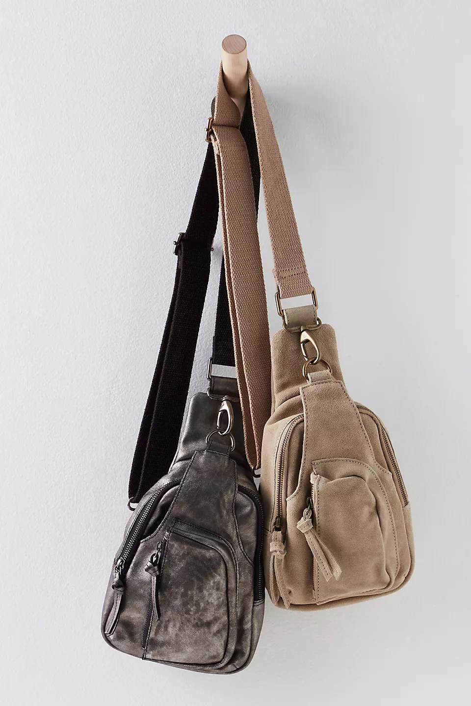 Shoulder the load with an of-the-moment sling bag, featured in a soft, velvety suede that is intentionally hand-finished.
