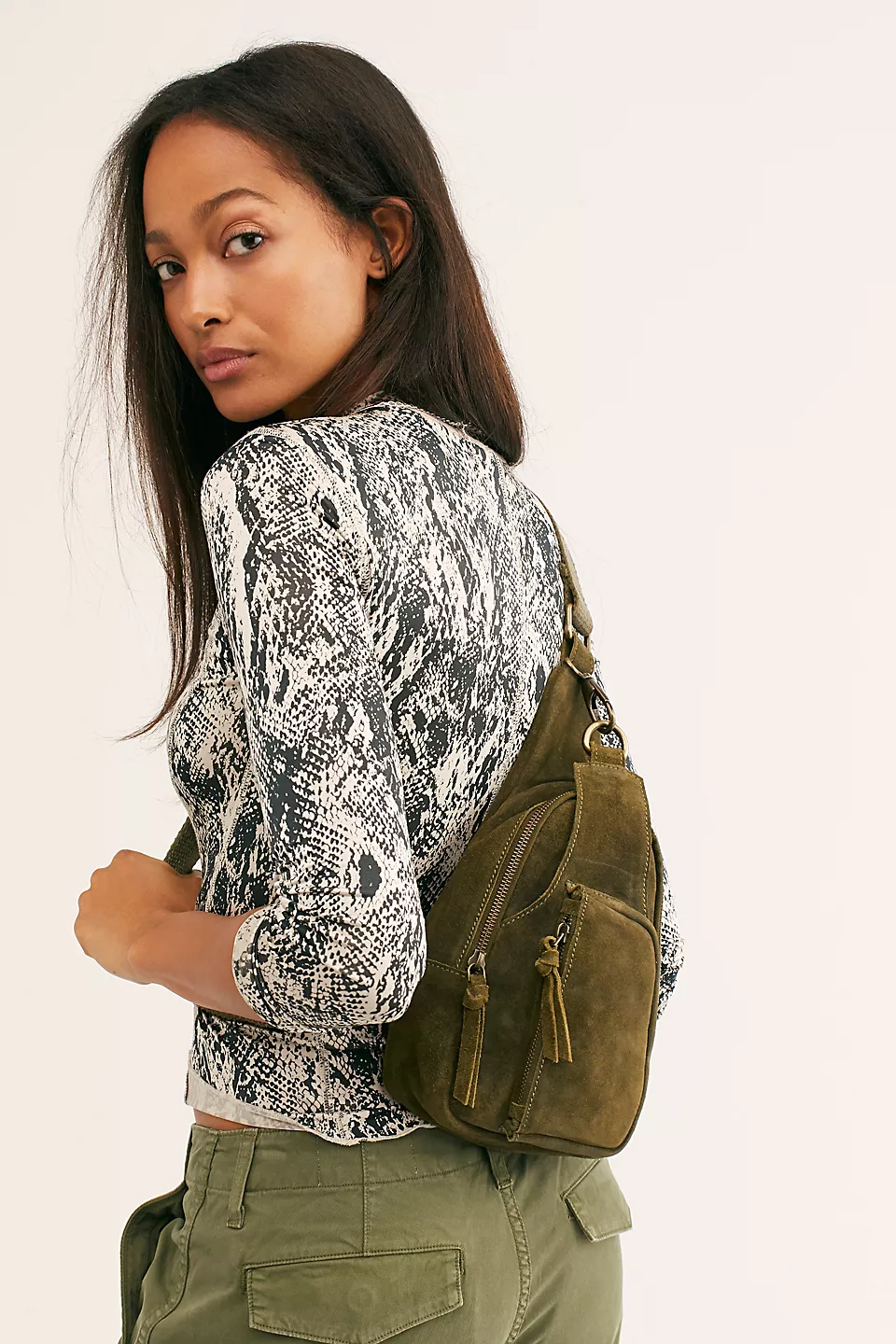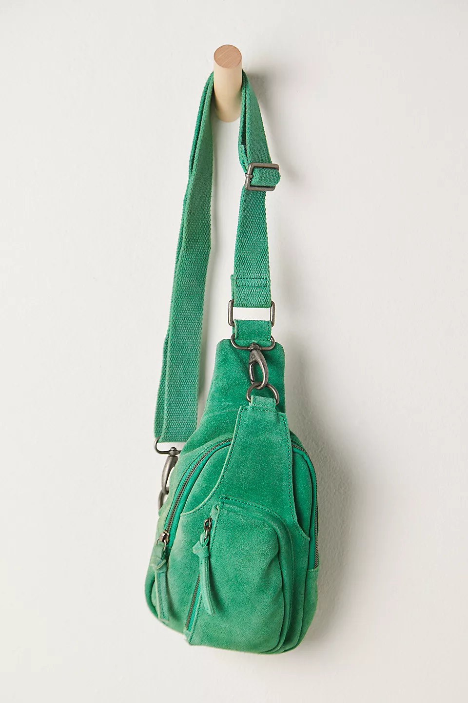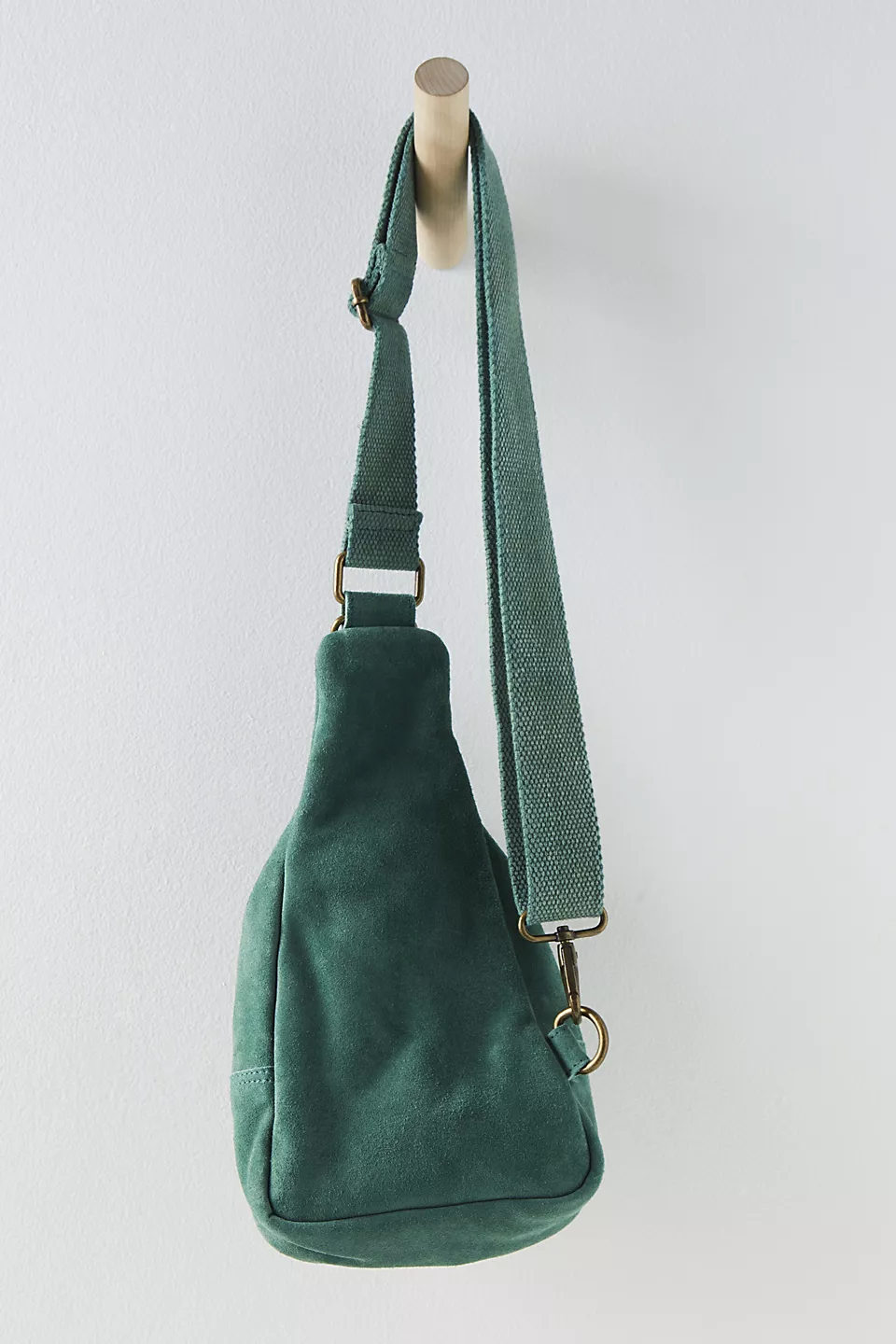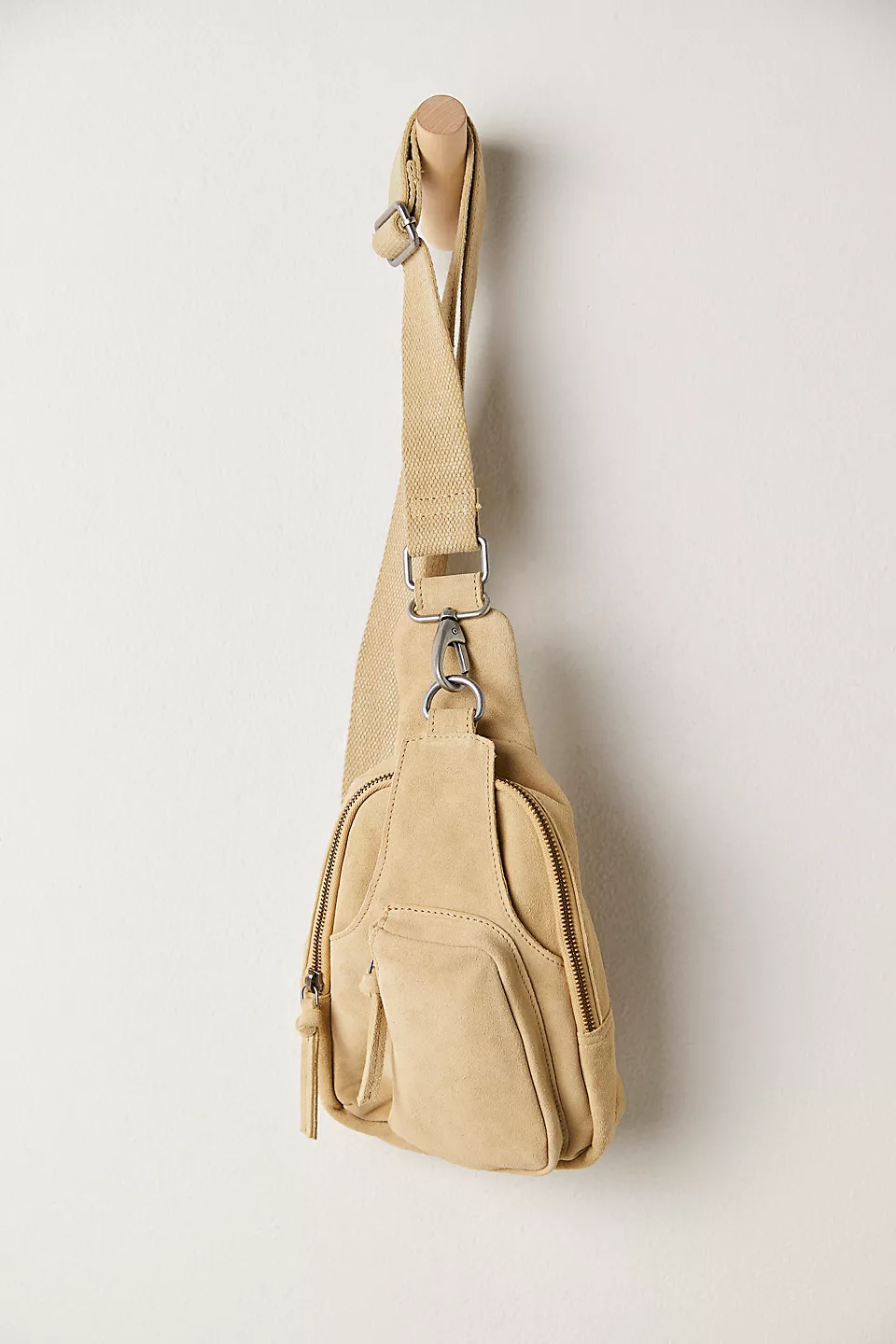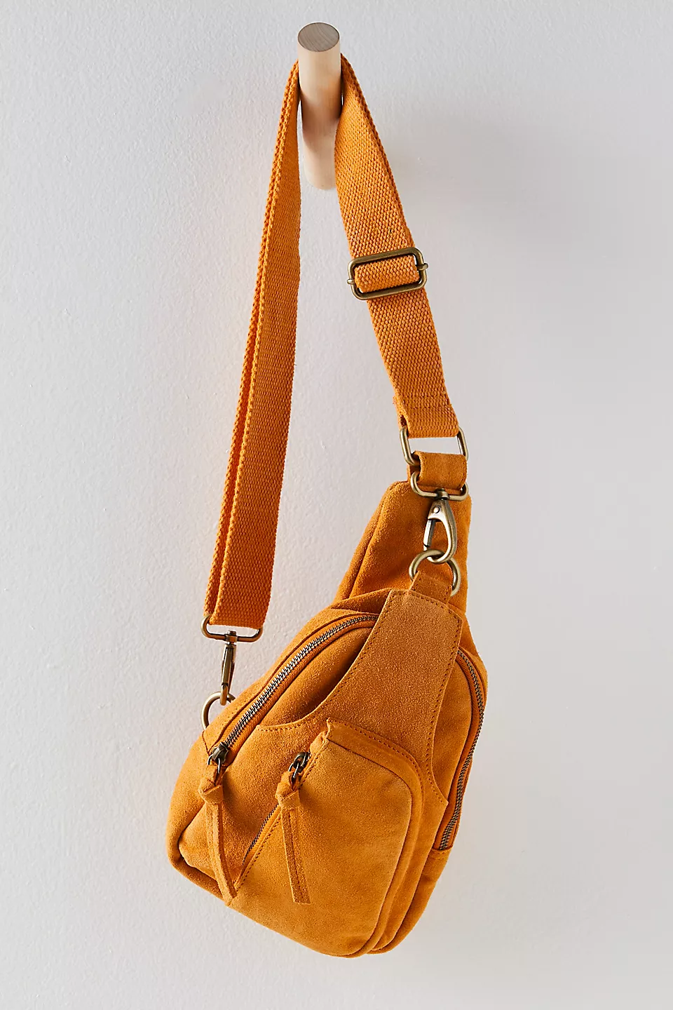 Shoulder the load with an of-the-moment sling bag, featured in a soft, velvety suede that is intentionally hand-finished.