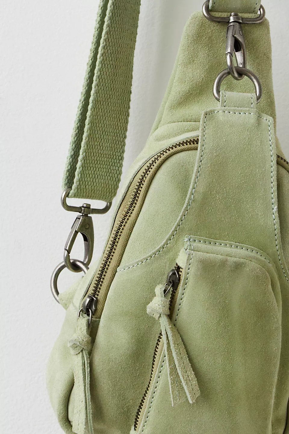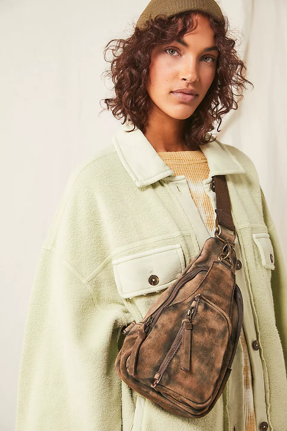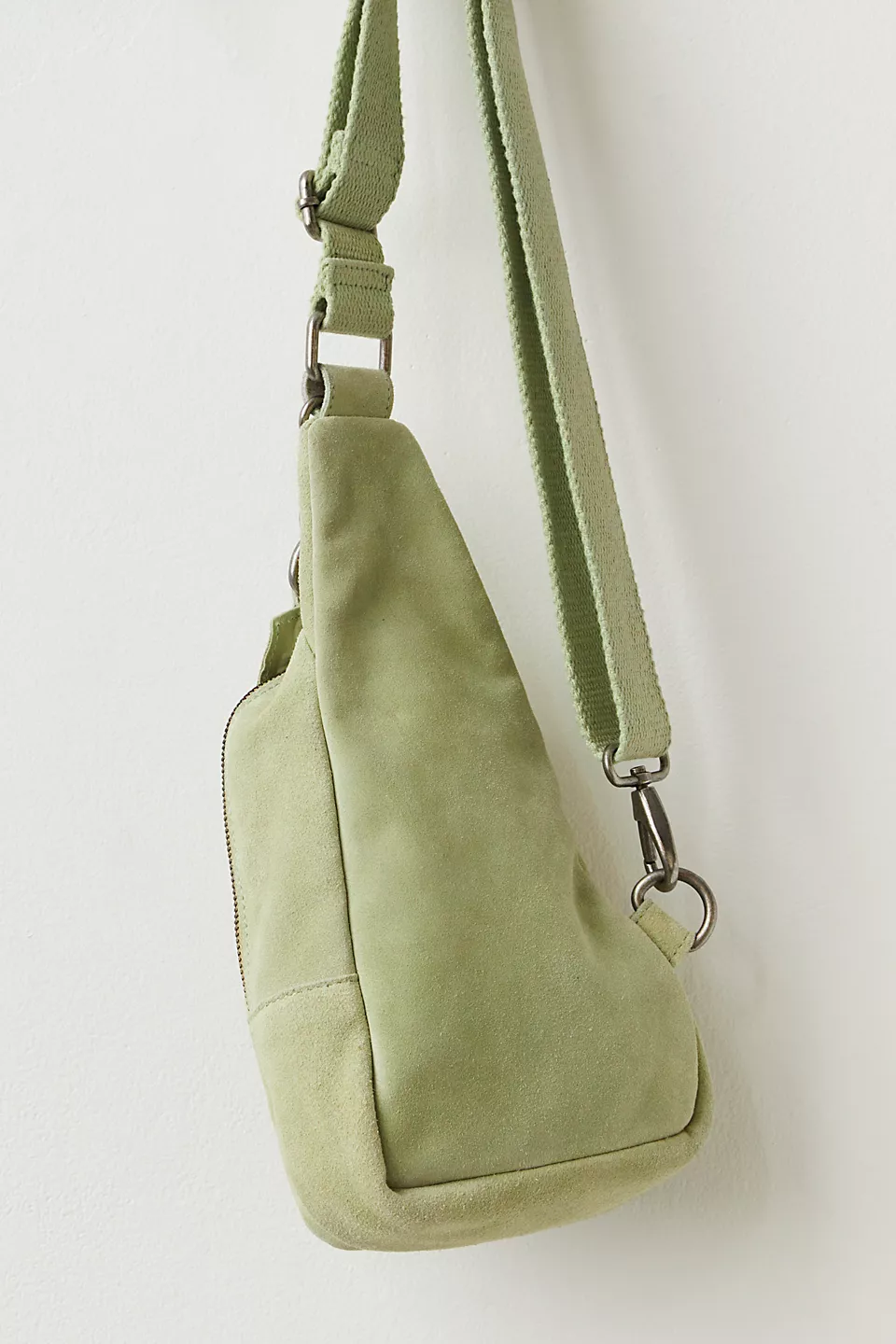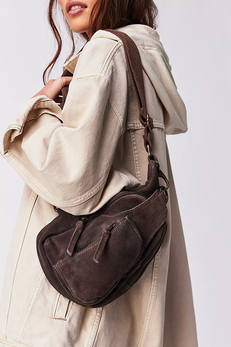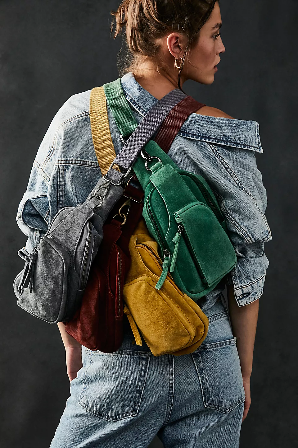 Shoulder the load with an of-the-moment sling bag, featured in a soft, velvety suede that is intentionally hand-finished.