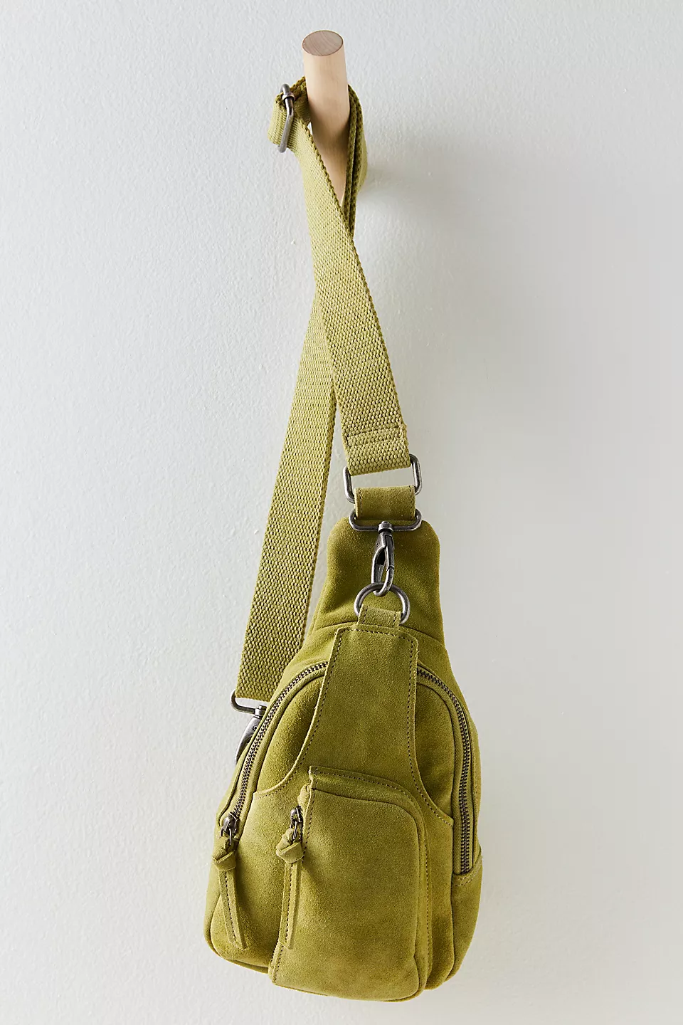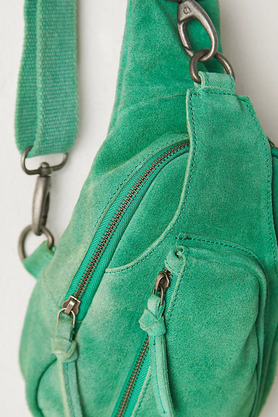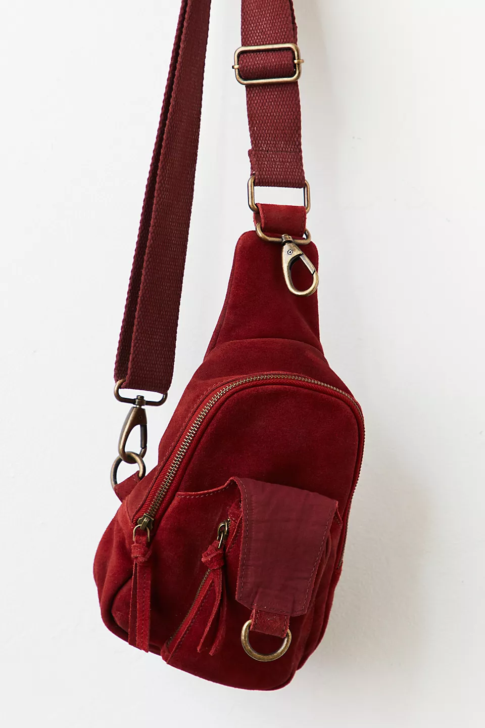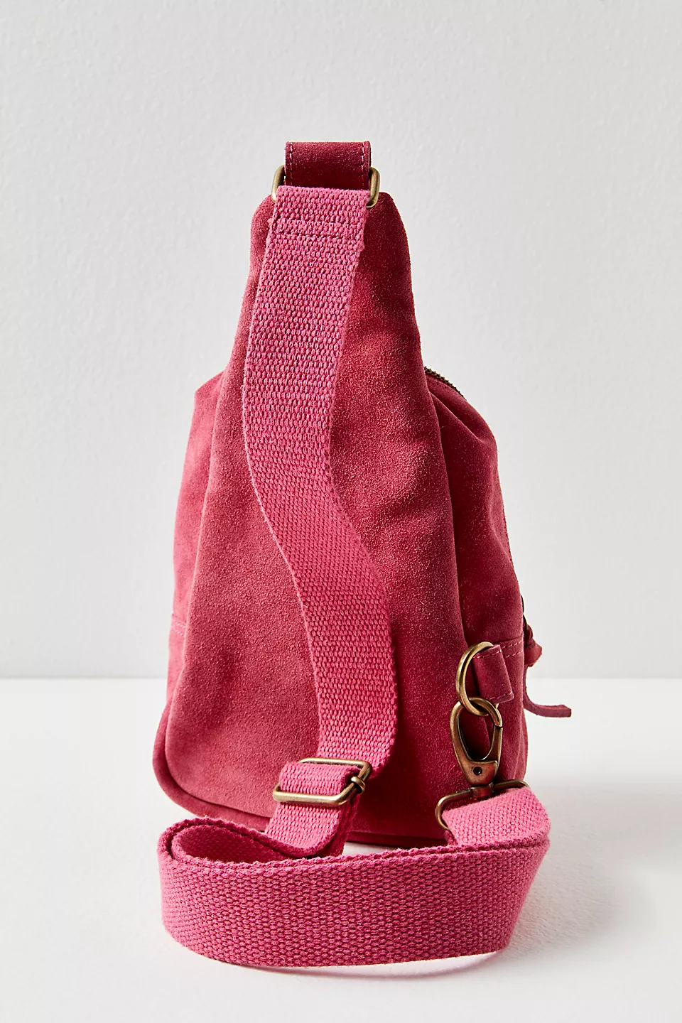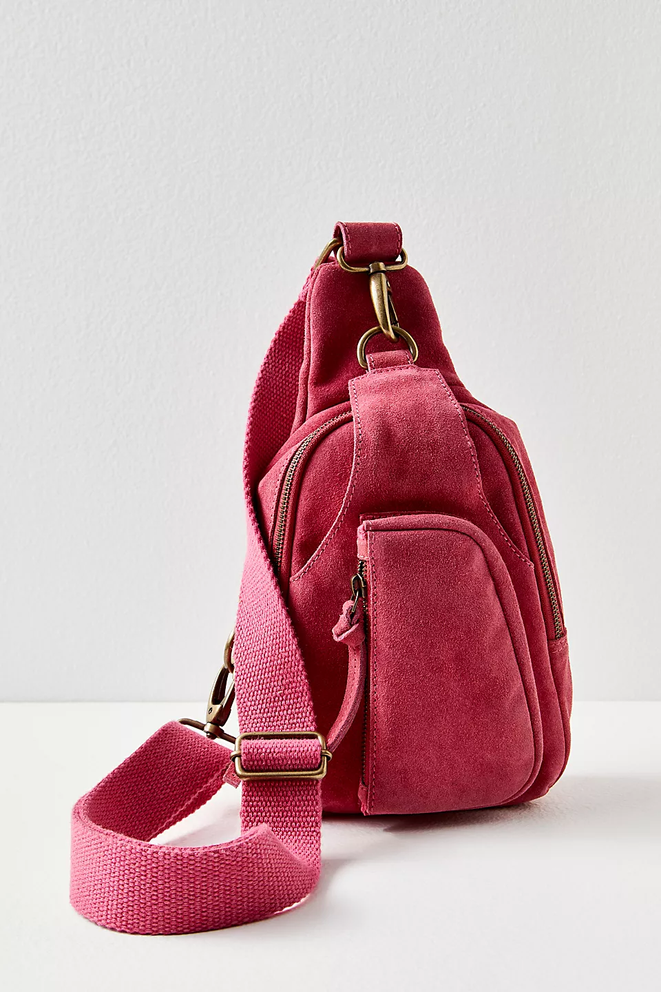Shoulder the load with an of-the-moment sling bag, featured in a soft, velvety suede that is intentionally hand-finished.