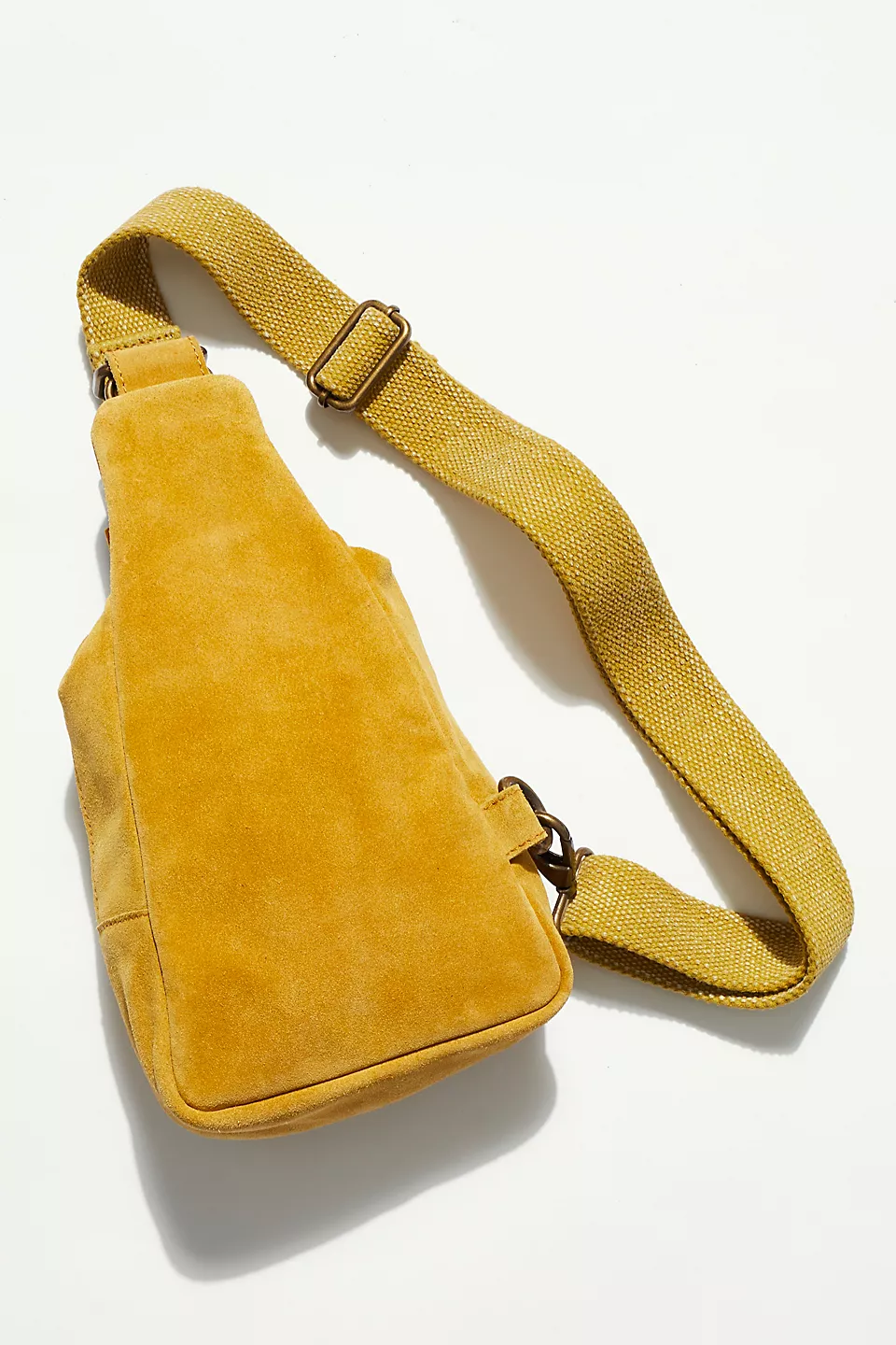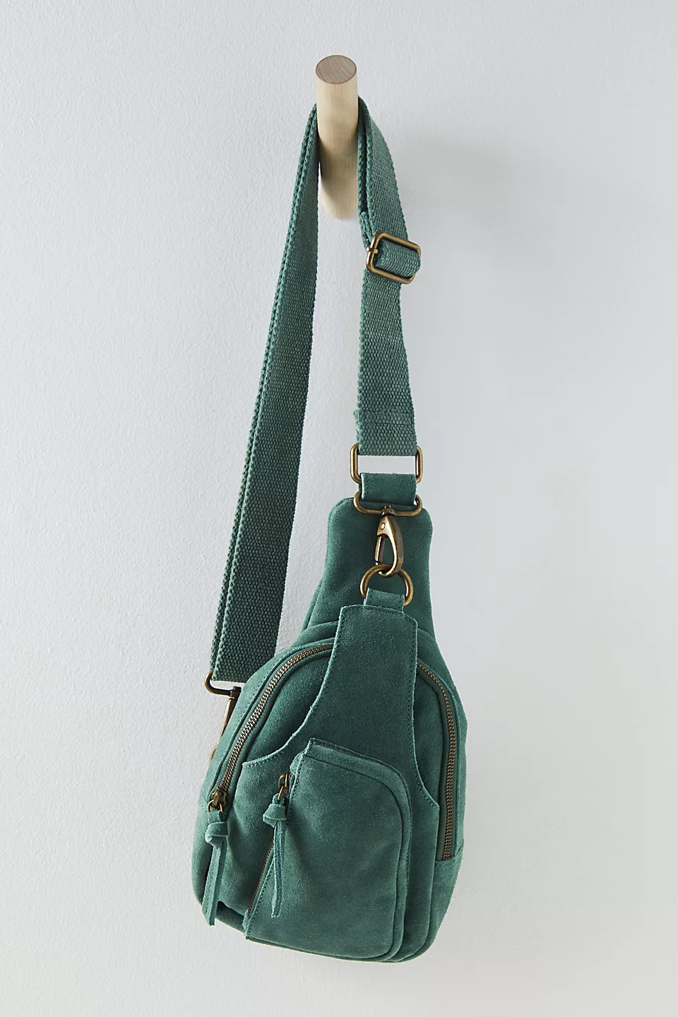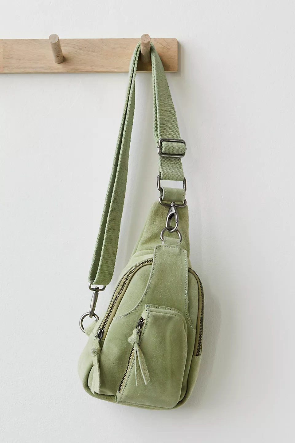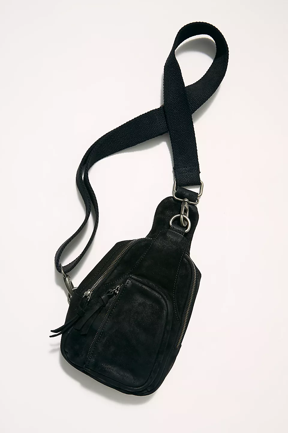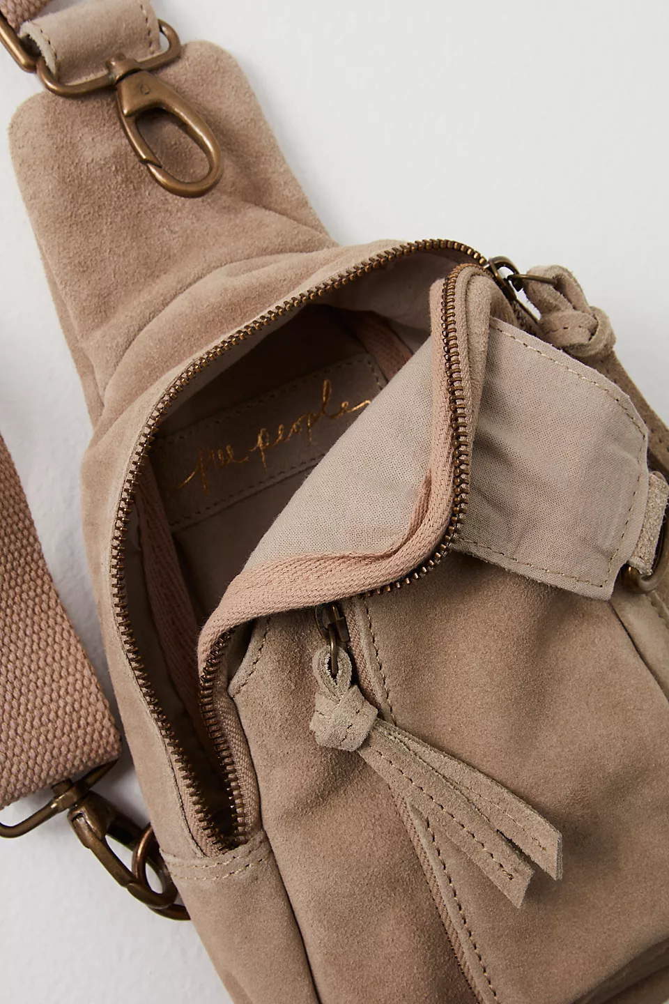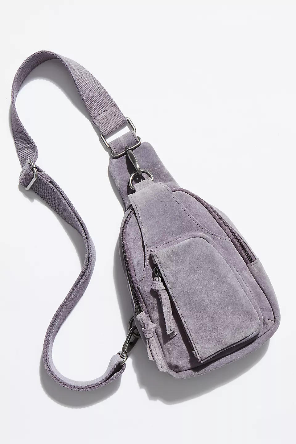 Shoulder the load with an of-the-moment sling bag, featured in a soft, velvety suede that is intentionally hand-finished.