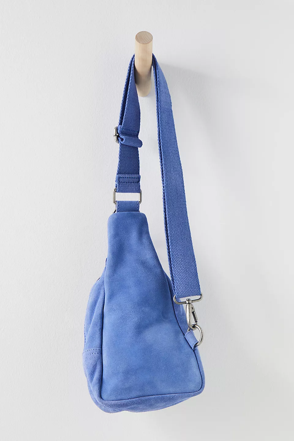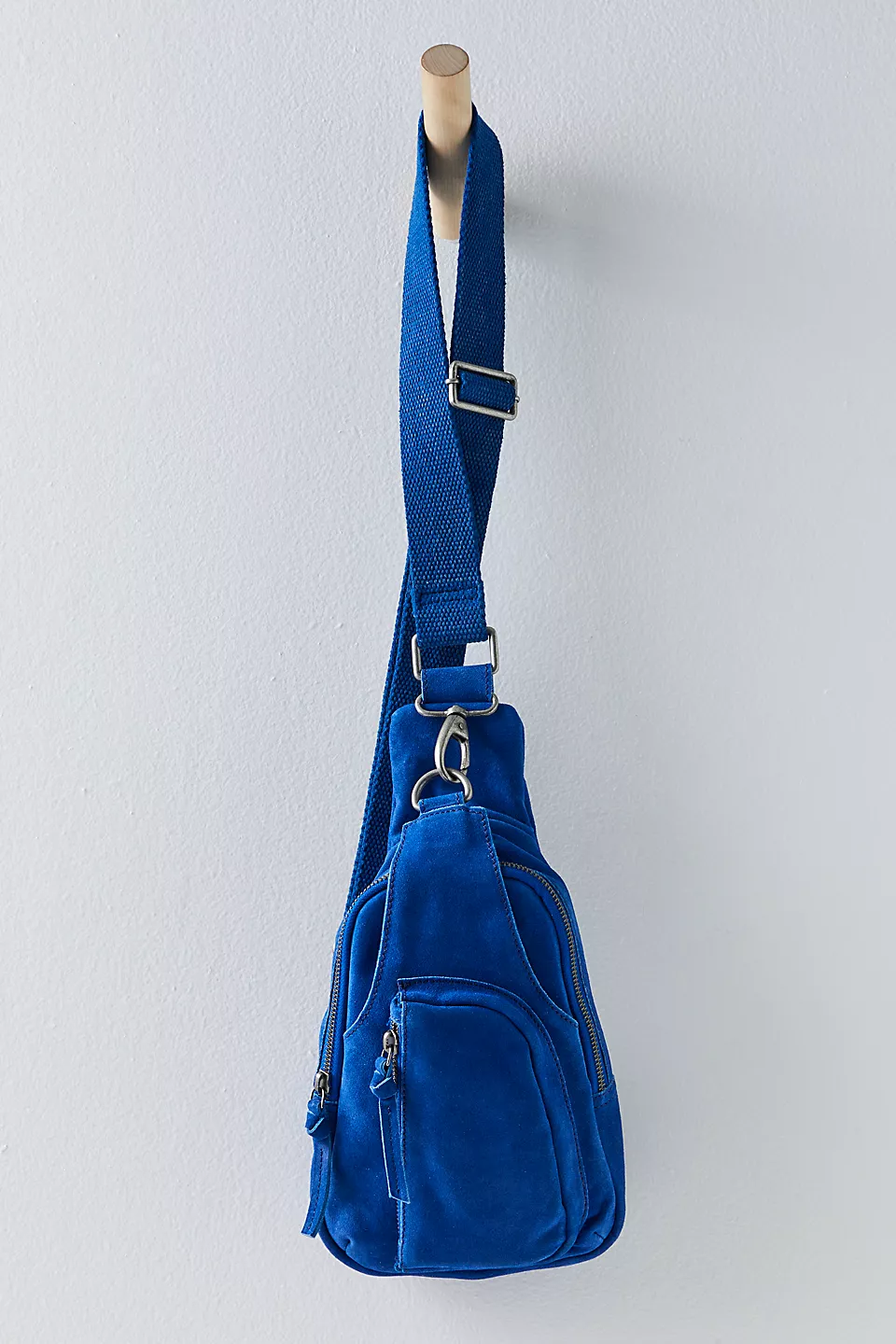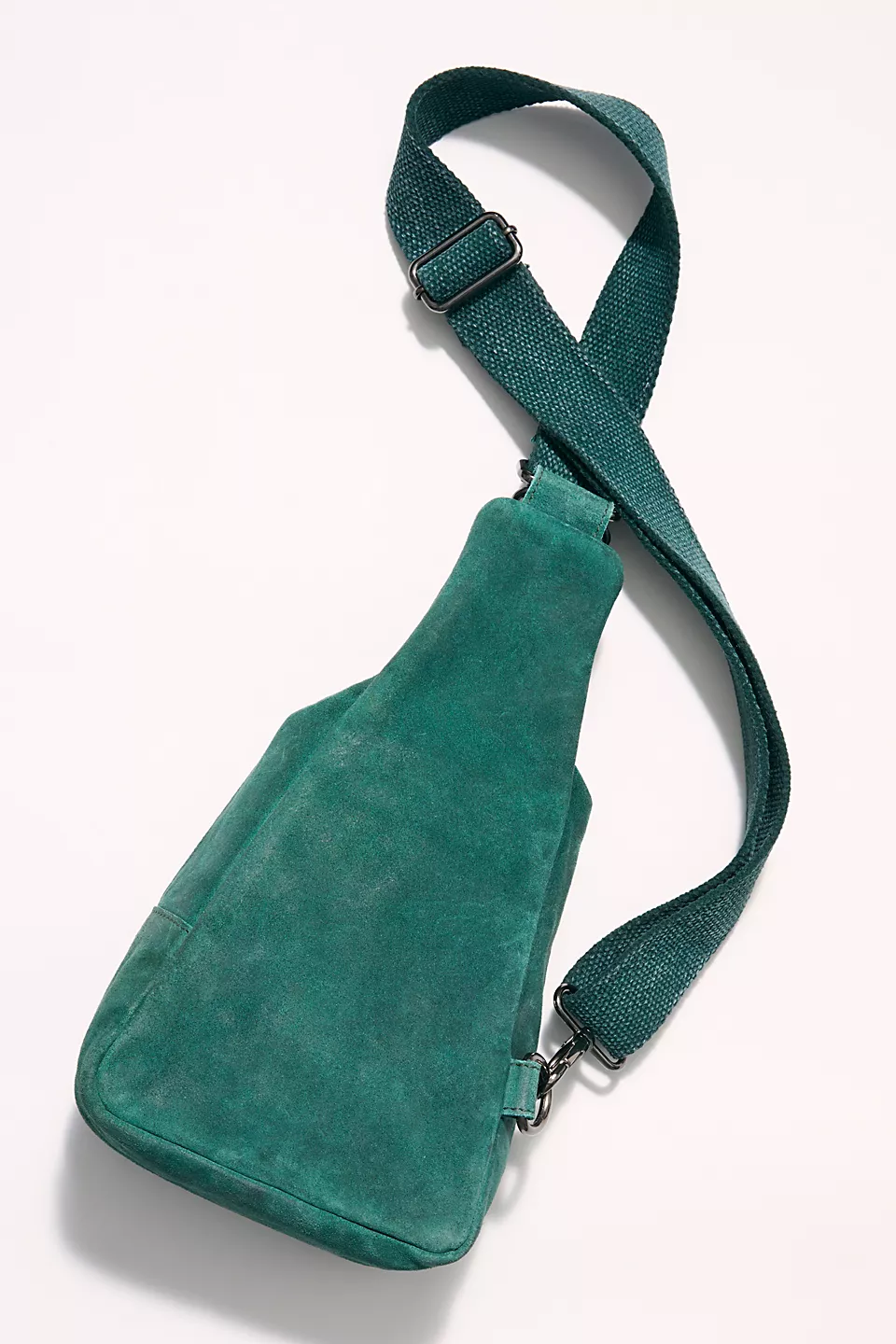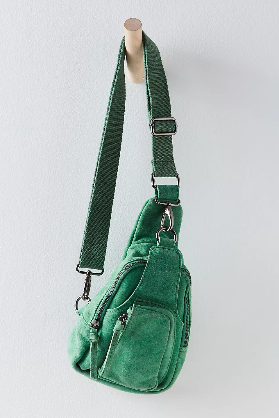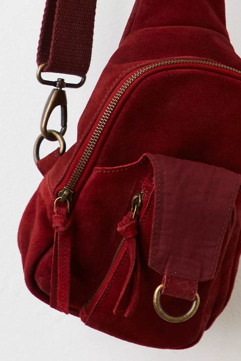 Shoulder the load with an of-the-moment sling bag, featured in a soft, velvety suede that is intentionally hand-finished.