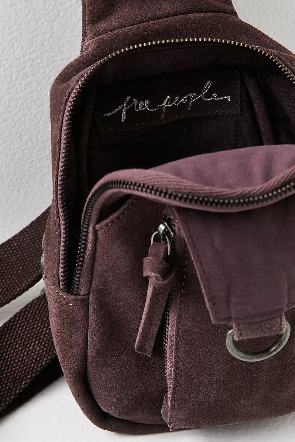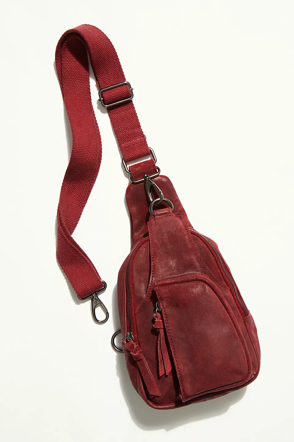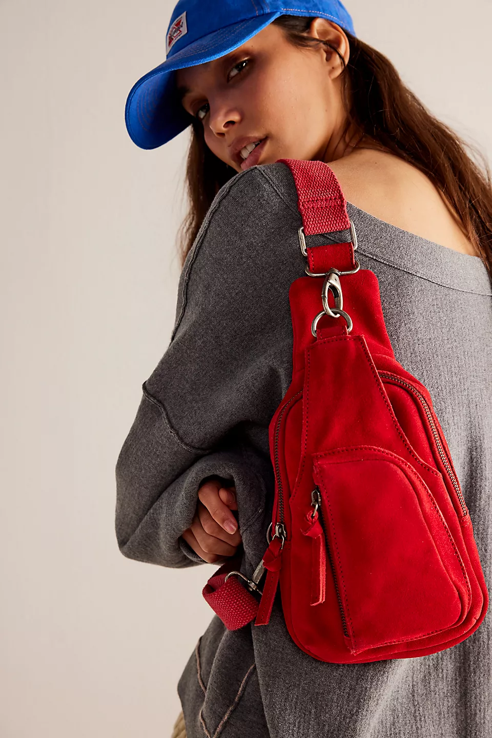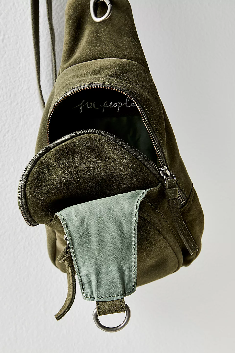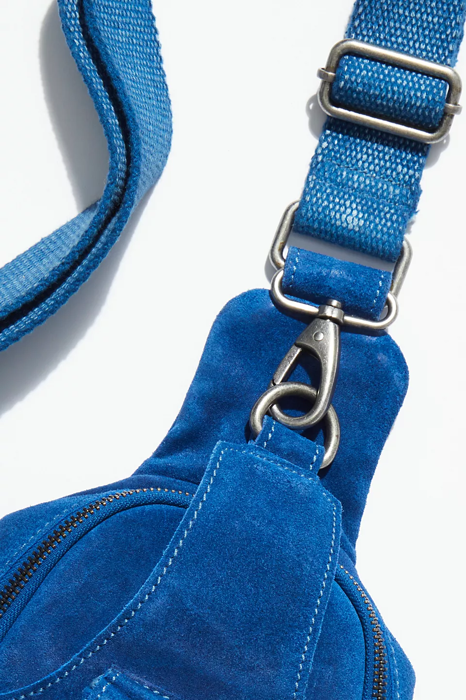 Shoulder the load with an of-the-moment sling bag, featured in a soft, velvety suede that is intentionally hand-finished.