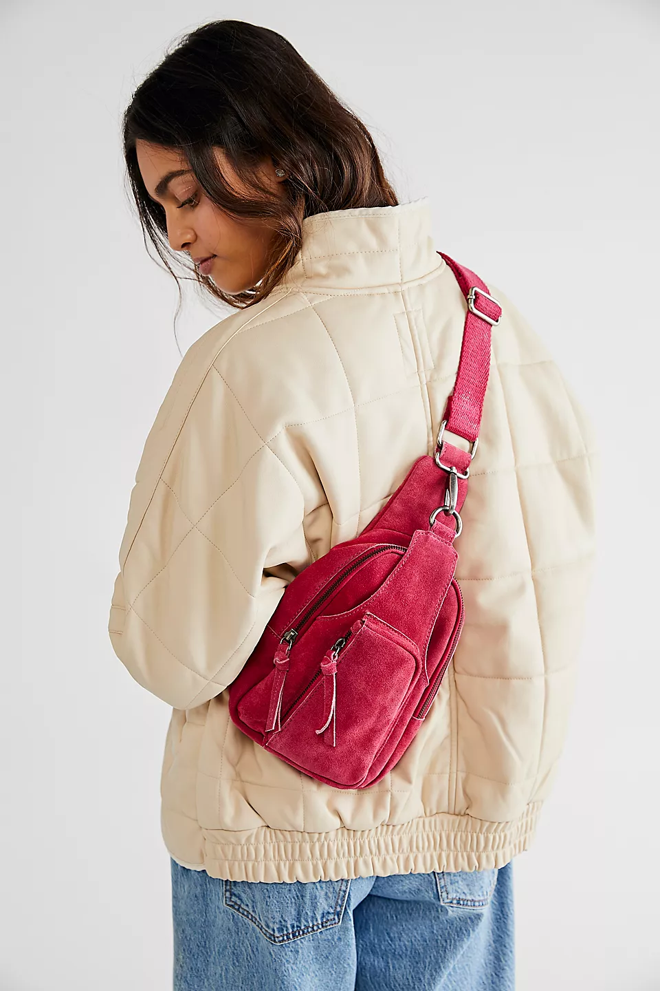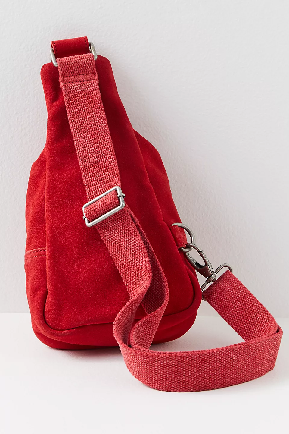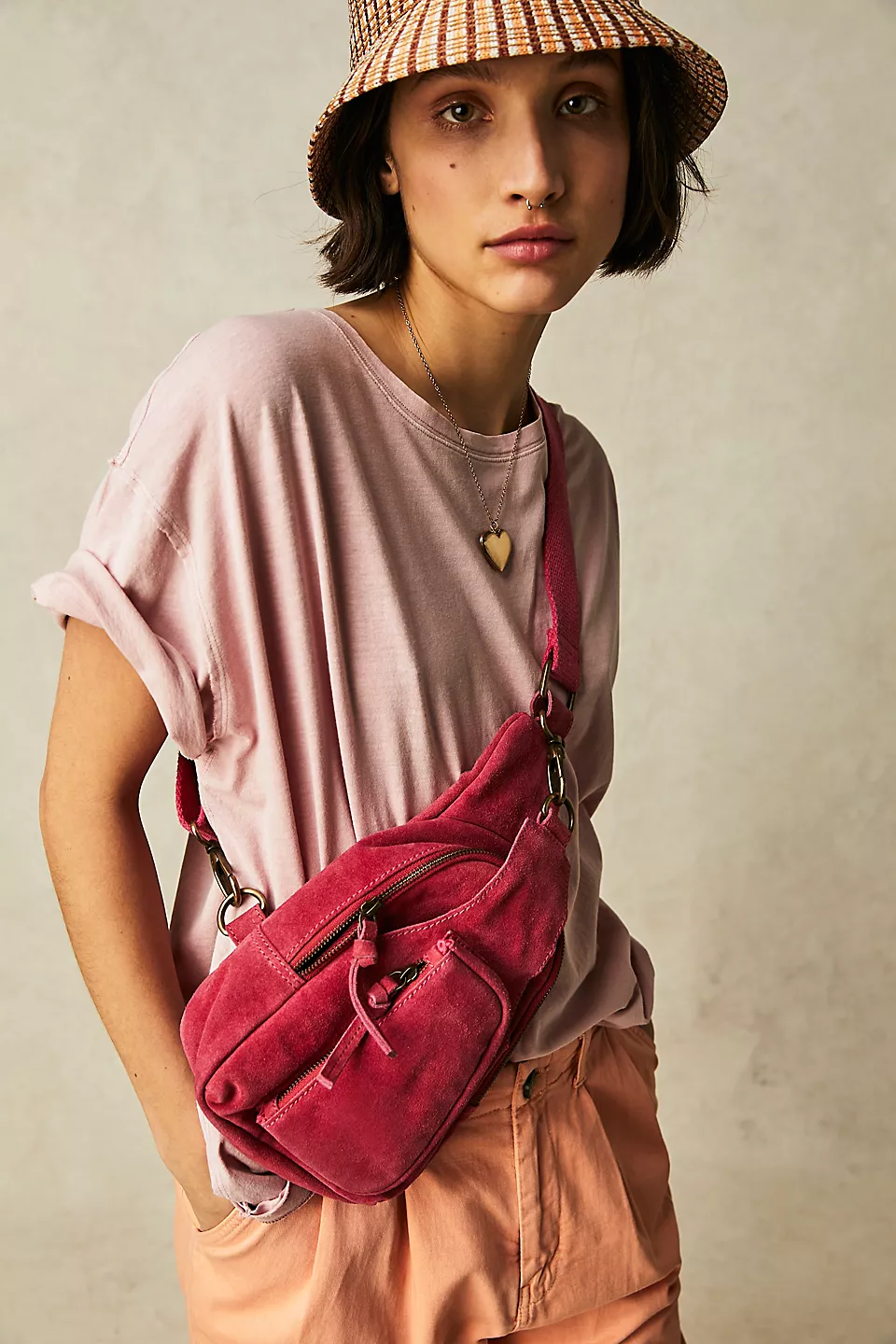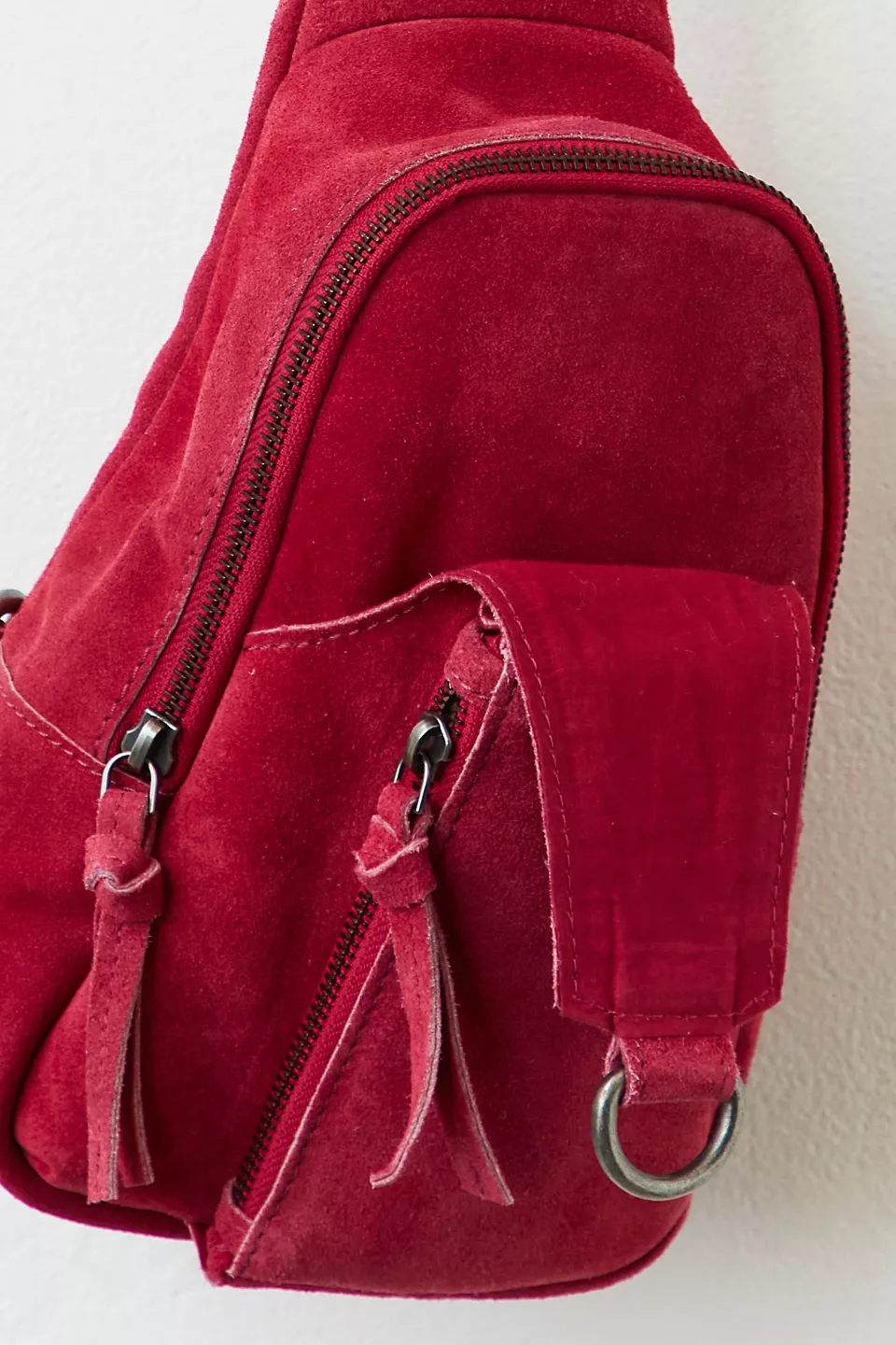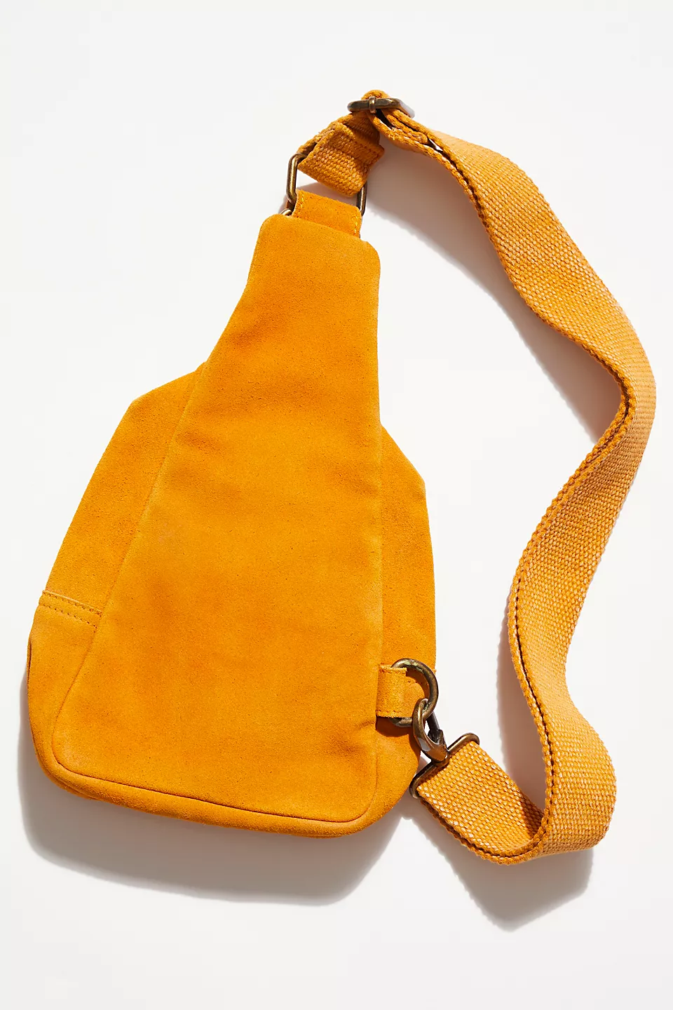 Shoulder the load with an of-the-moment sling bag, featured in a soft, velvety suede that is intentionally hand-finished.
