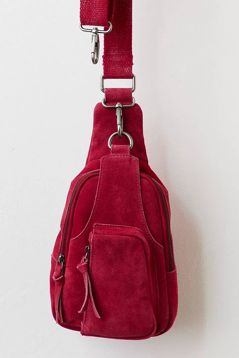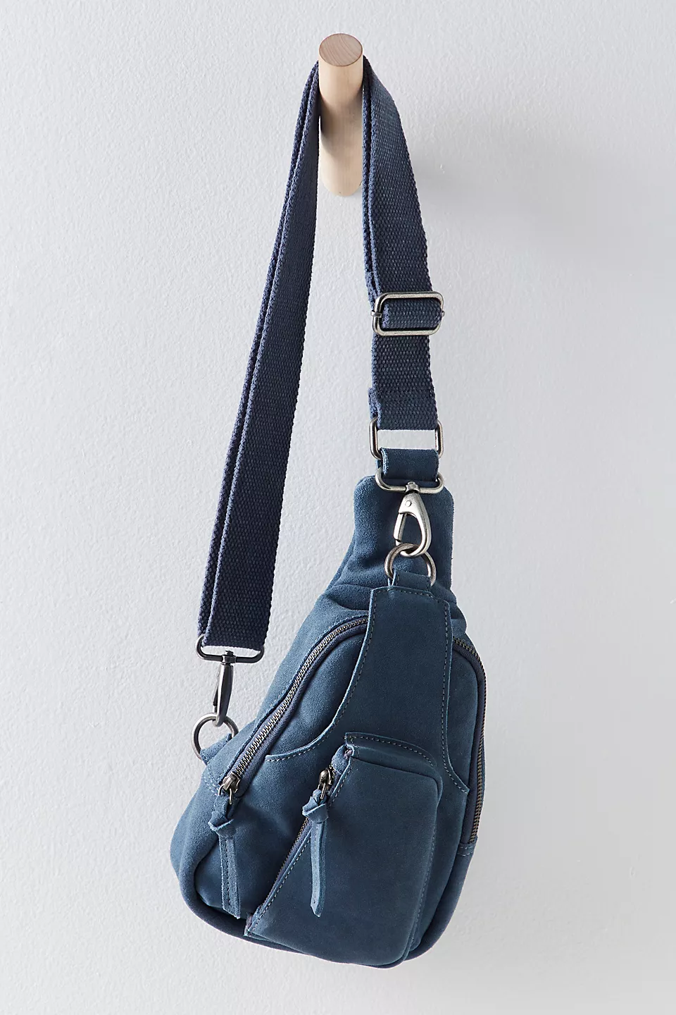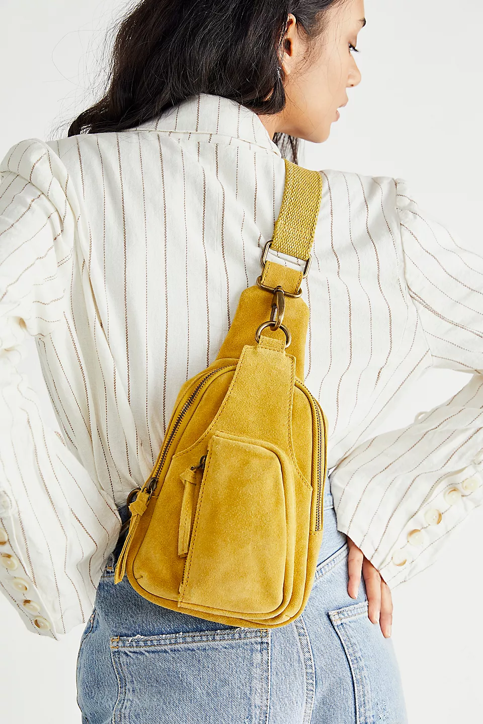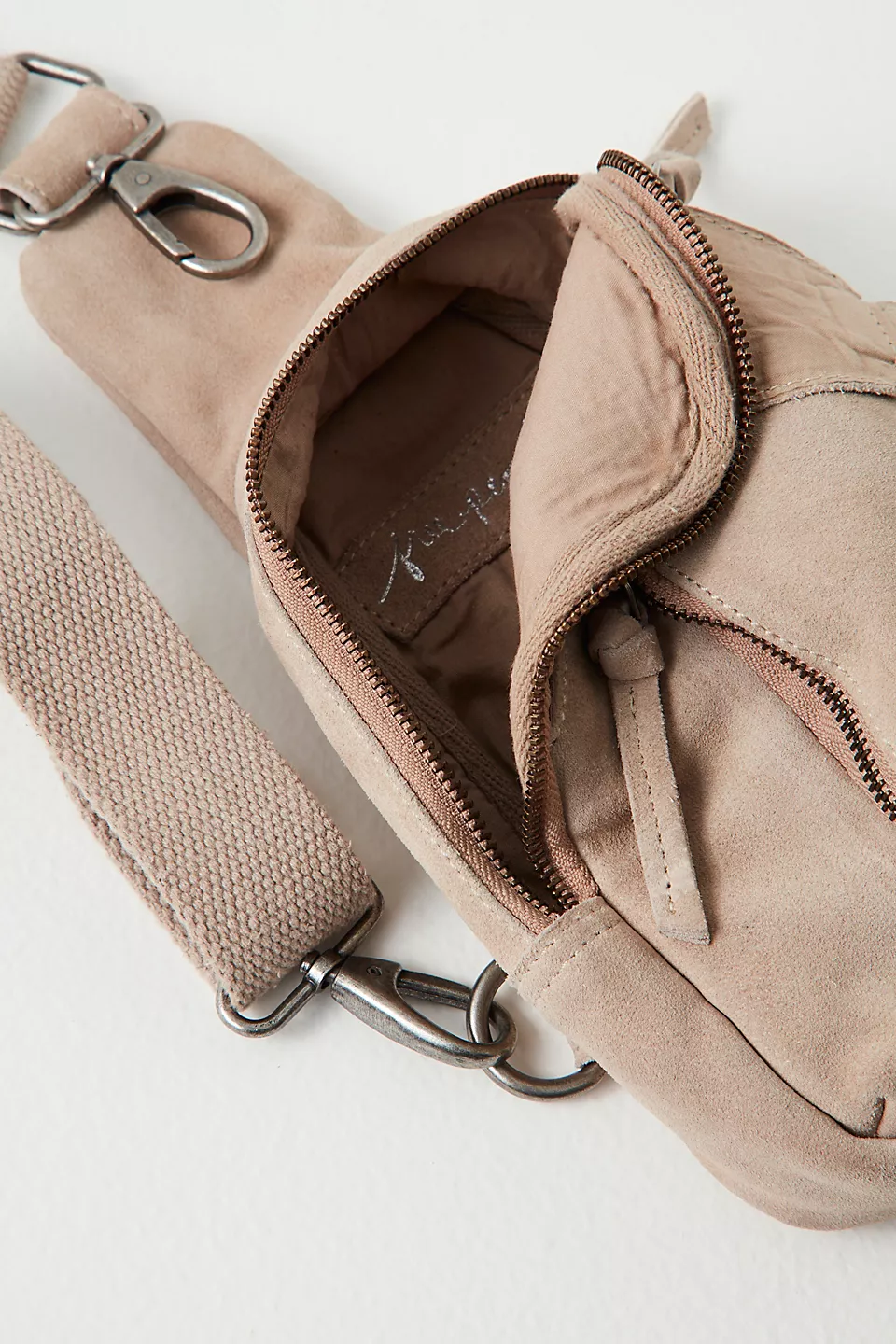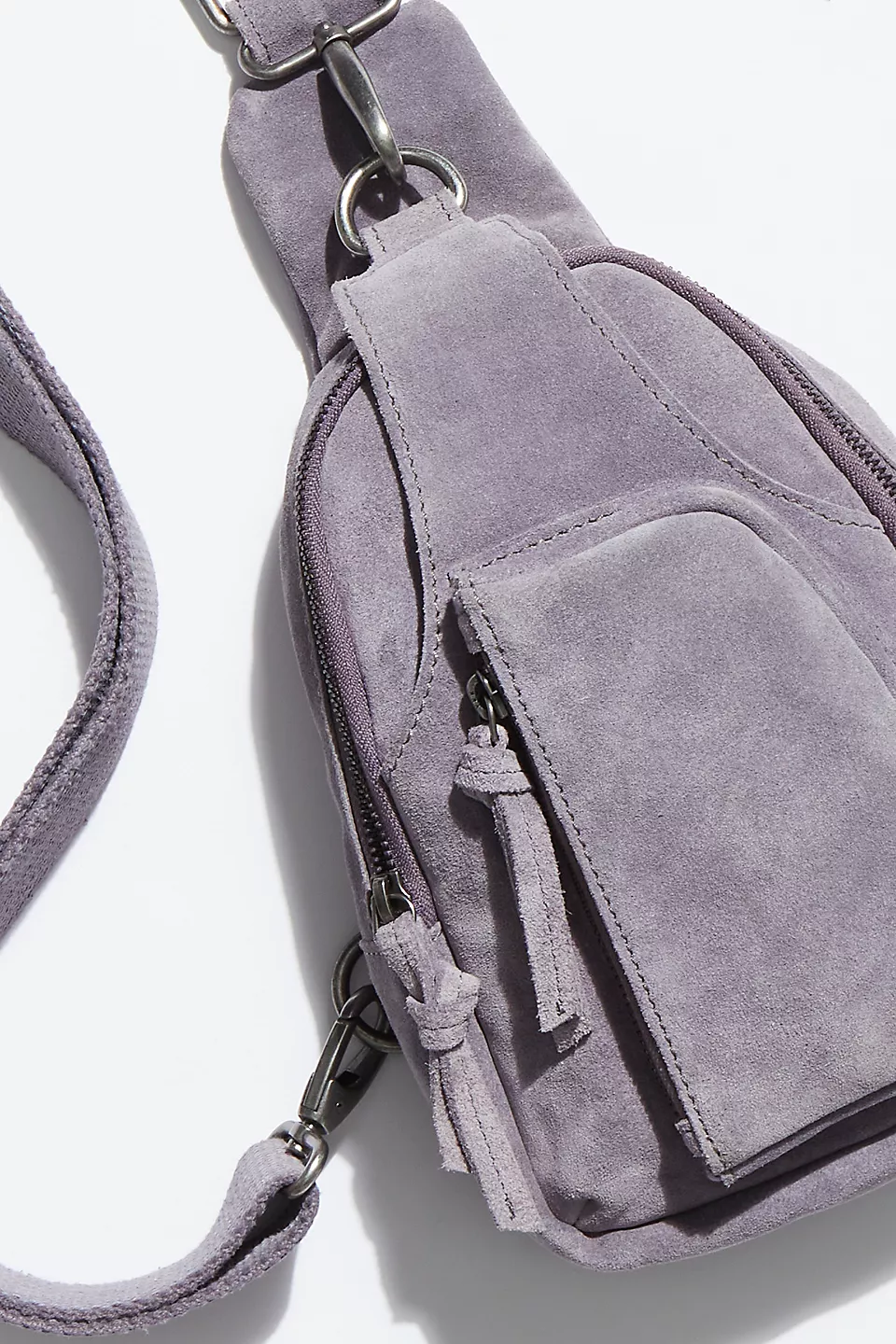 Shoulder the load with an of-the-moment sling bag, featured in a soft, velvety suede that is intentionally hand-finished.