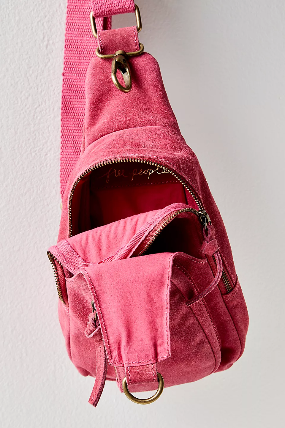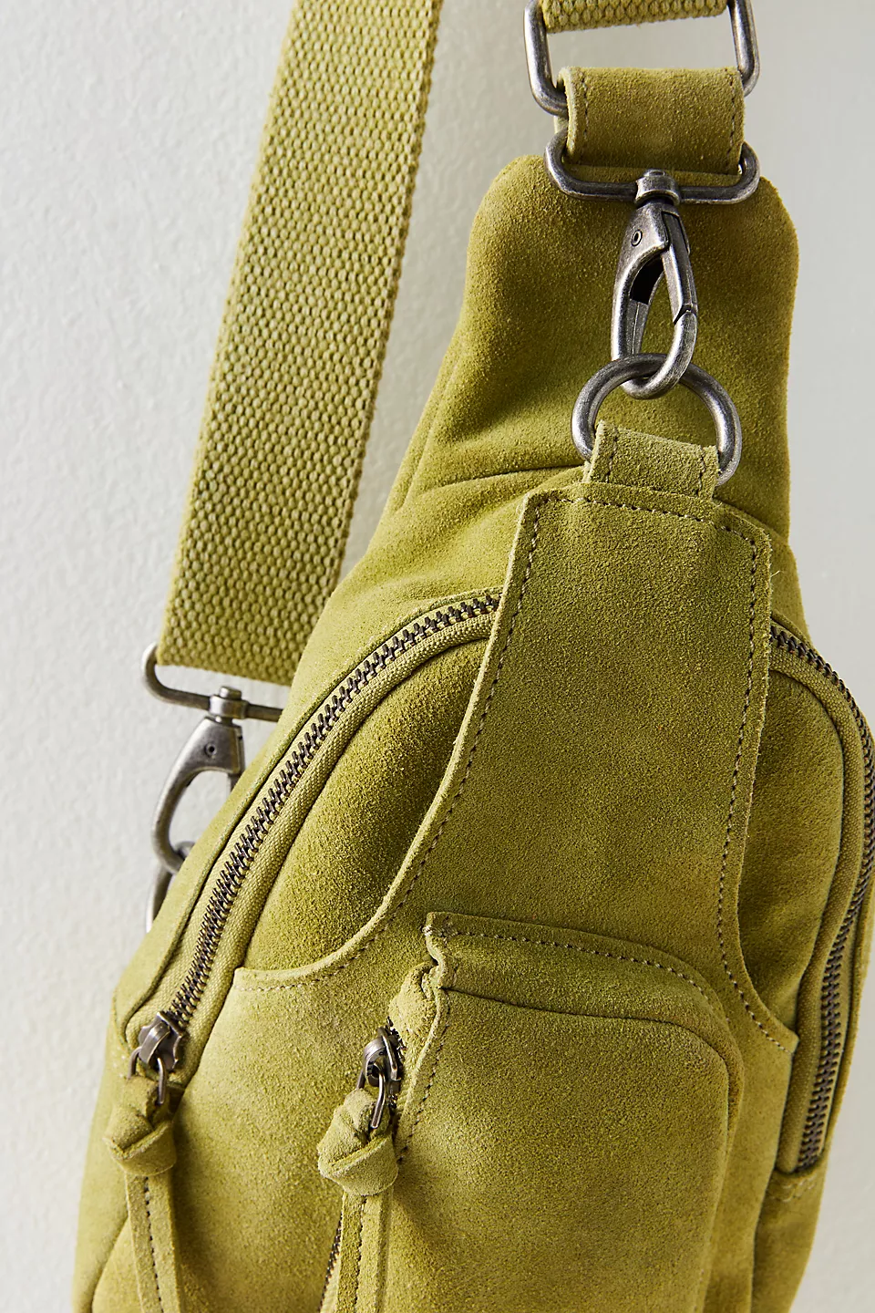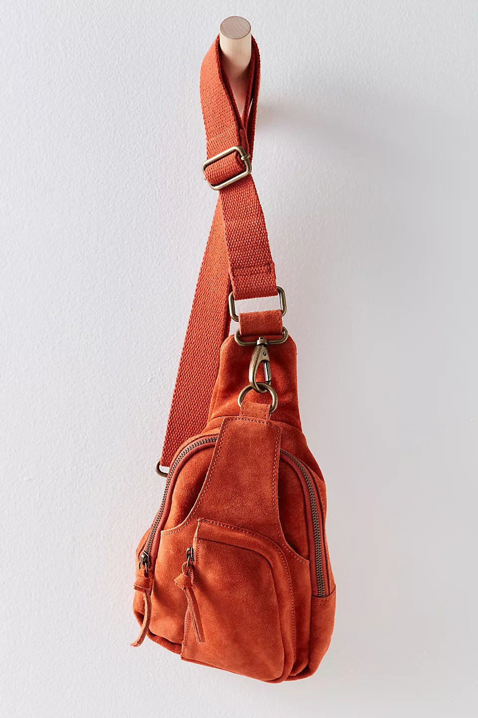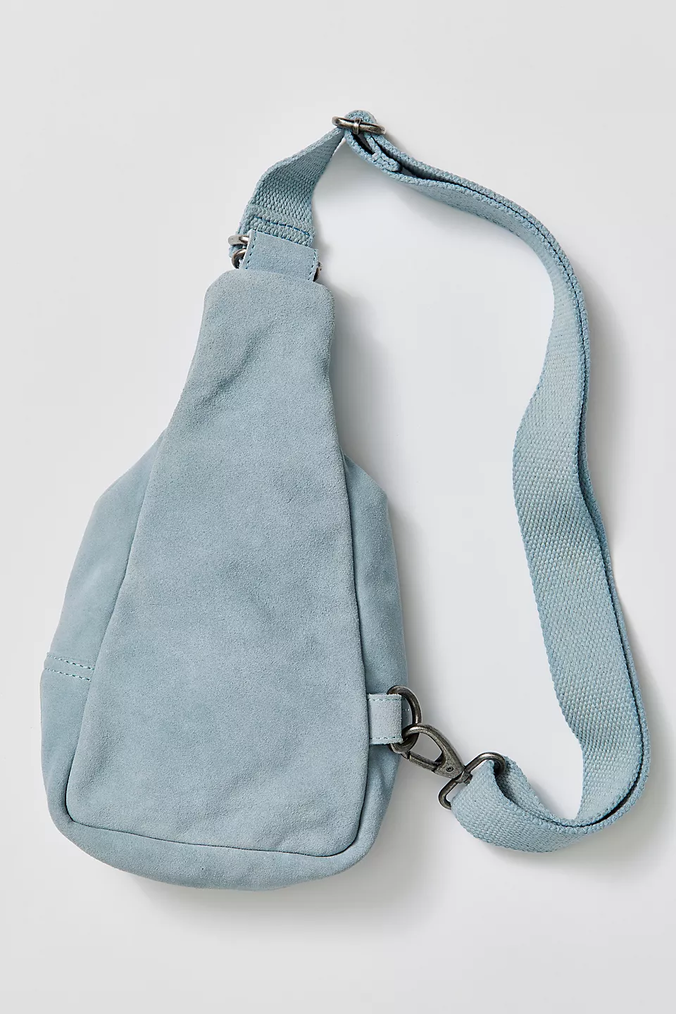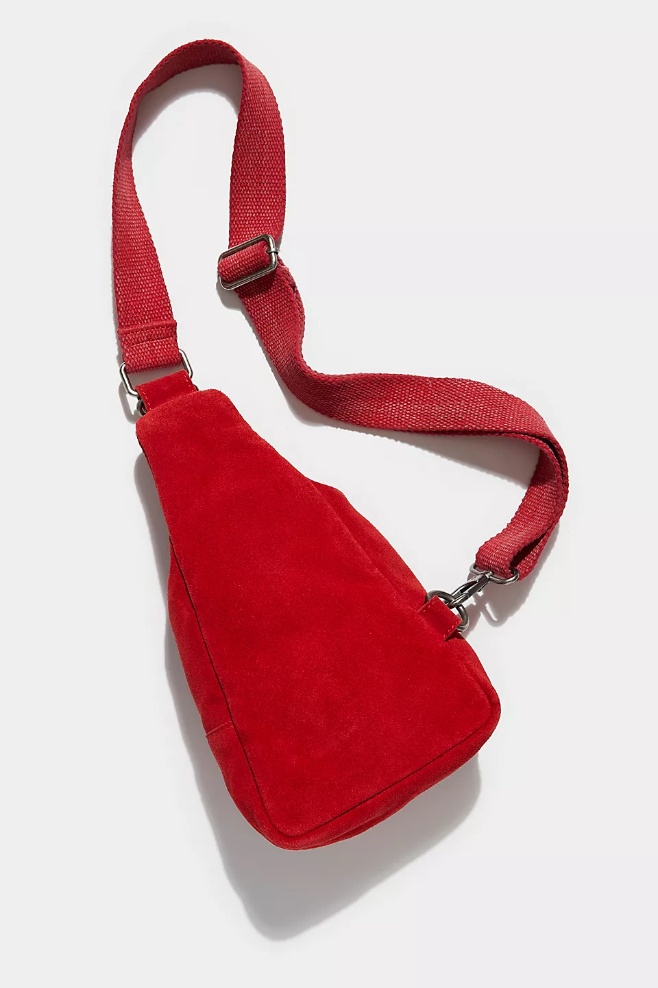 Shoulder the load with an of-the-moment sling bag, featured in a soft, velvety suede that is intentionally hand-finished.