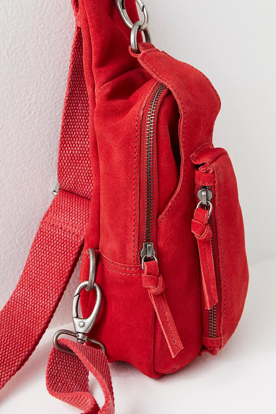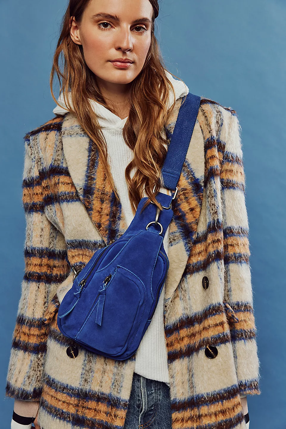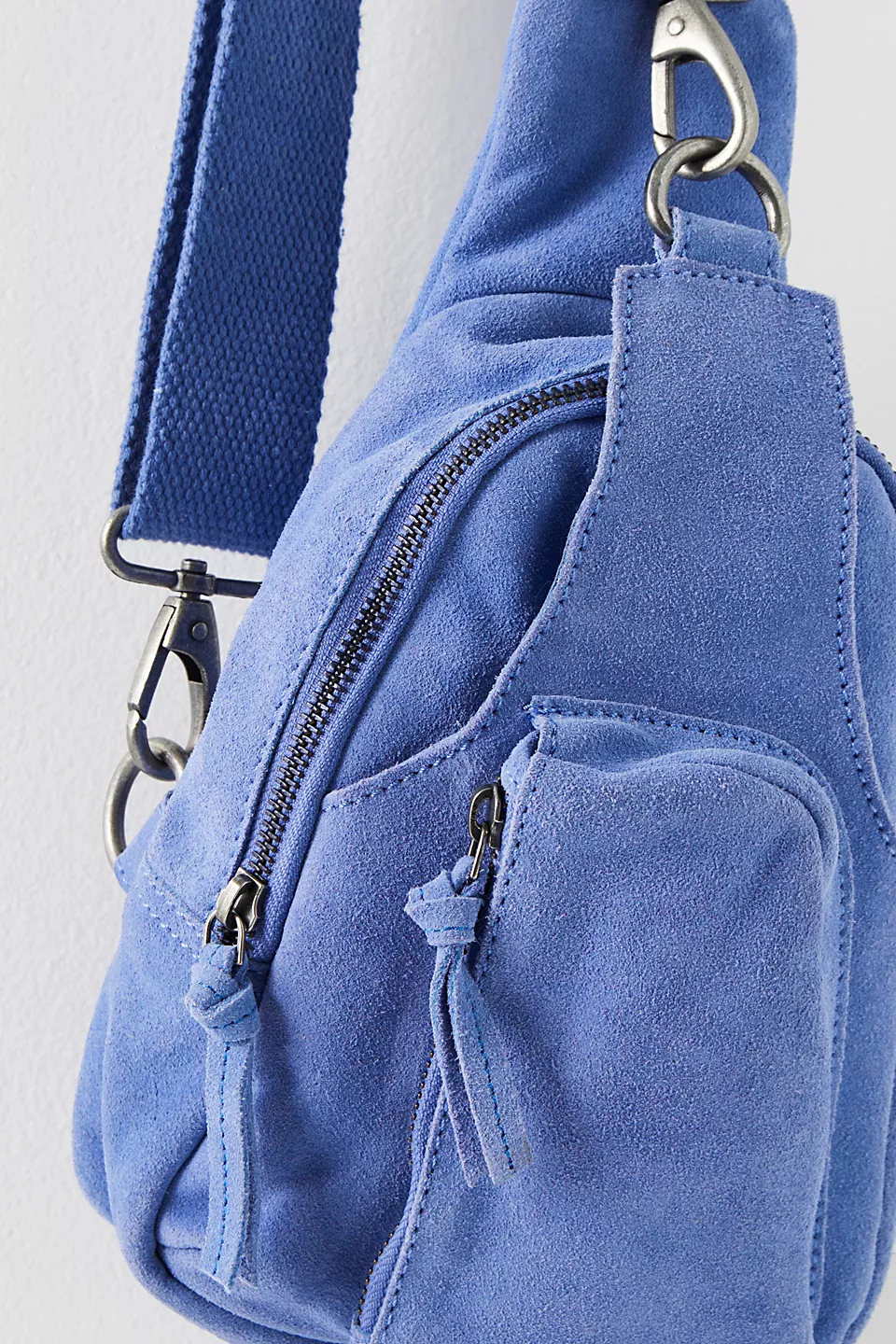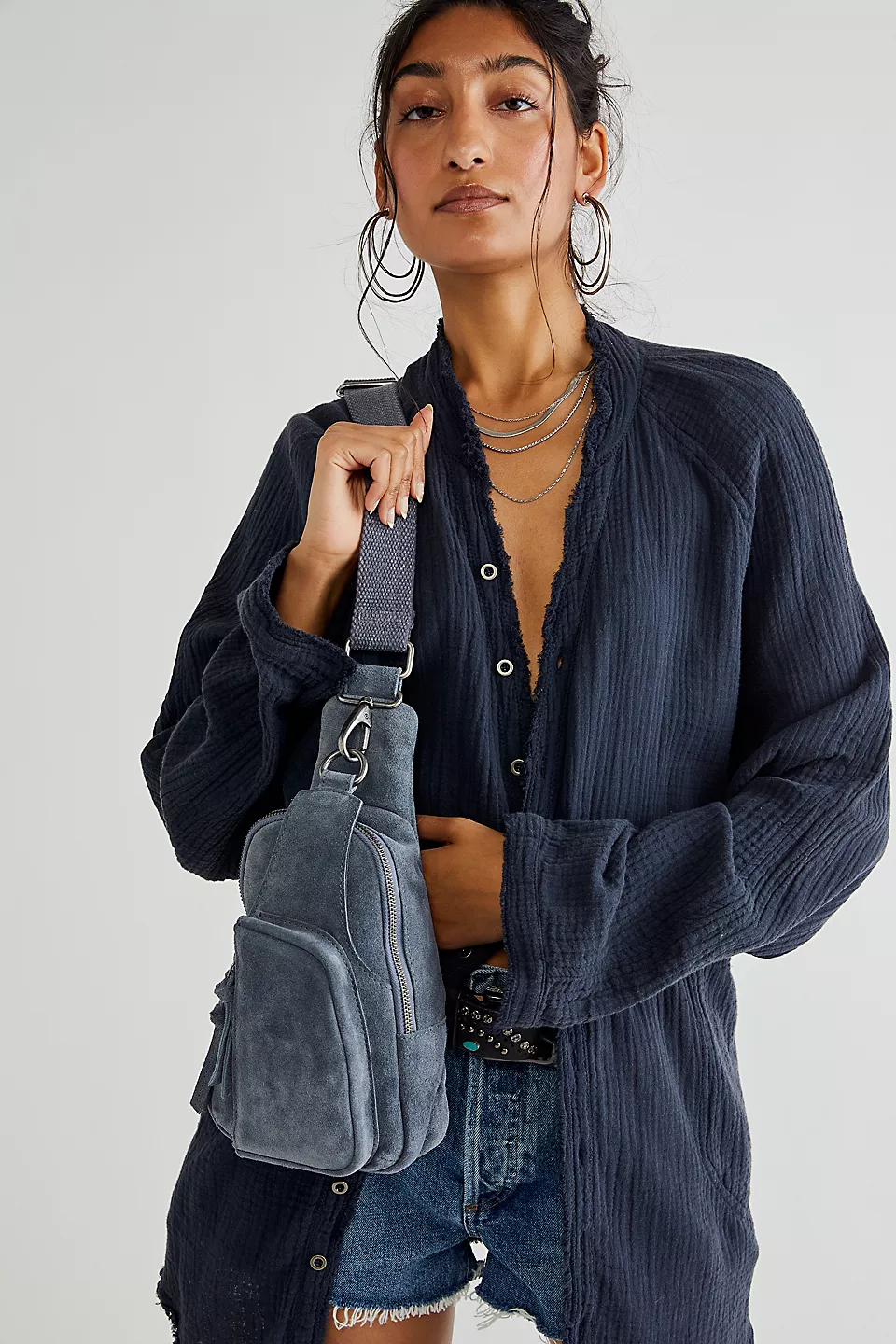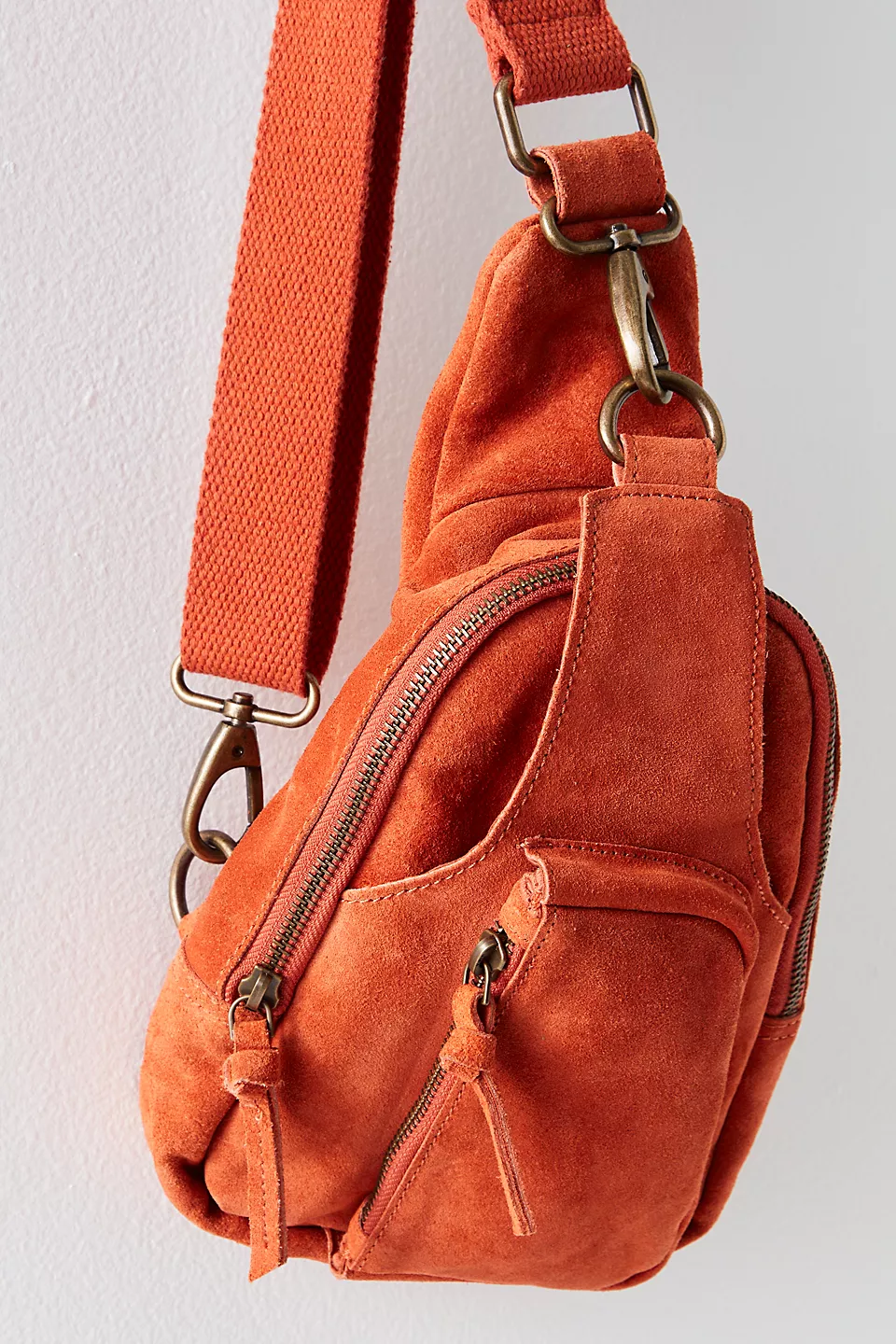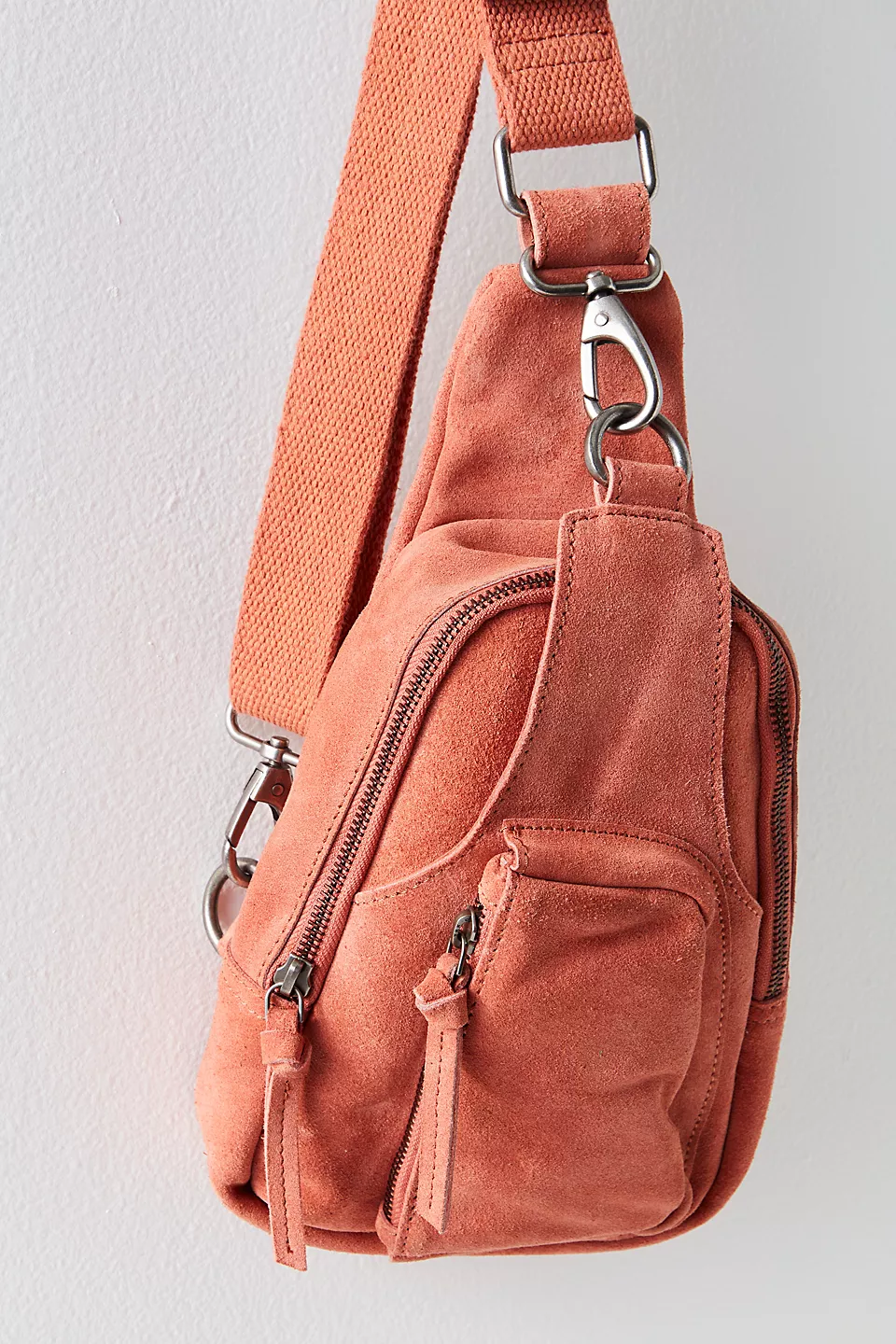 Shoulder the load with an of-the-moment sling bag, featured in a soft, velvety suede that is intentionally hand-finished.