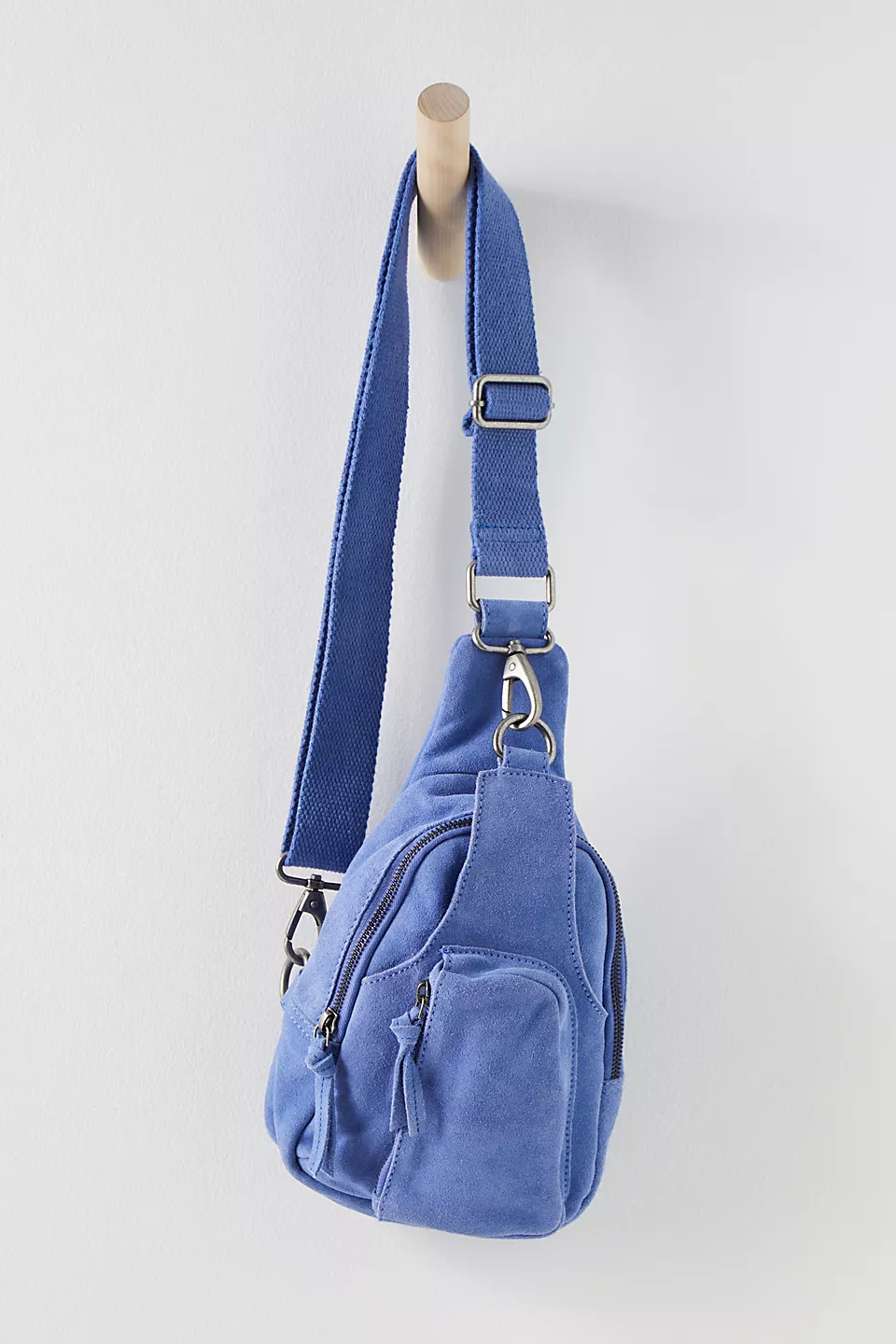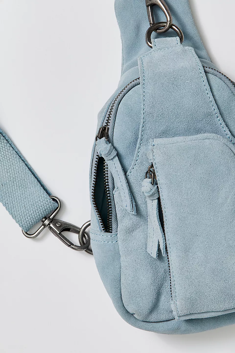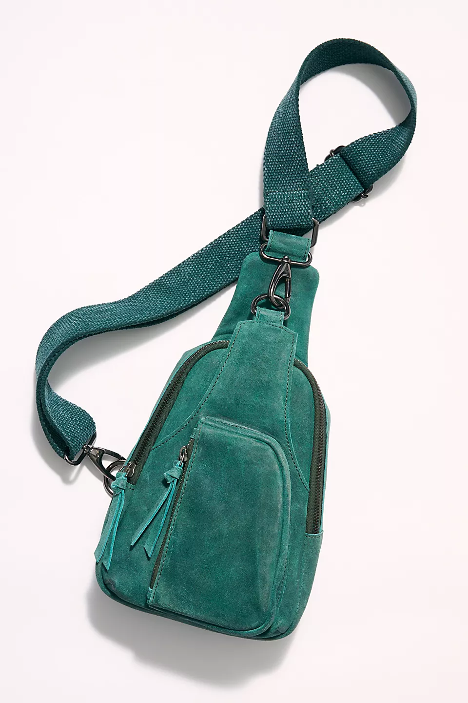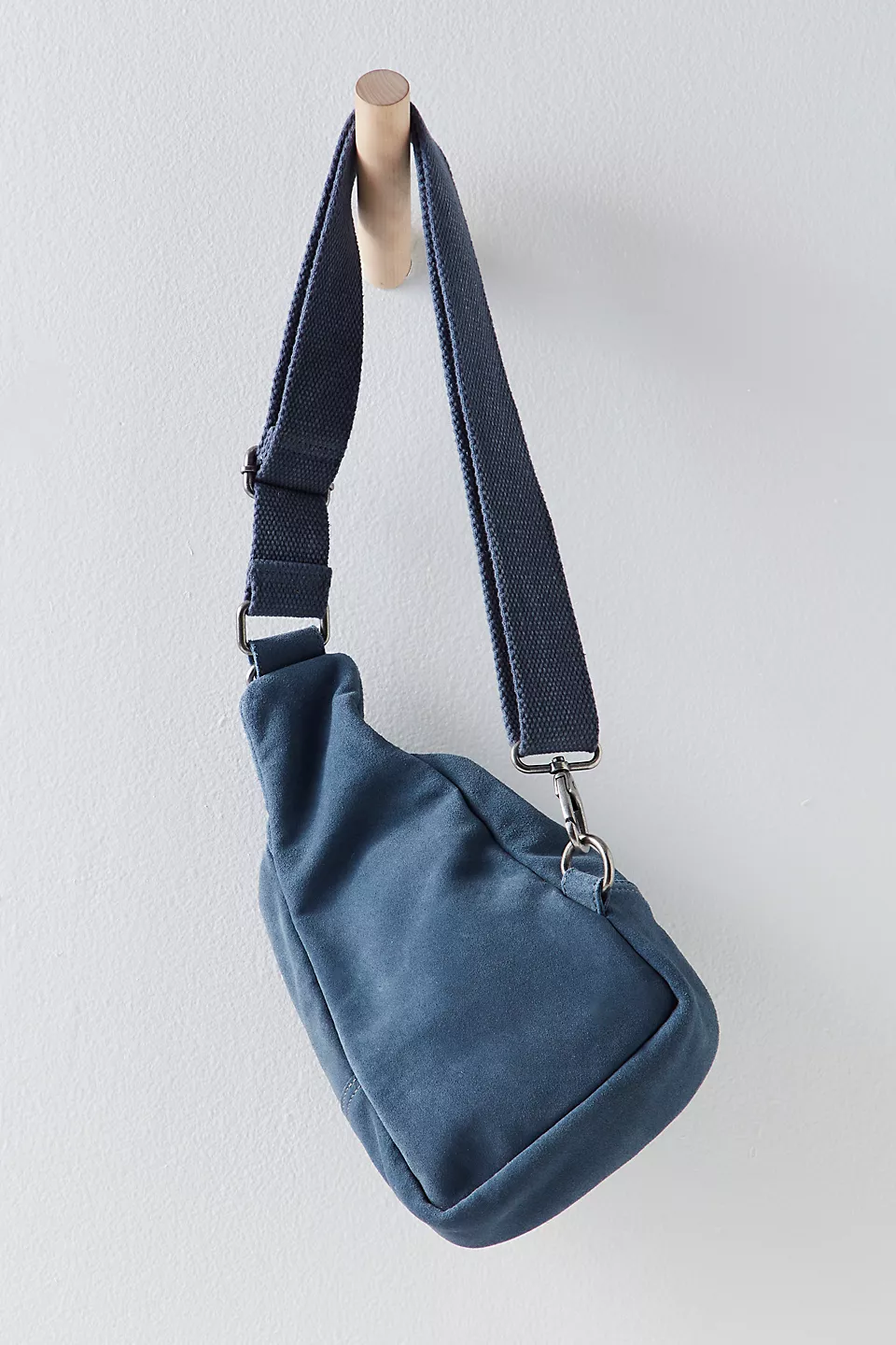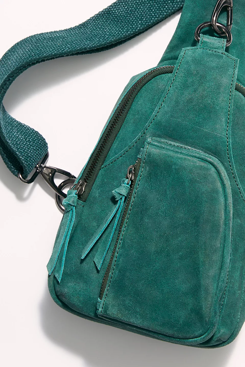 Shoulder the load with an of-the-moment sling bag, featured in a soft, velvety suede that is intentionally hand-finished.