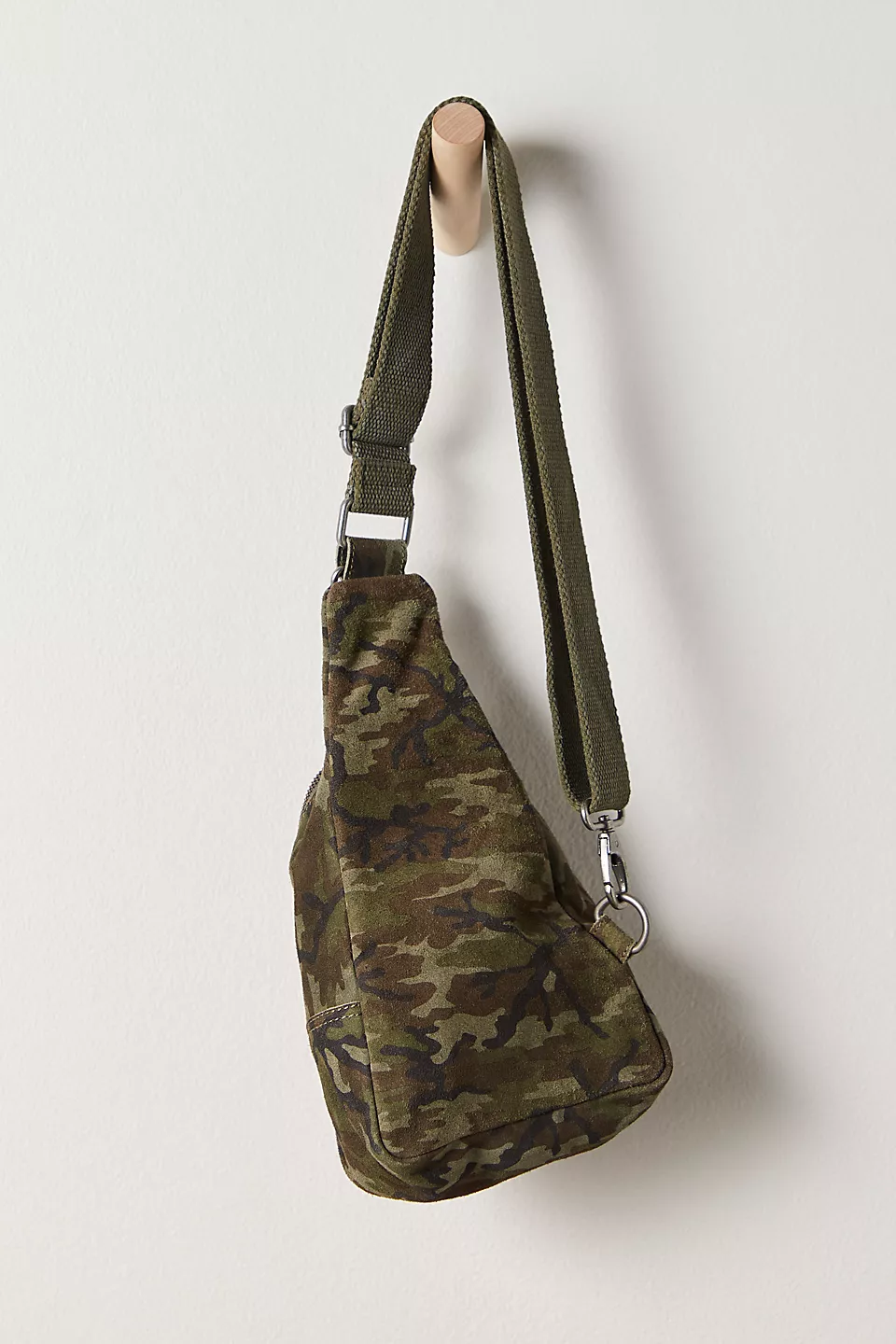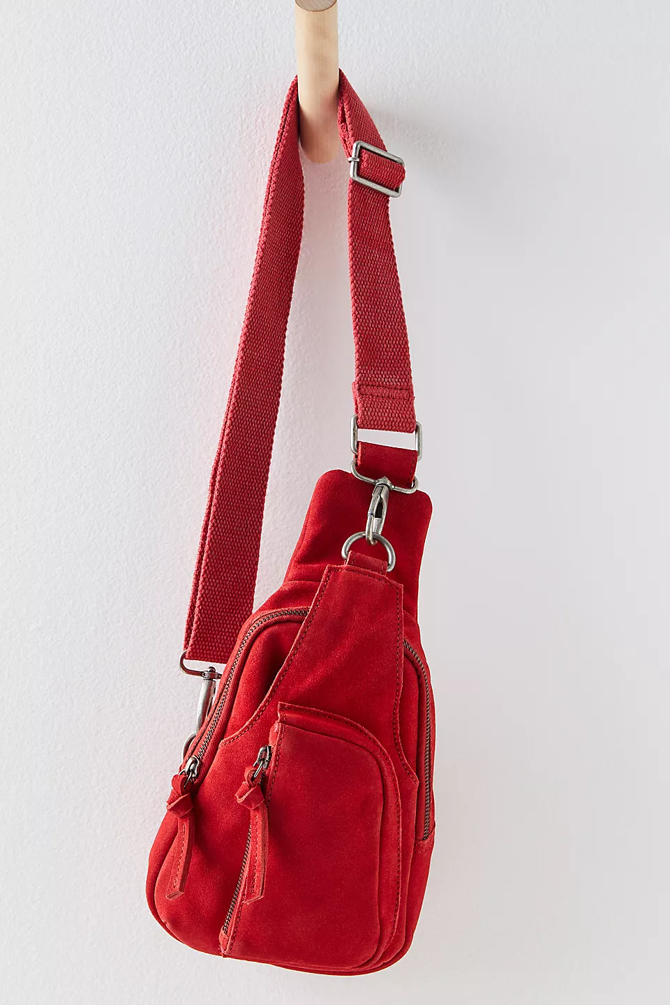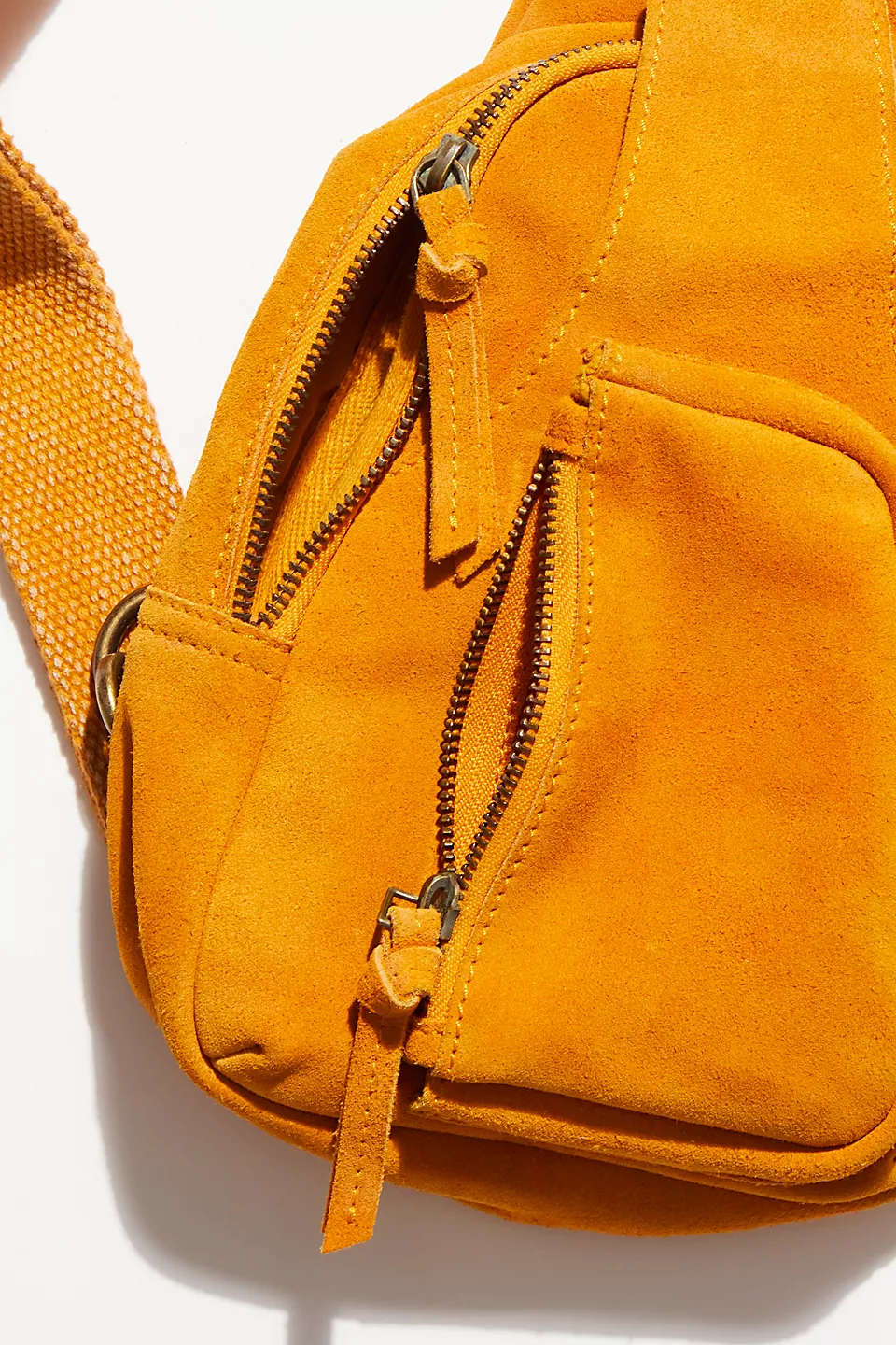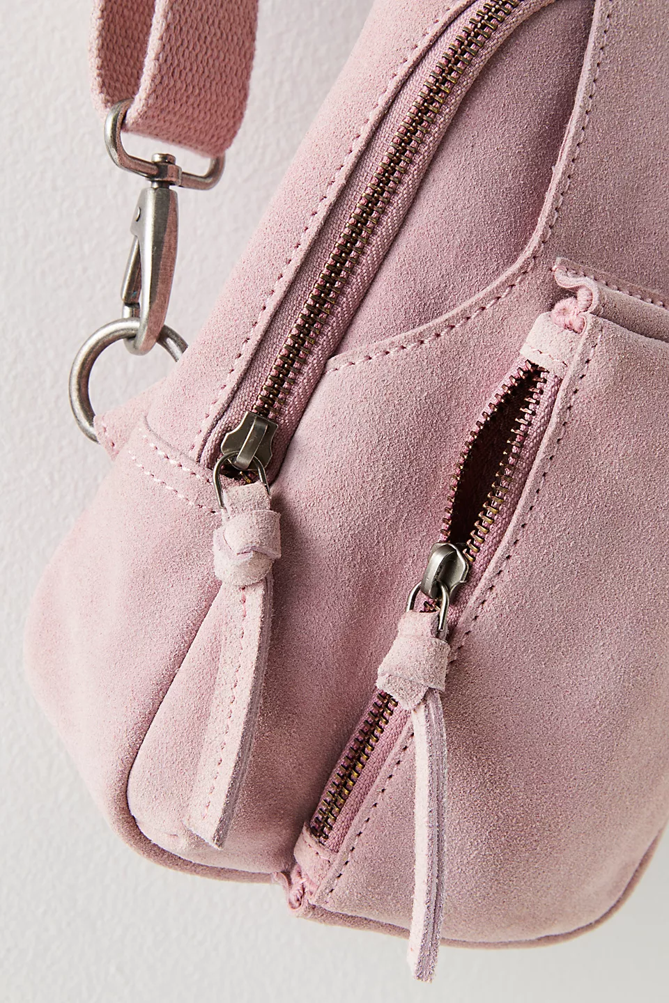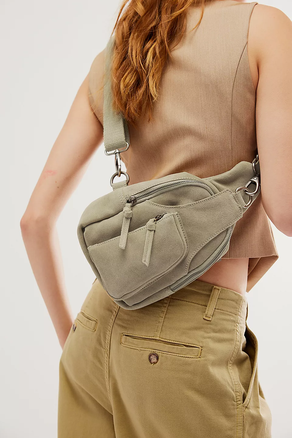 Shoulder the load with an of-the-moment sling bag, featured in a soft, velvety suede that is intentionally hand-finished.