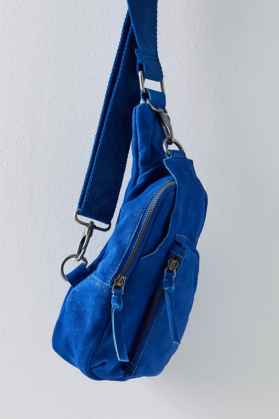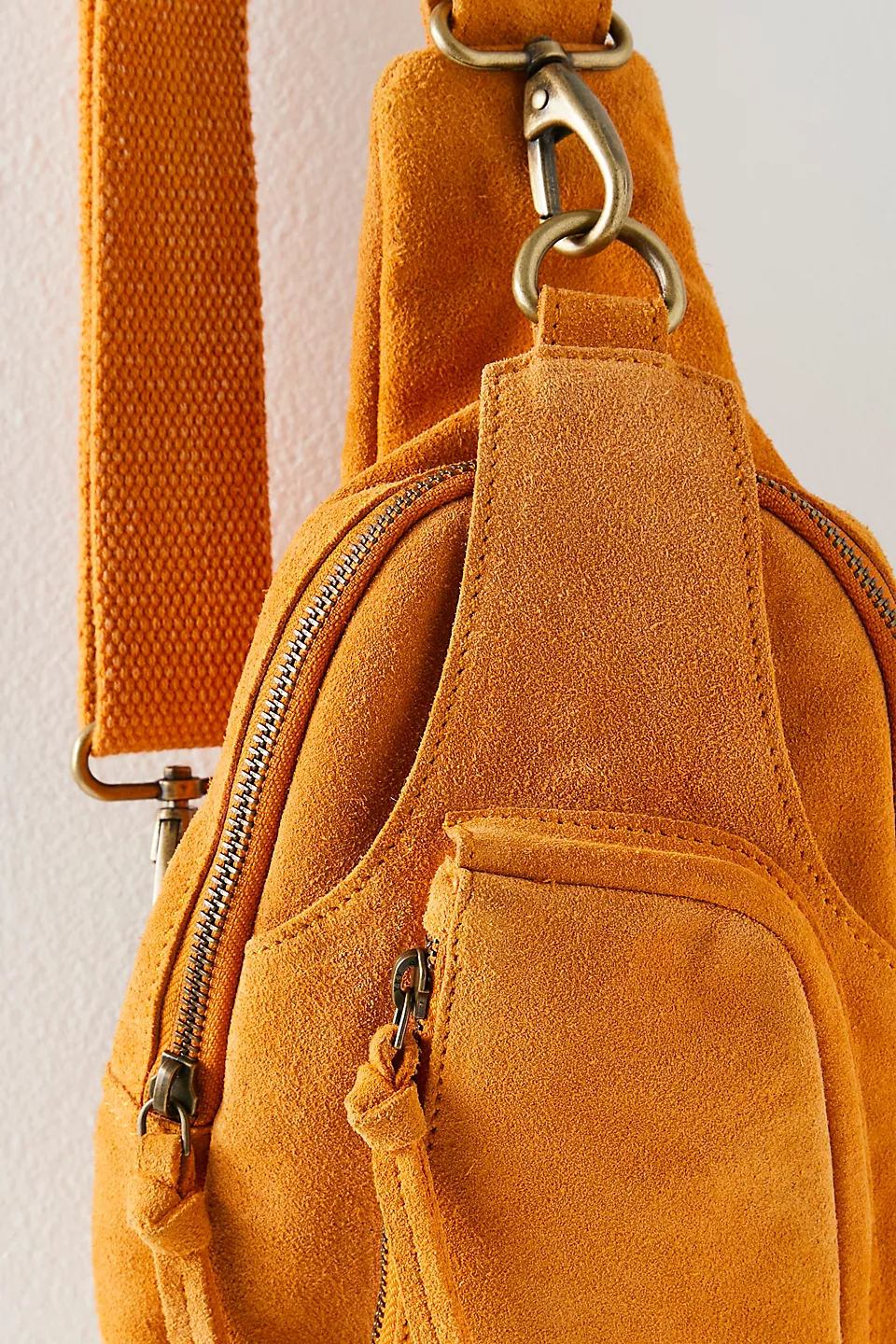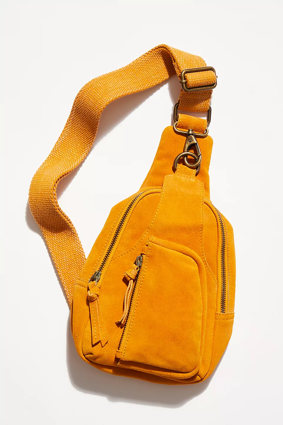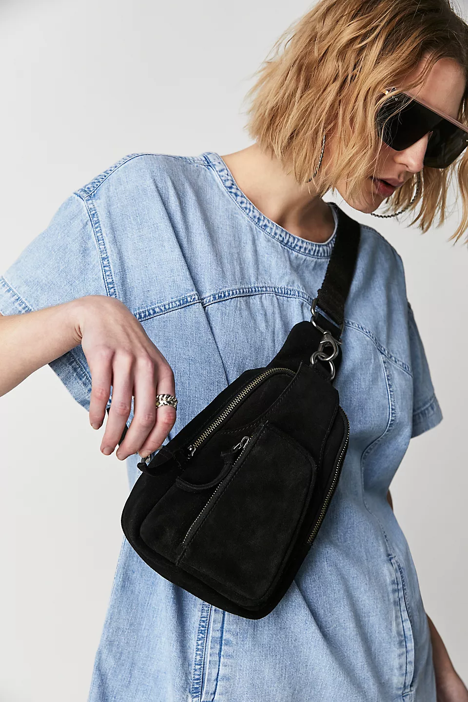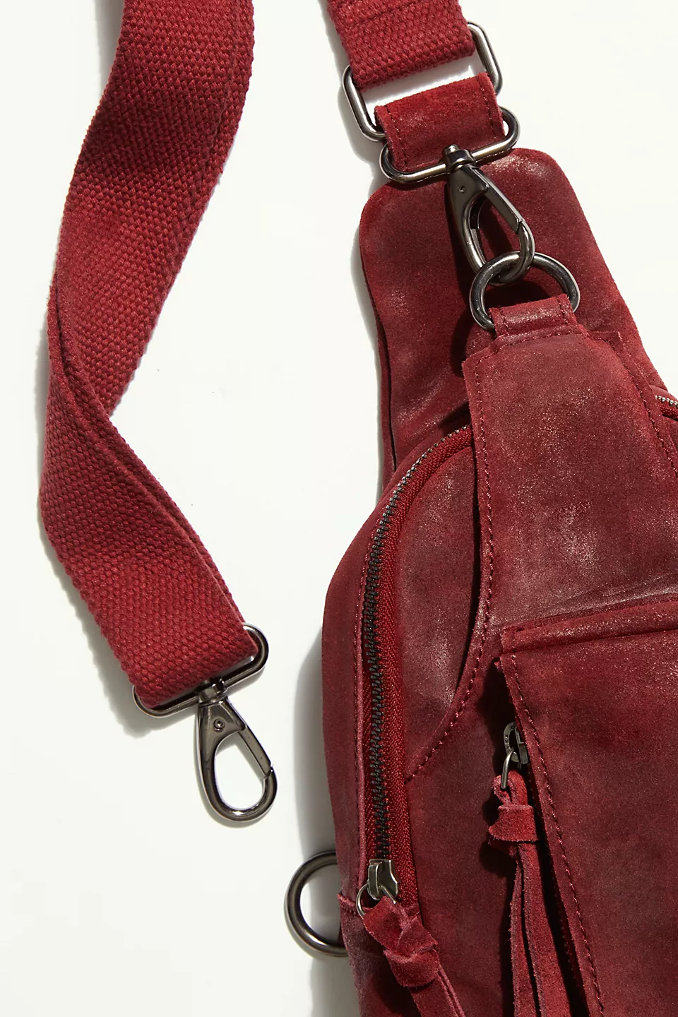 Shoulder the load with an of-the-moment sling bag, featured in a soft, velvety suede that is intentionally hand-finished.
