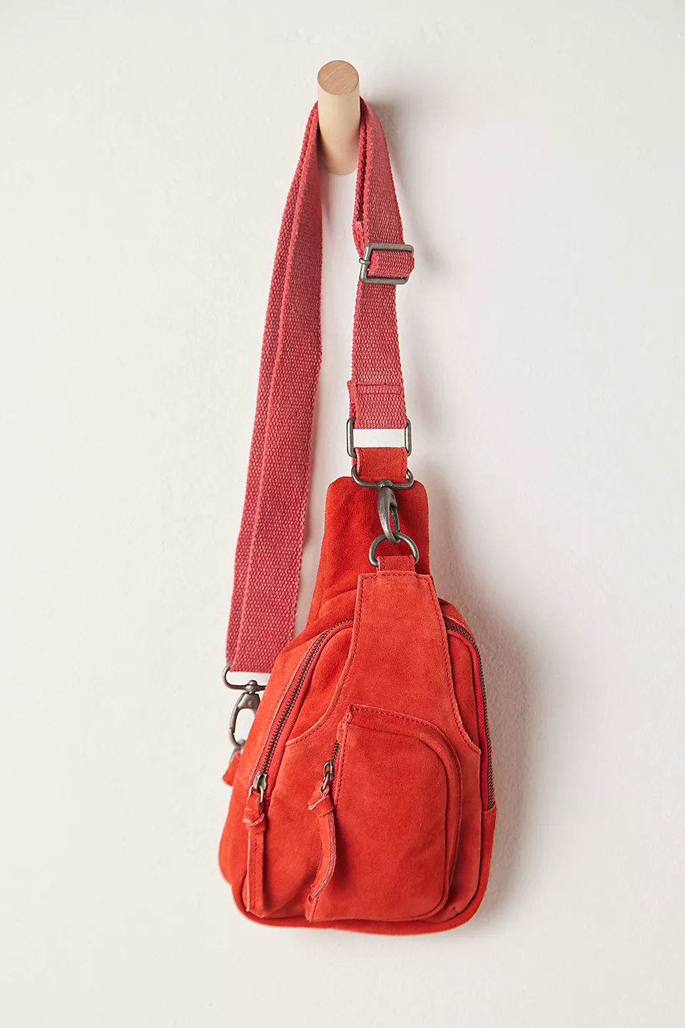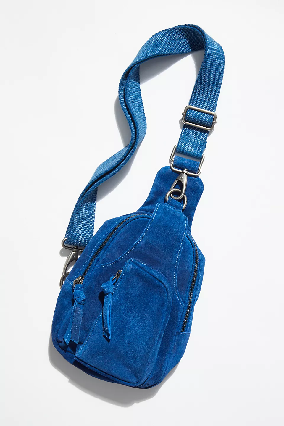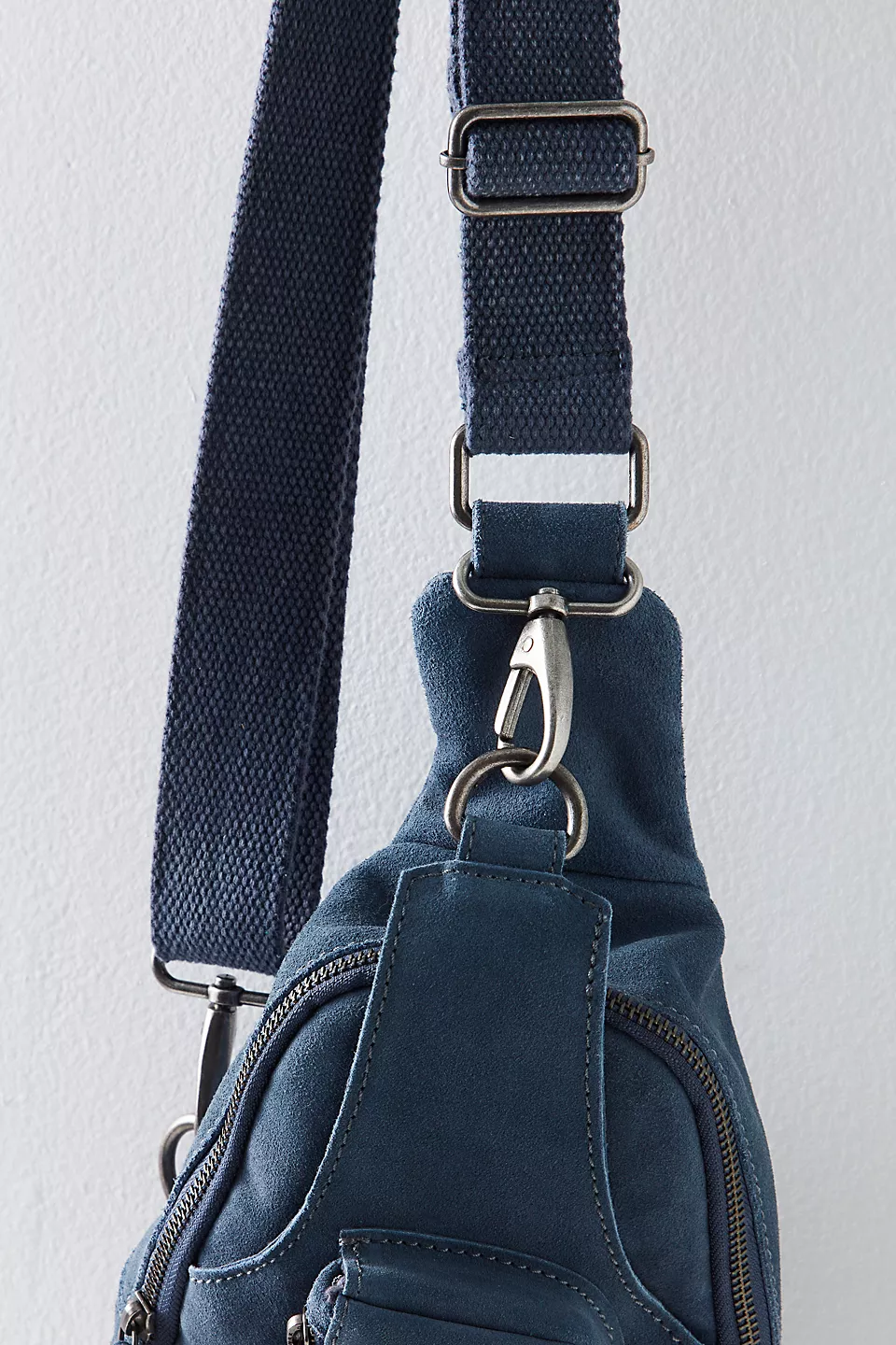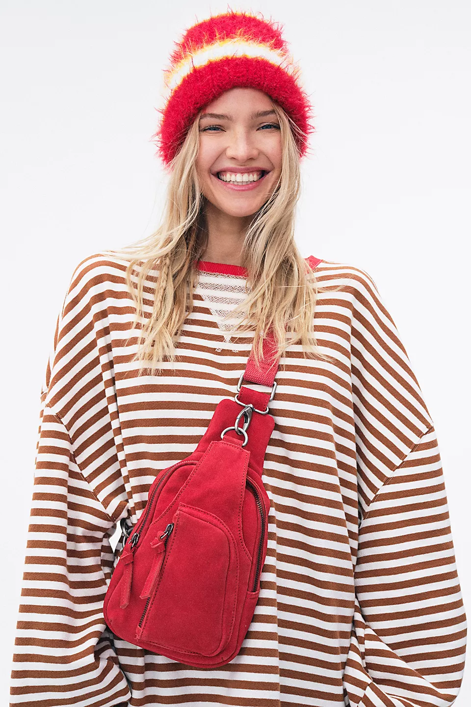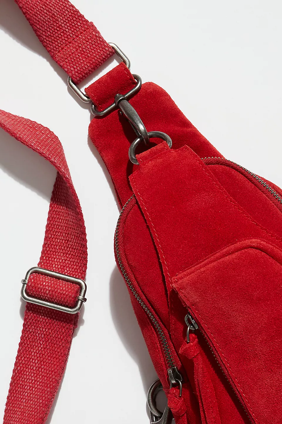 Shoulder the load with an of-the-moment sling bag, featured in a soft, velvety suede that is intentionally hand-finished.