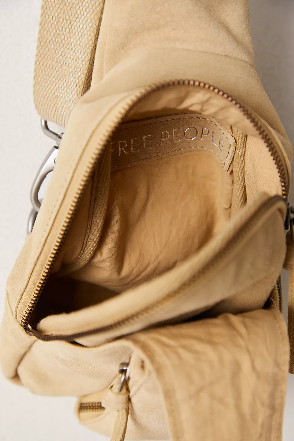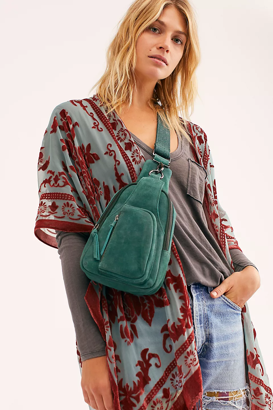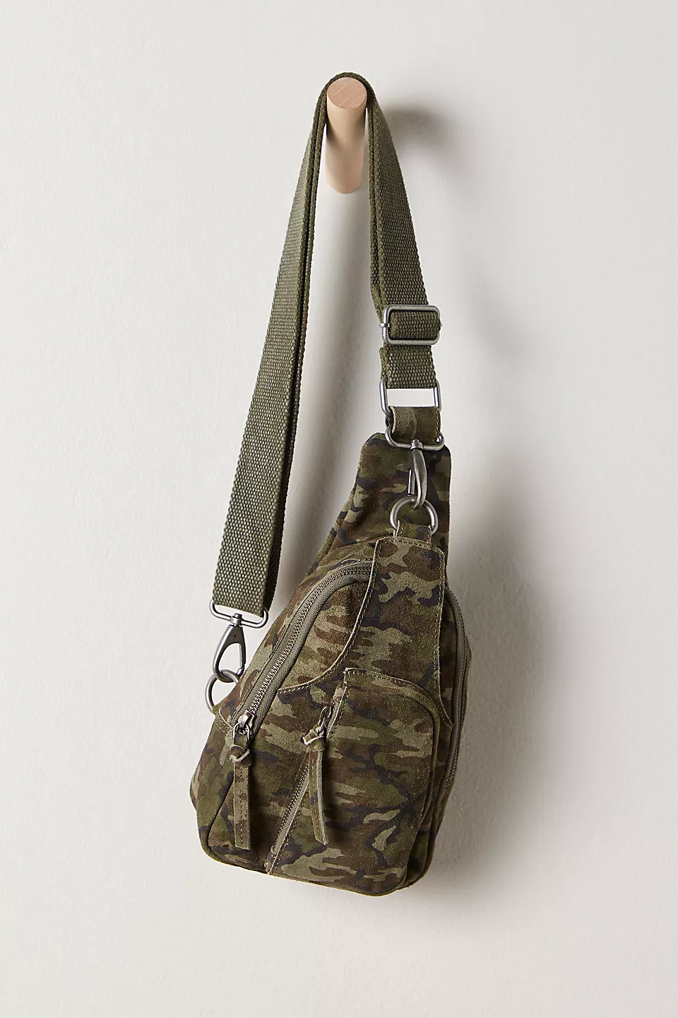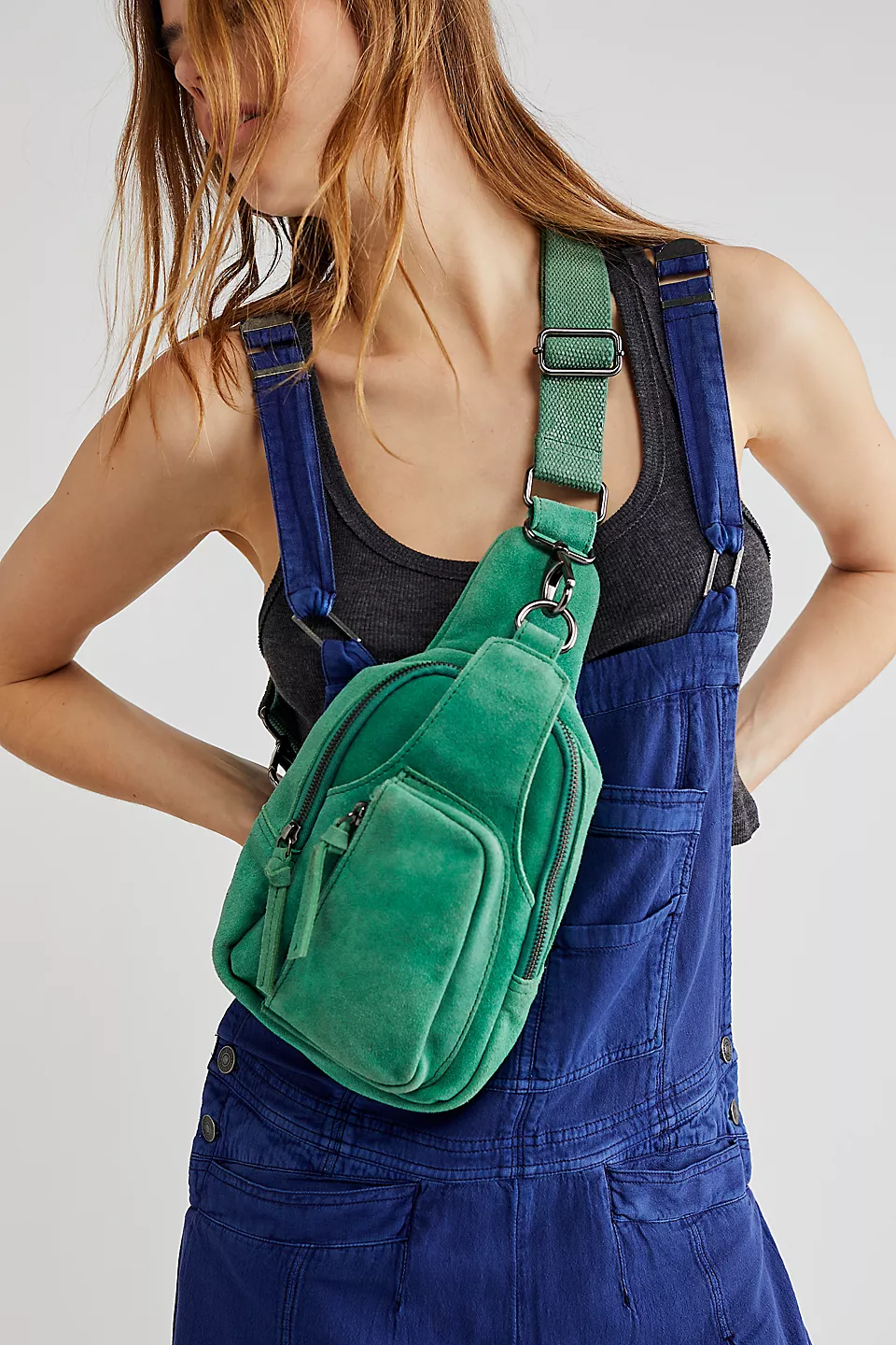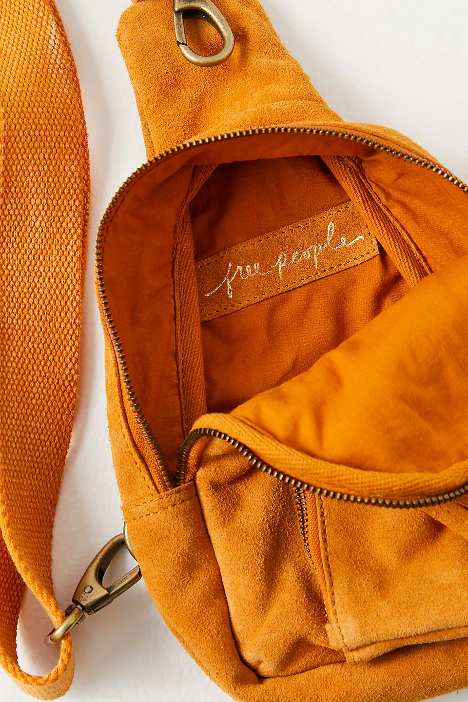 Shoulder the load with an of-the-moment sling bag, featured in a soft, velvety suede that is intentionally hand-finished.