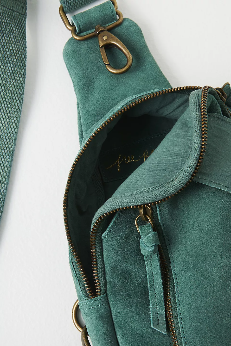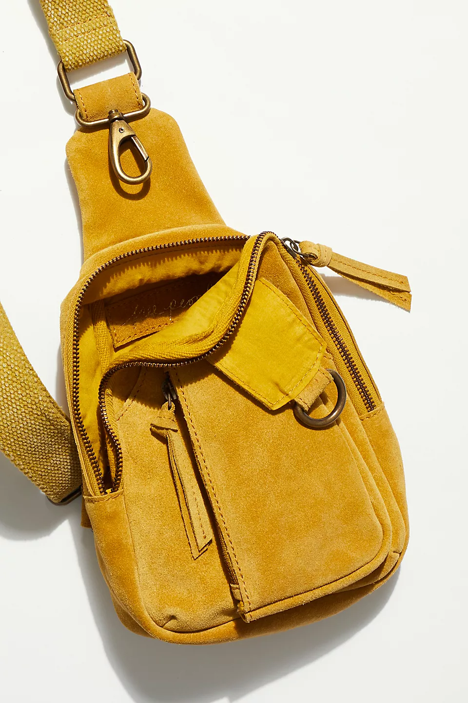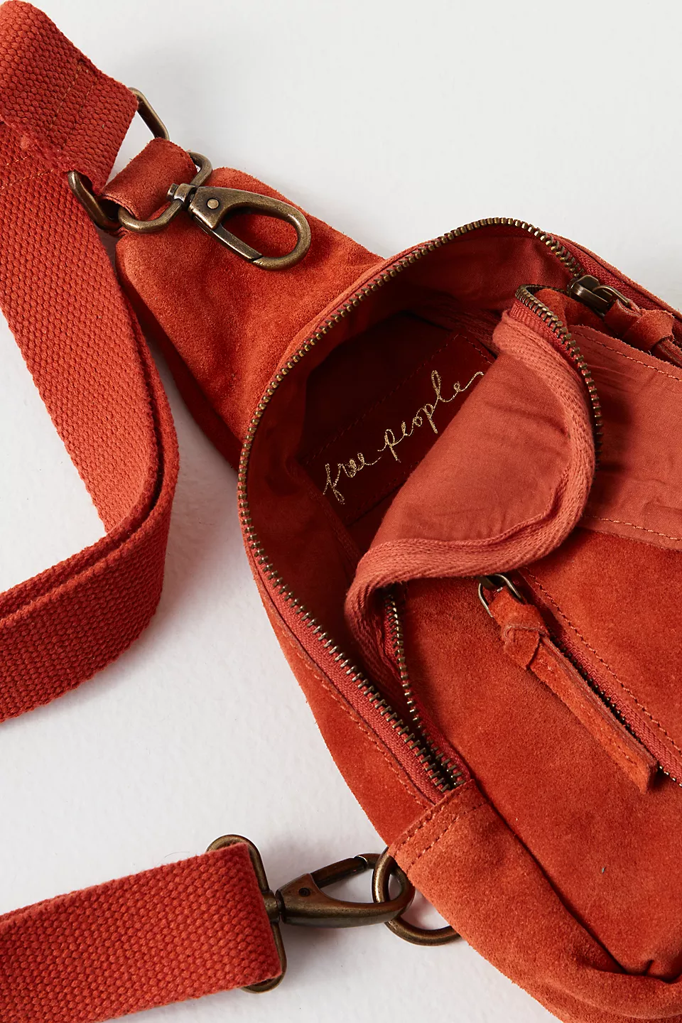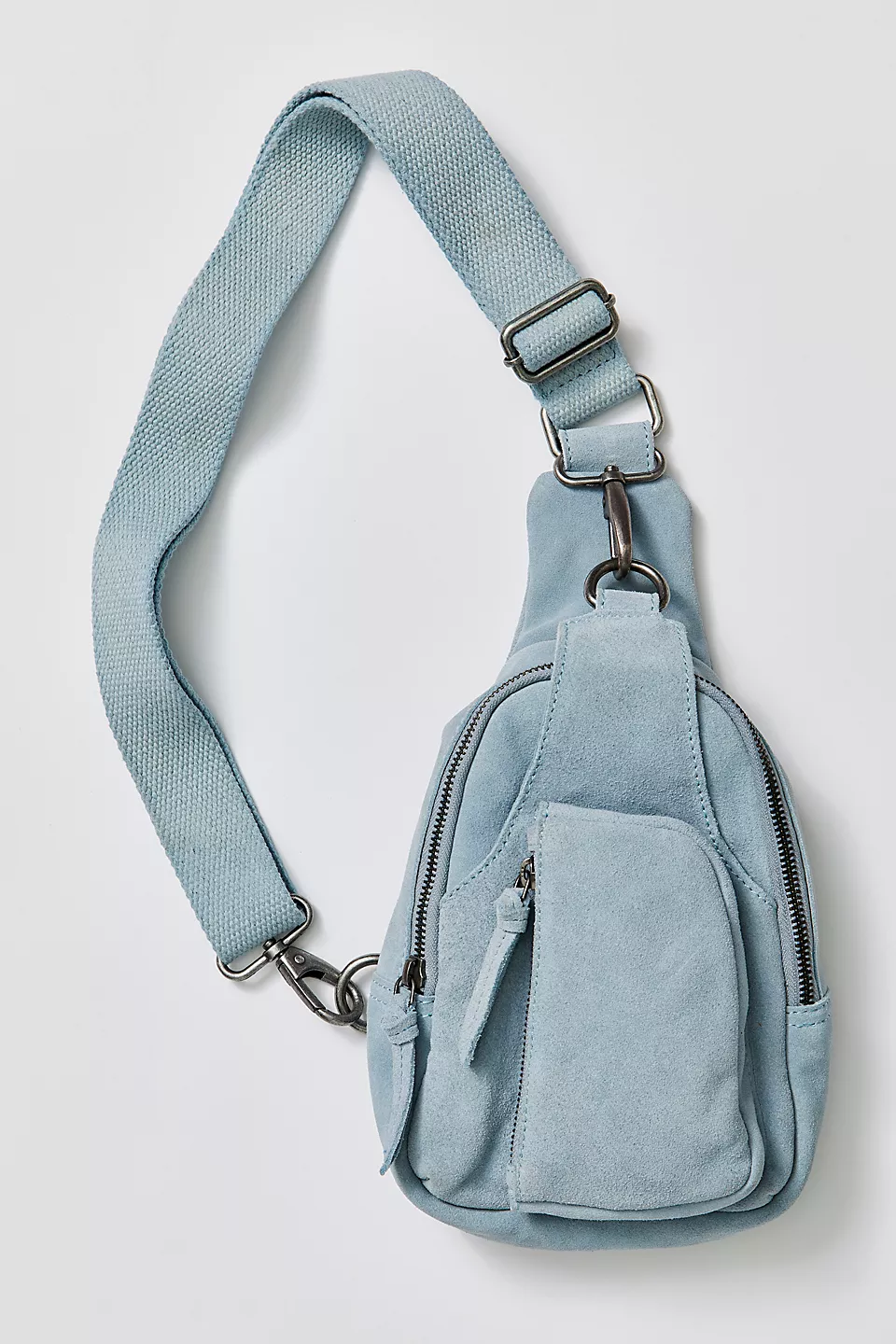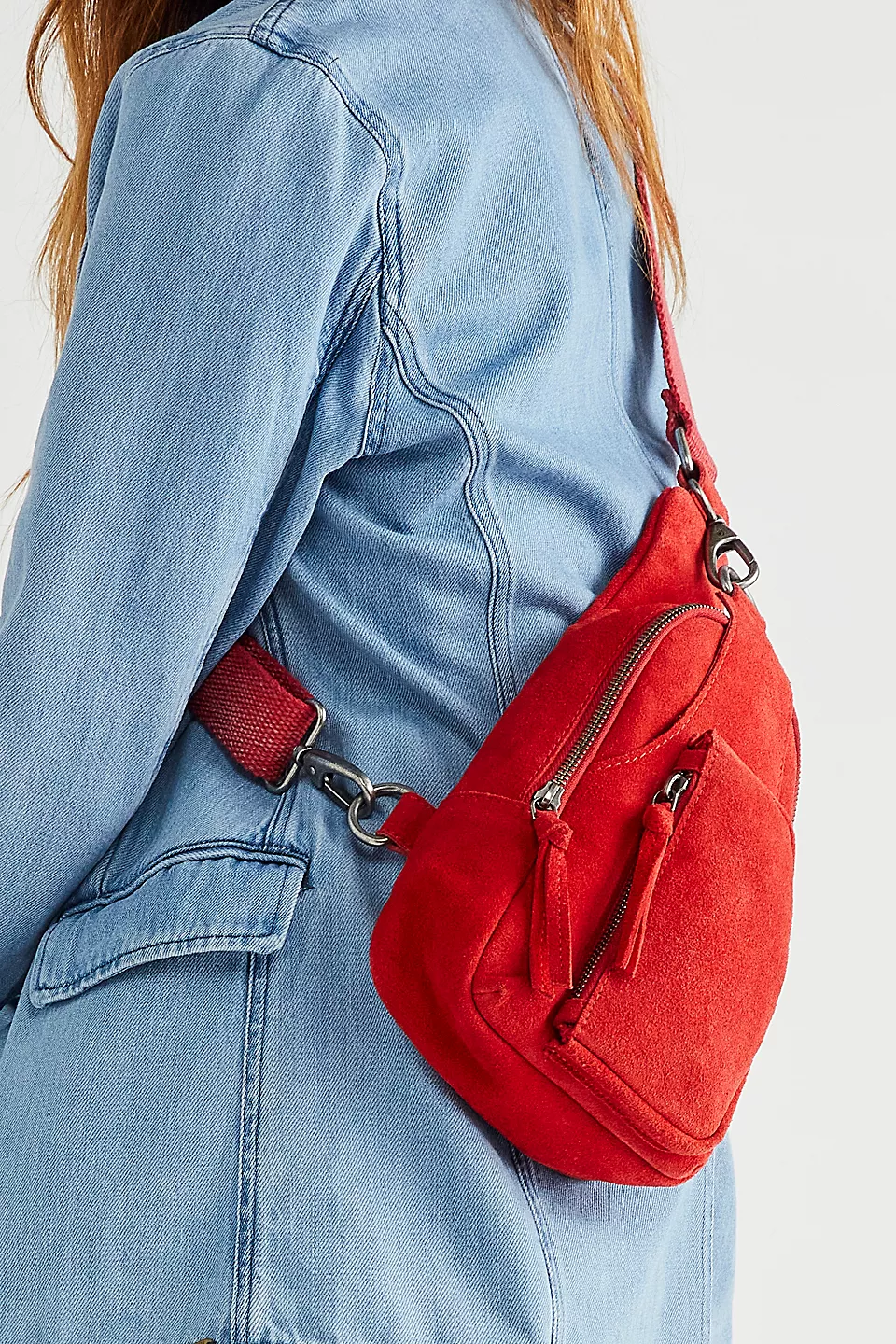Shoulder the load with an of-the-moment sling bag, featured in a soft, velvety suede that is intentionally hand-finished.