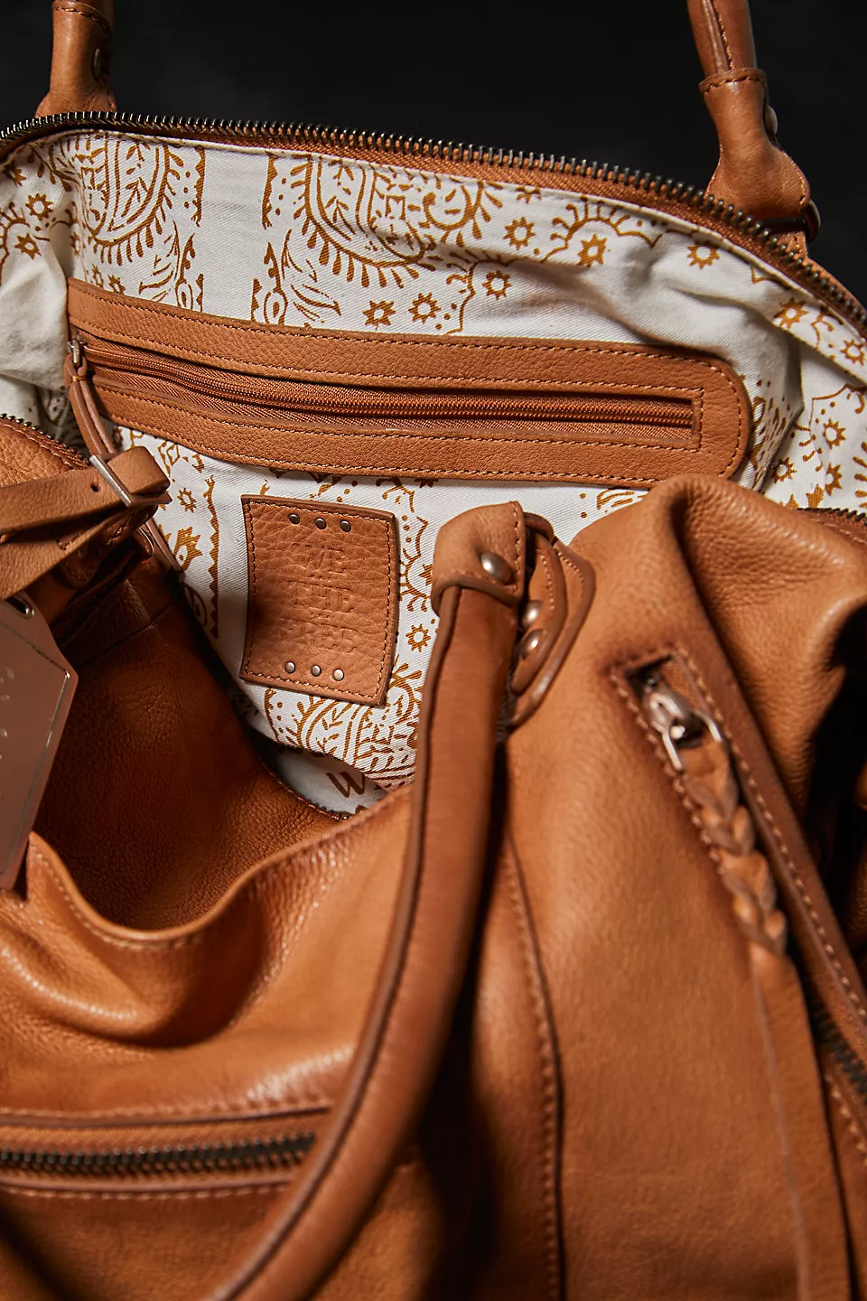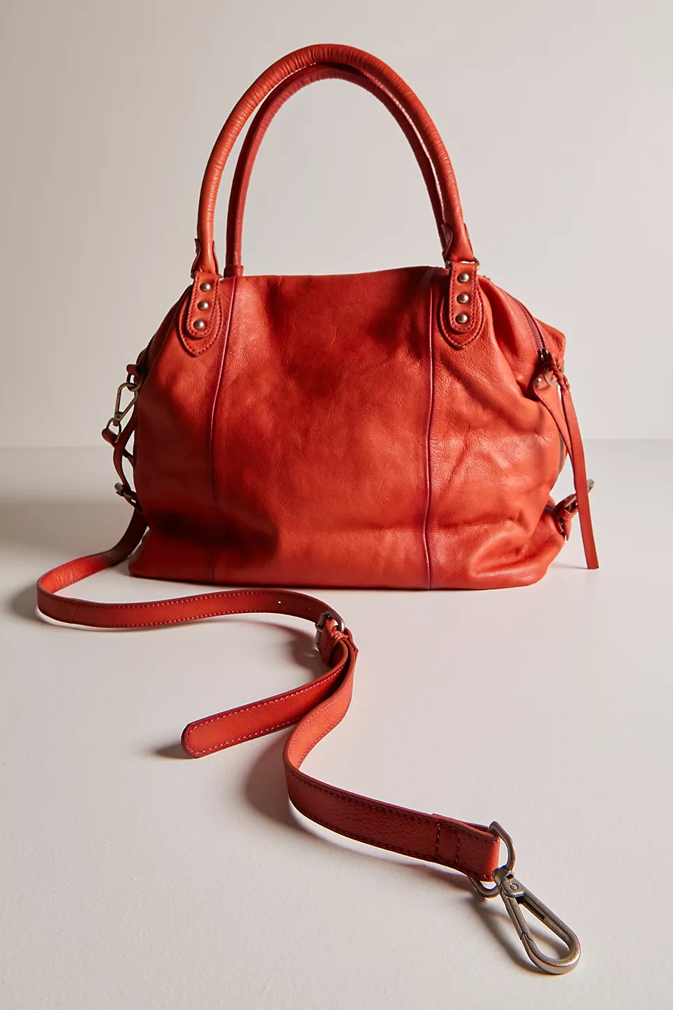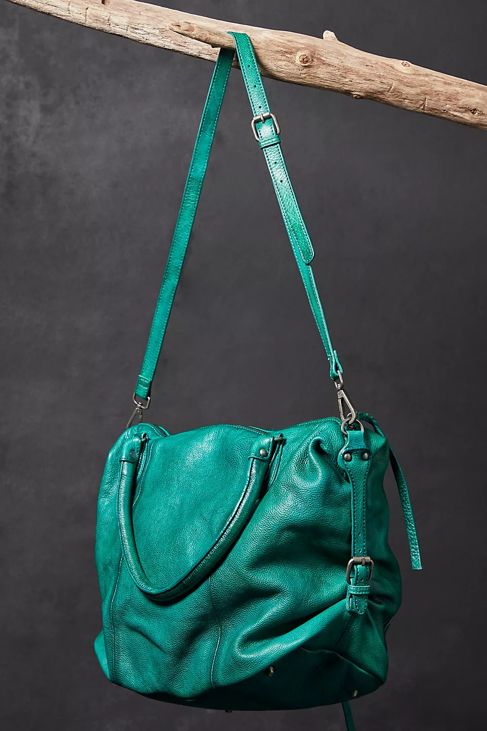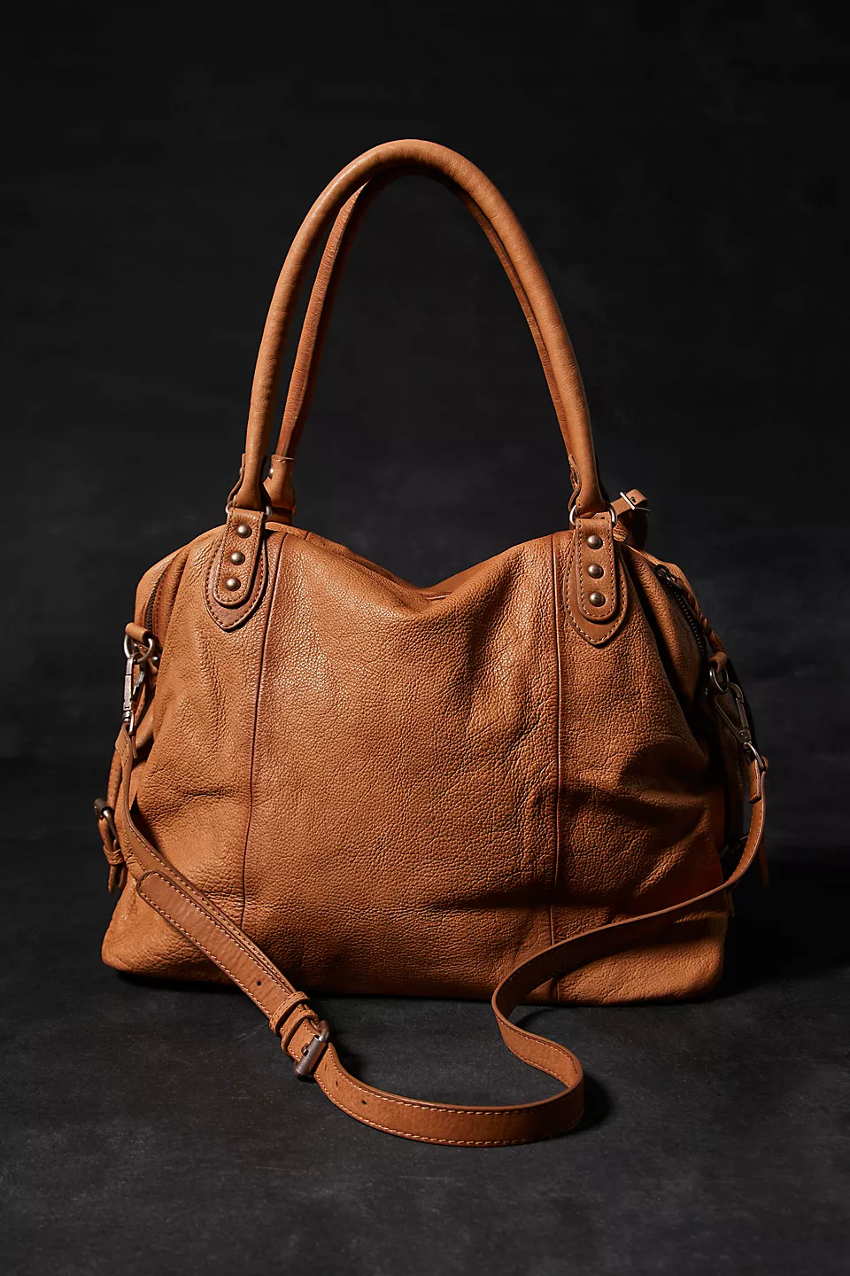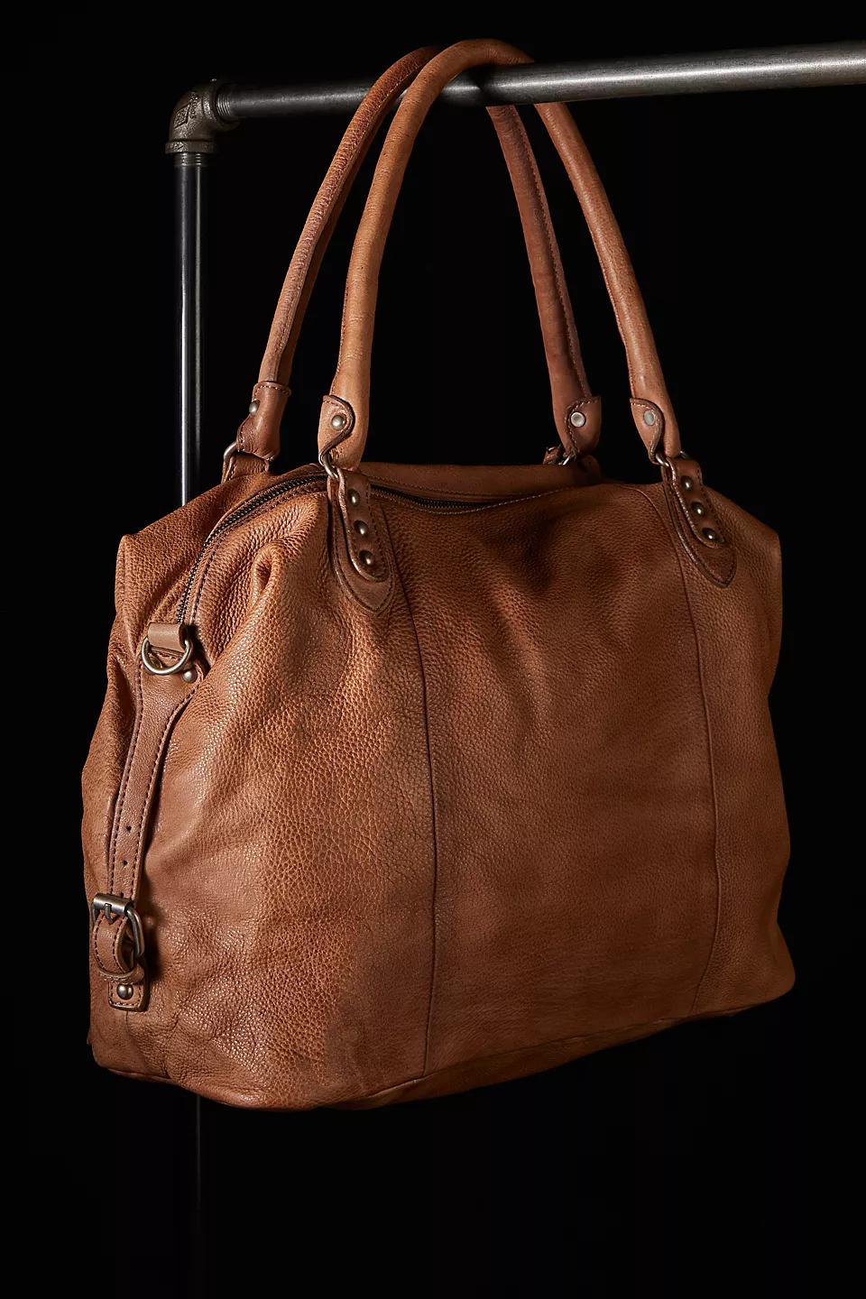 Features: Slouchy style, spacious interior, worn leather fabrication, exterior zipper compartments, exterior and interior pockets, buckle details, two top handles, detachable and adjustable shoulder strap, zipper closure, branded tag