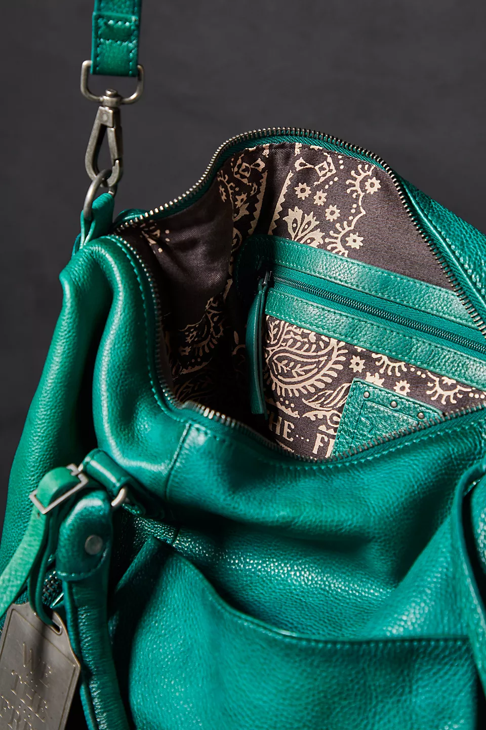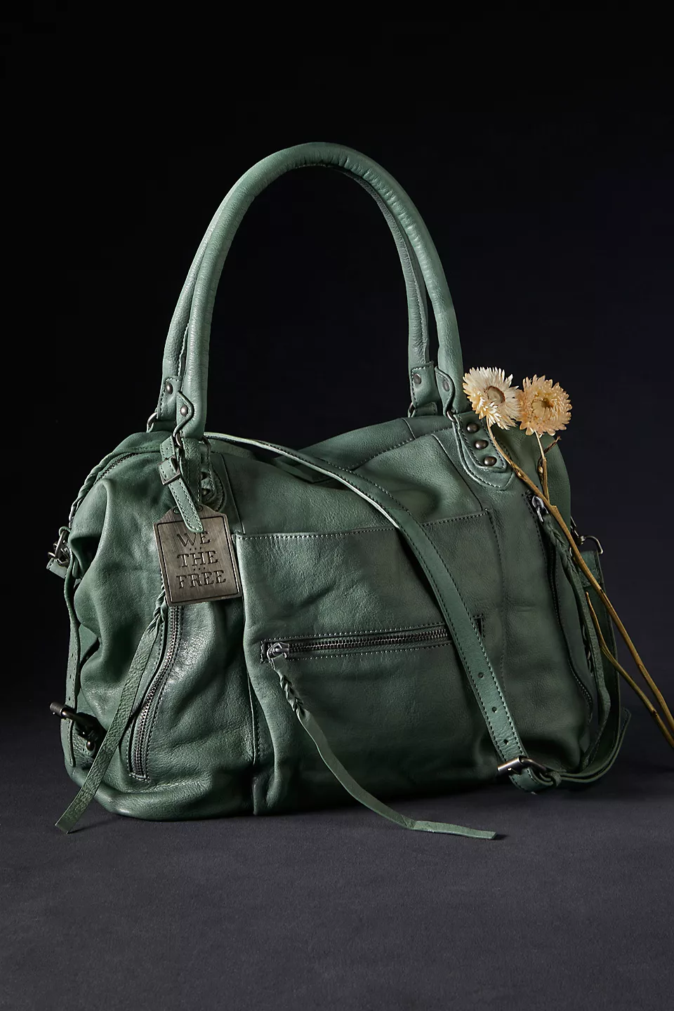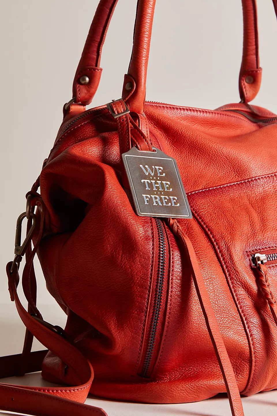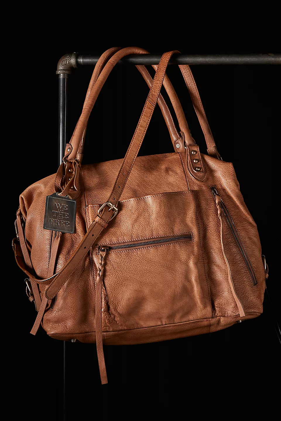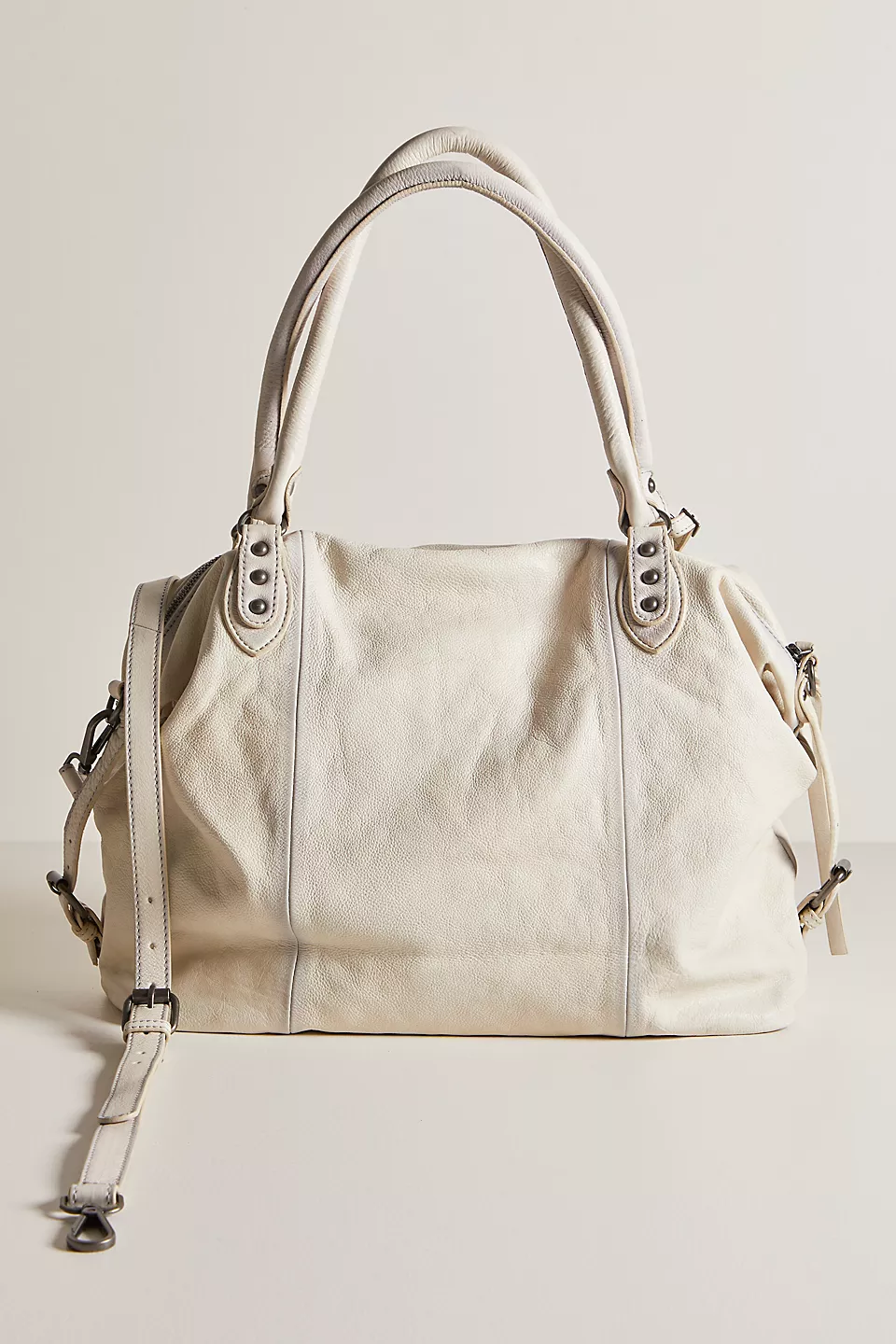 Features: Slouchy style, spacious interior, worn leather fabrication, exterior zipper compartments, exterior and interior pockets, buckle details, two top handles, detachable and adjustable shoulder strap, zipper closure, branded tag