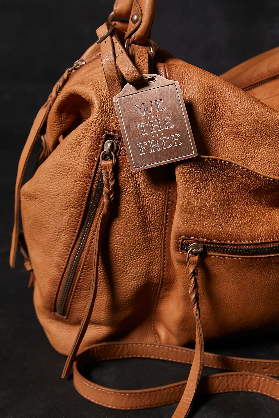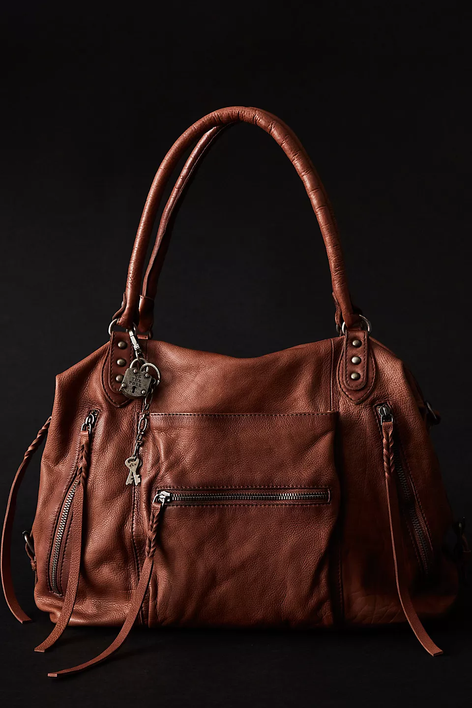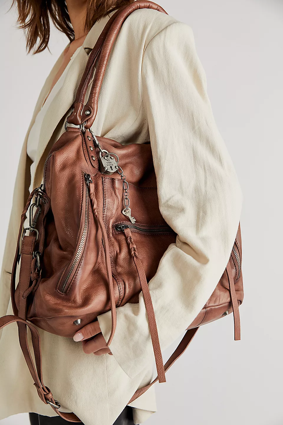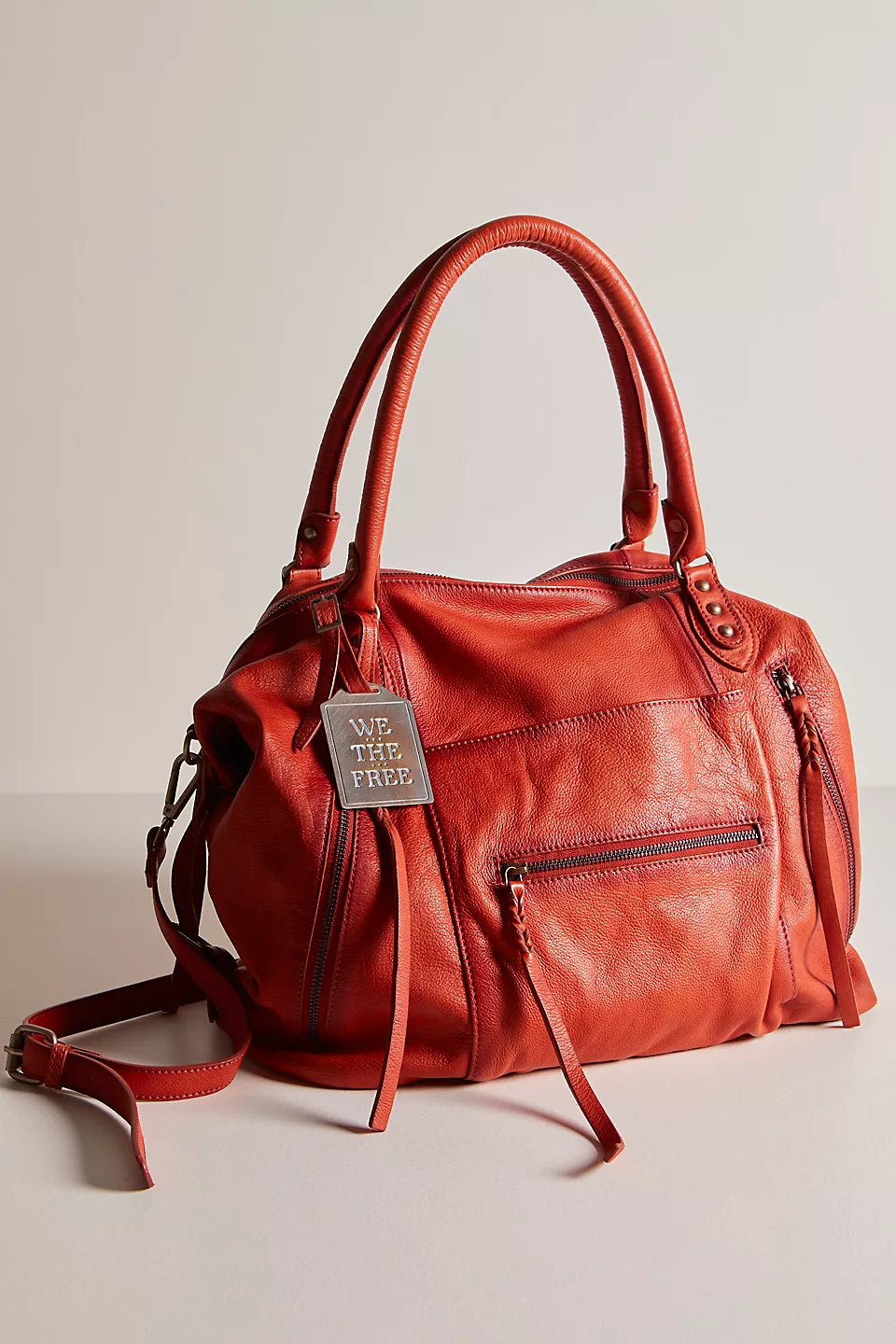 Features: Slouchy style, spacious interior, worn leather fabrication, exterior zipper compartments, exterior and interior pockets, buckle details, two top handles, detachable and adjustable shoulder strap, zipper closure, branded tag