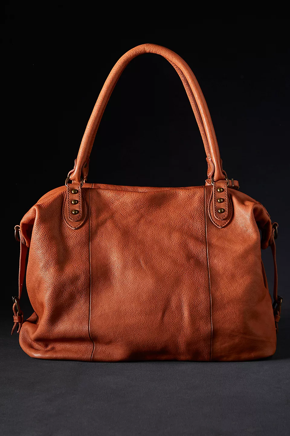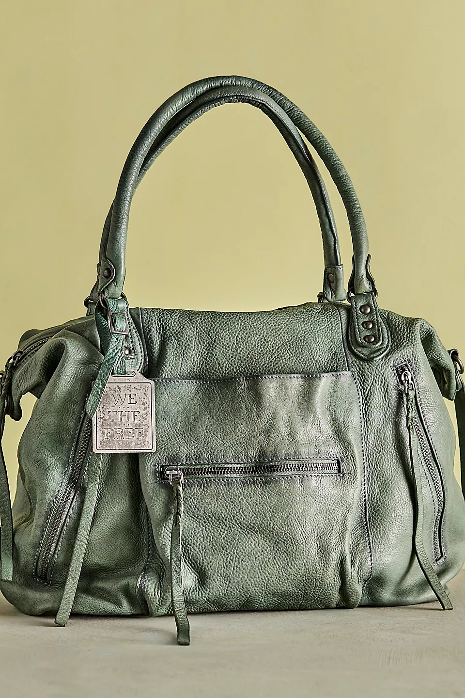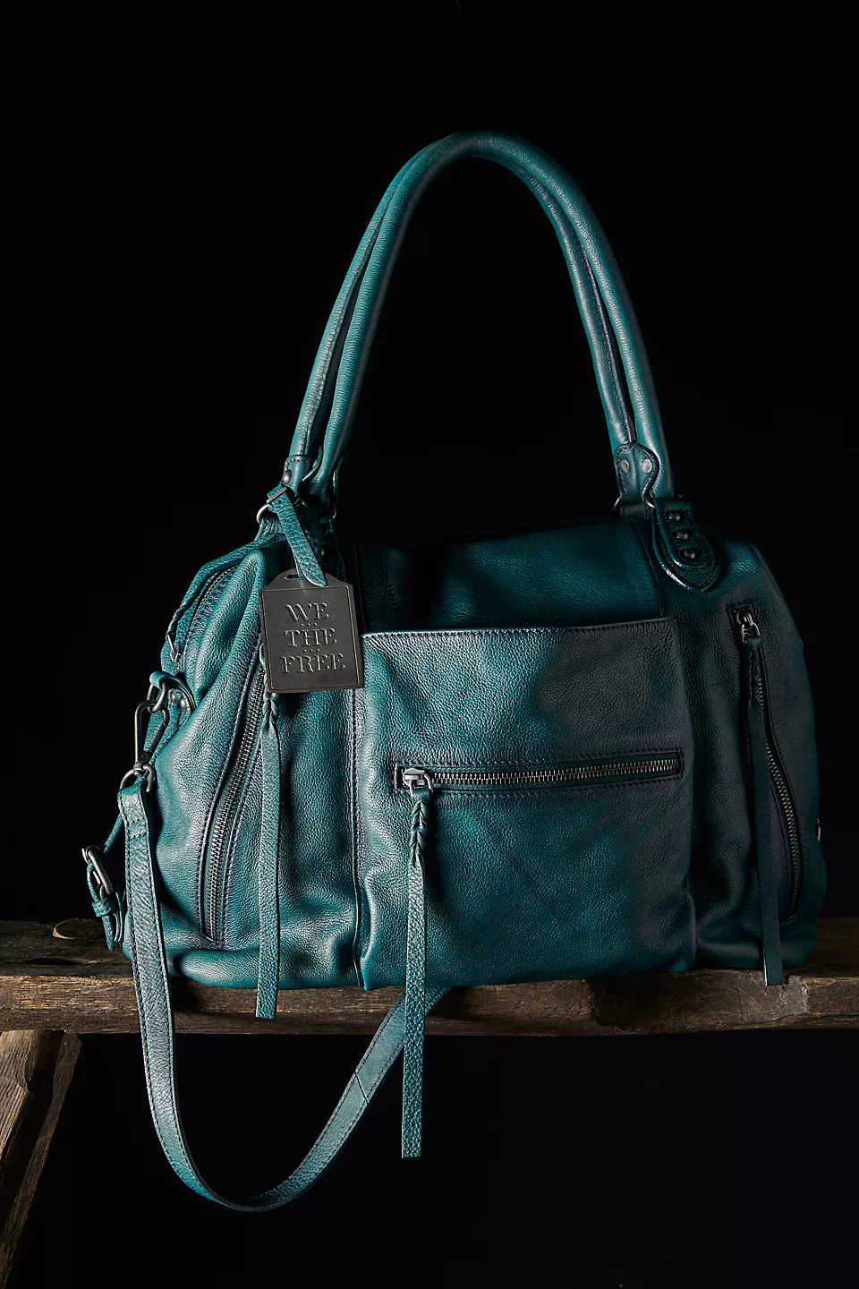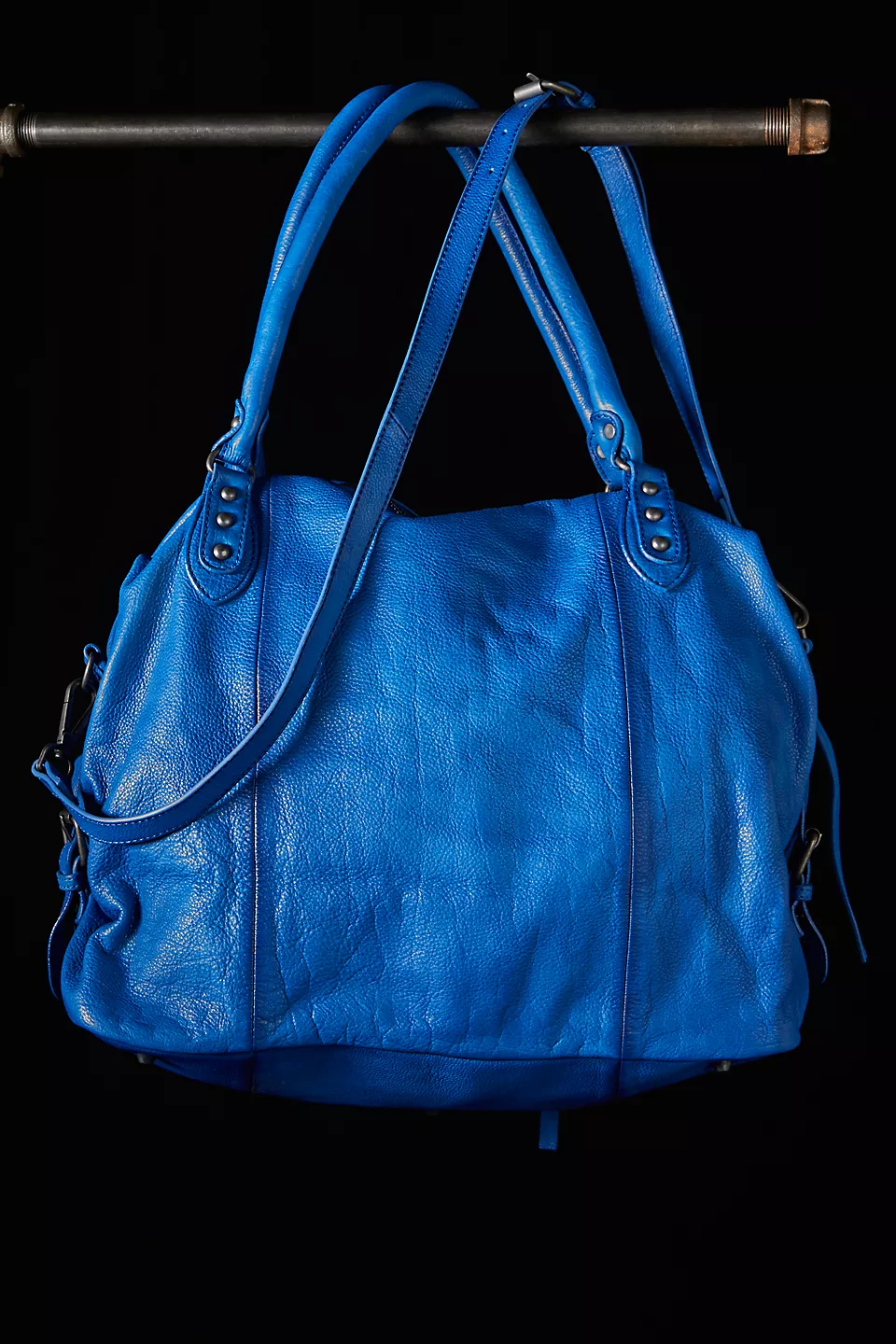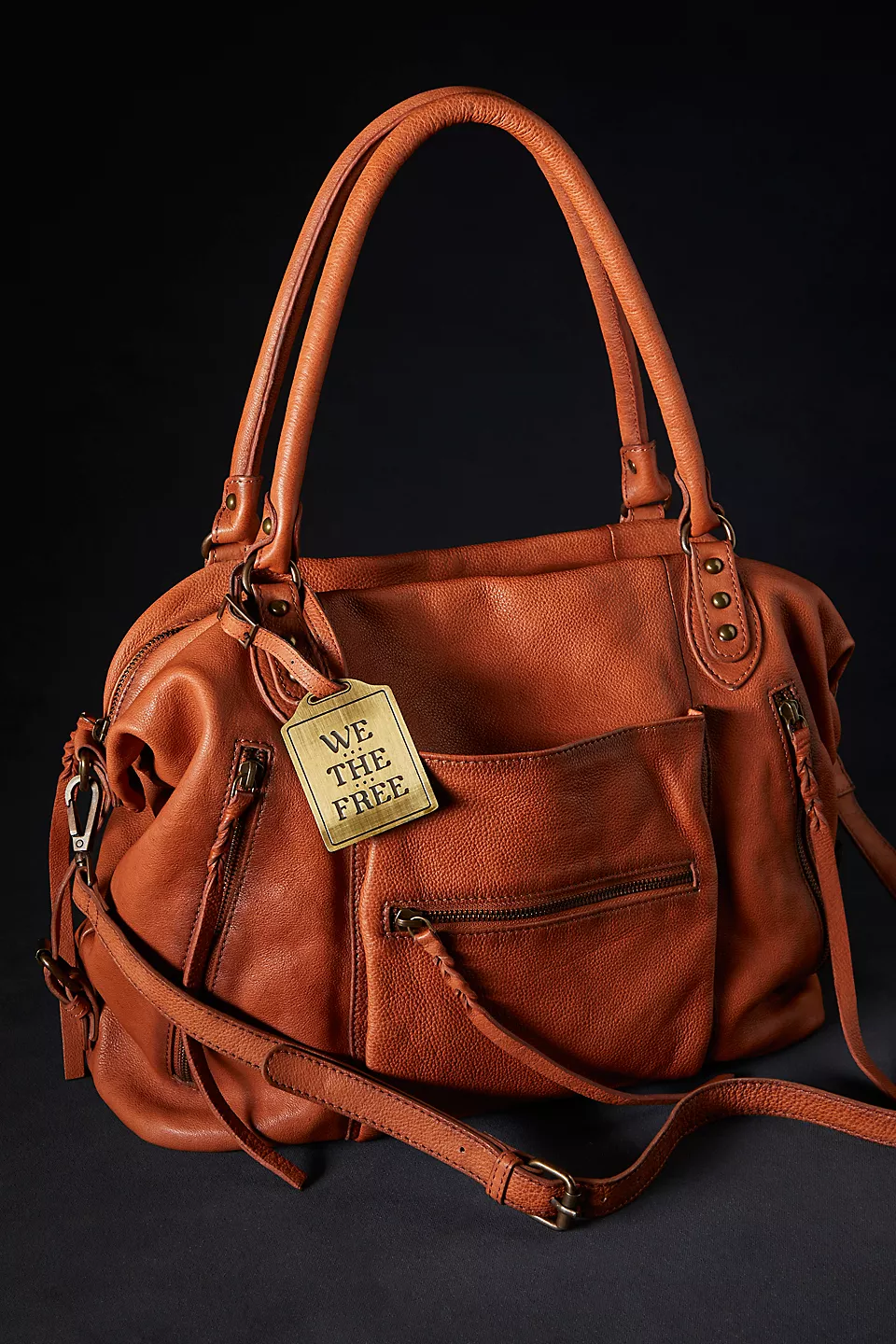 Features: Slouchy style, spacious interior, worn leather fabrication, exterior zipper compartments, exterior and interior pockets, buckle details, two top handles, detachable and adjustable shoulder strap, zipper closure, branded tag