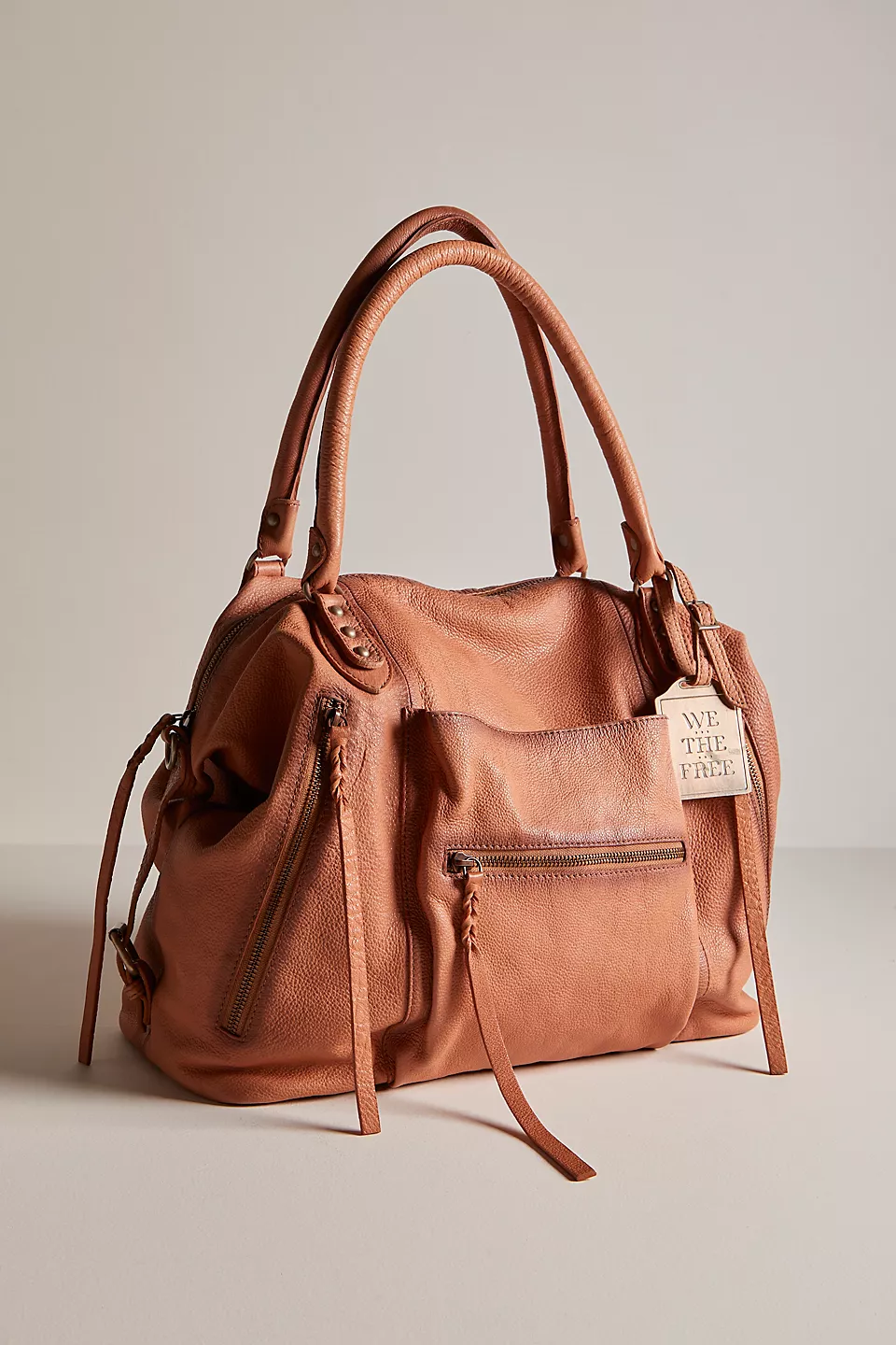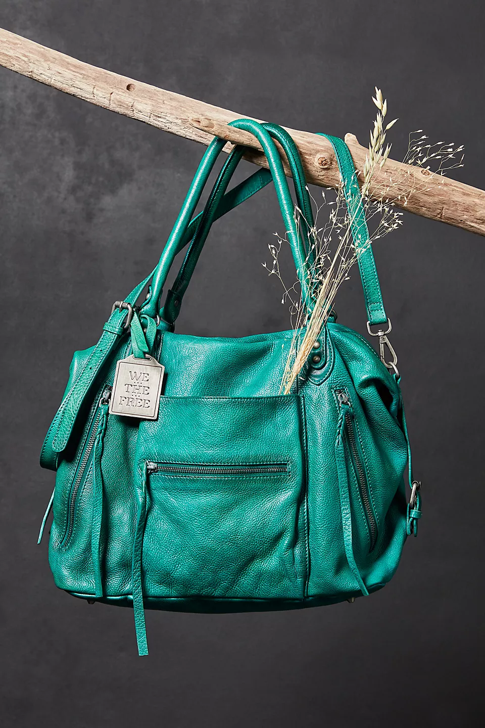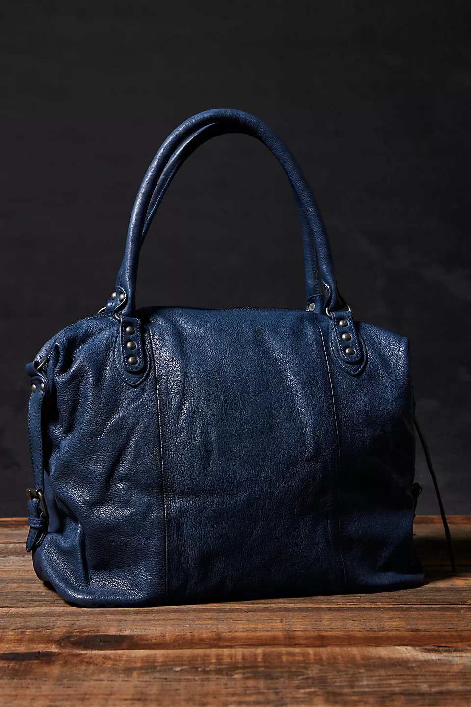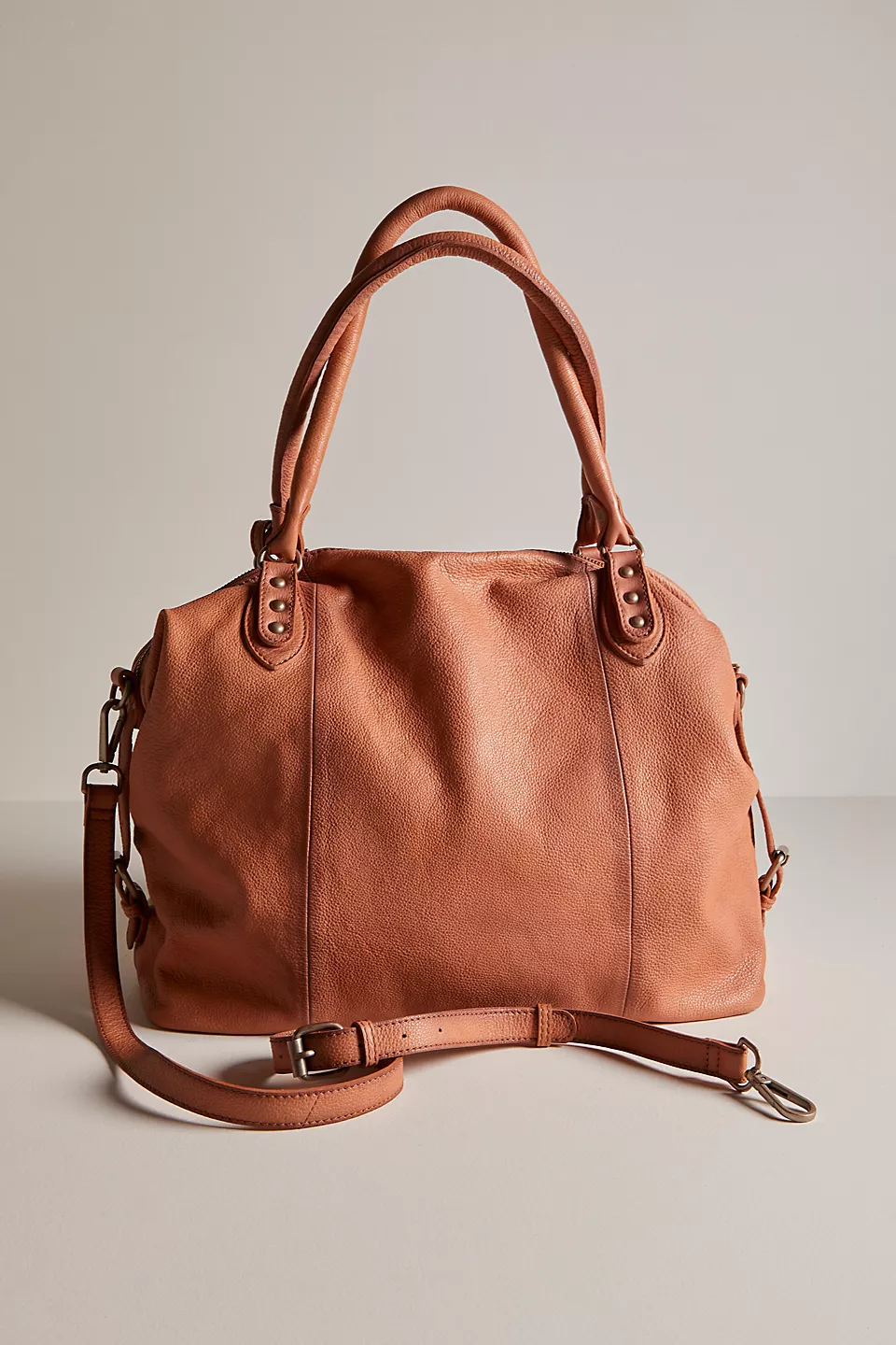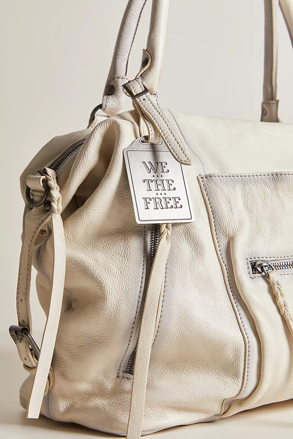 Features: Slouchy style, spacious interior, worn leather fabrication, exterior zipper compartments, exterior and interior pockets, buckle details, two top handles, detachable and adjustable shoulder strap, zipper closure, branded tag