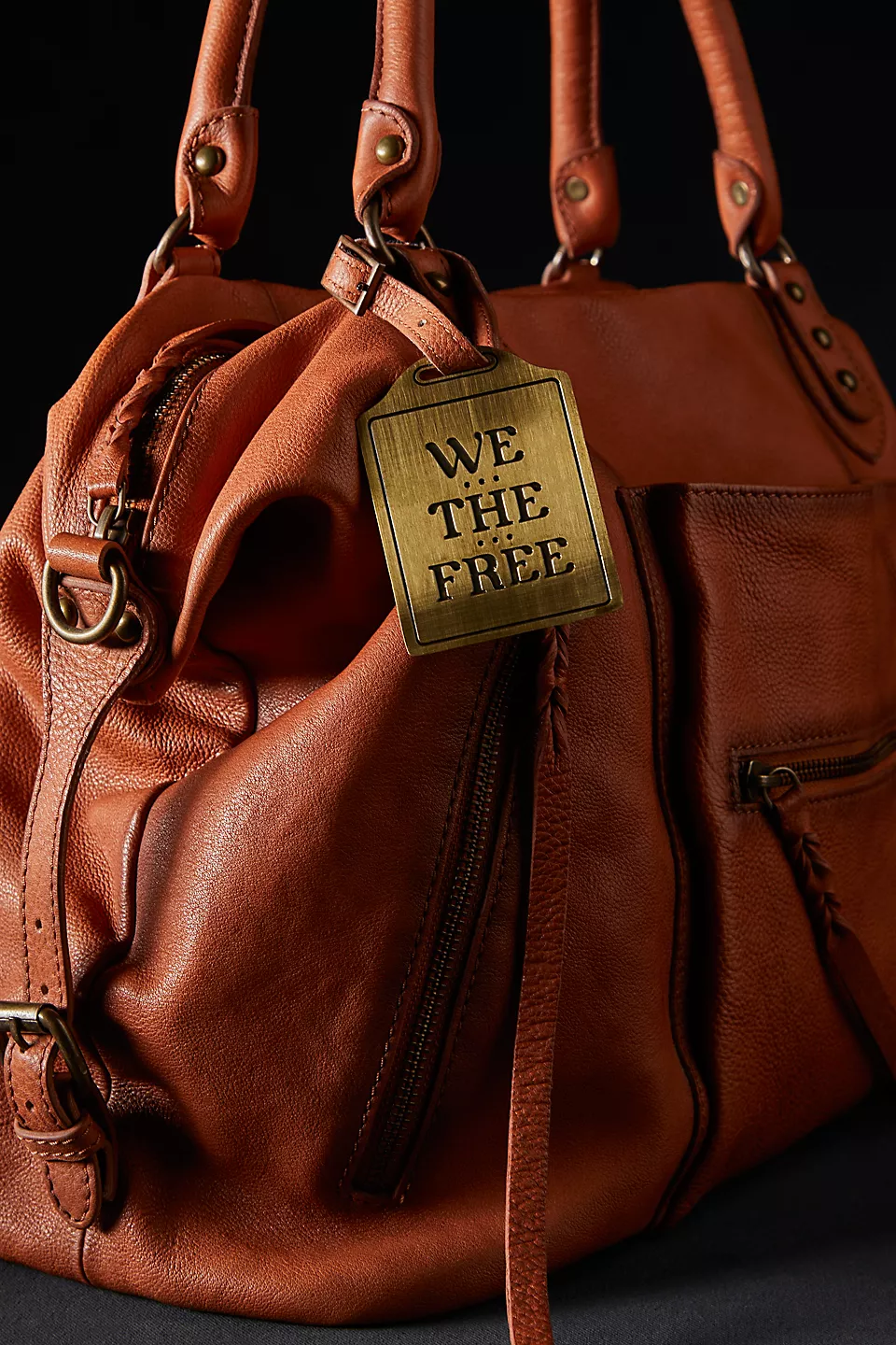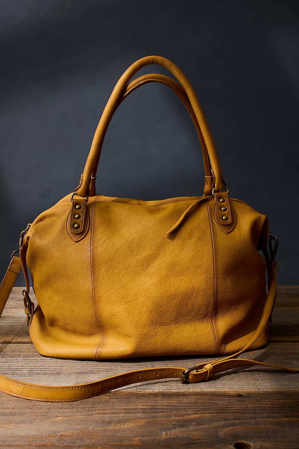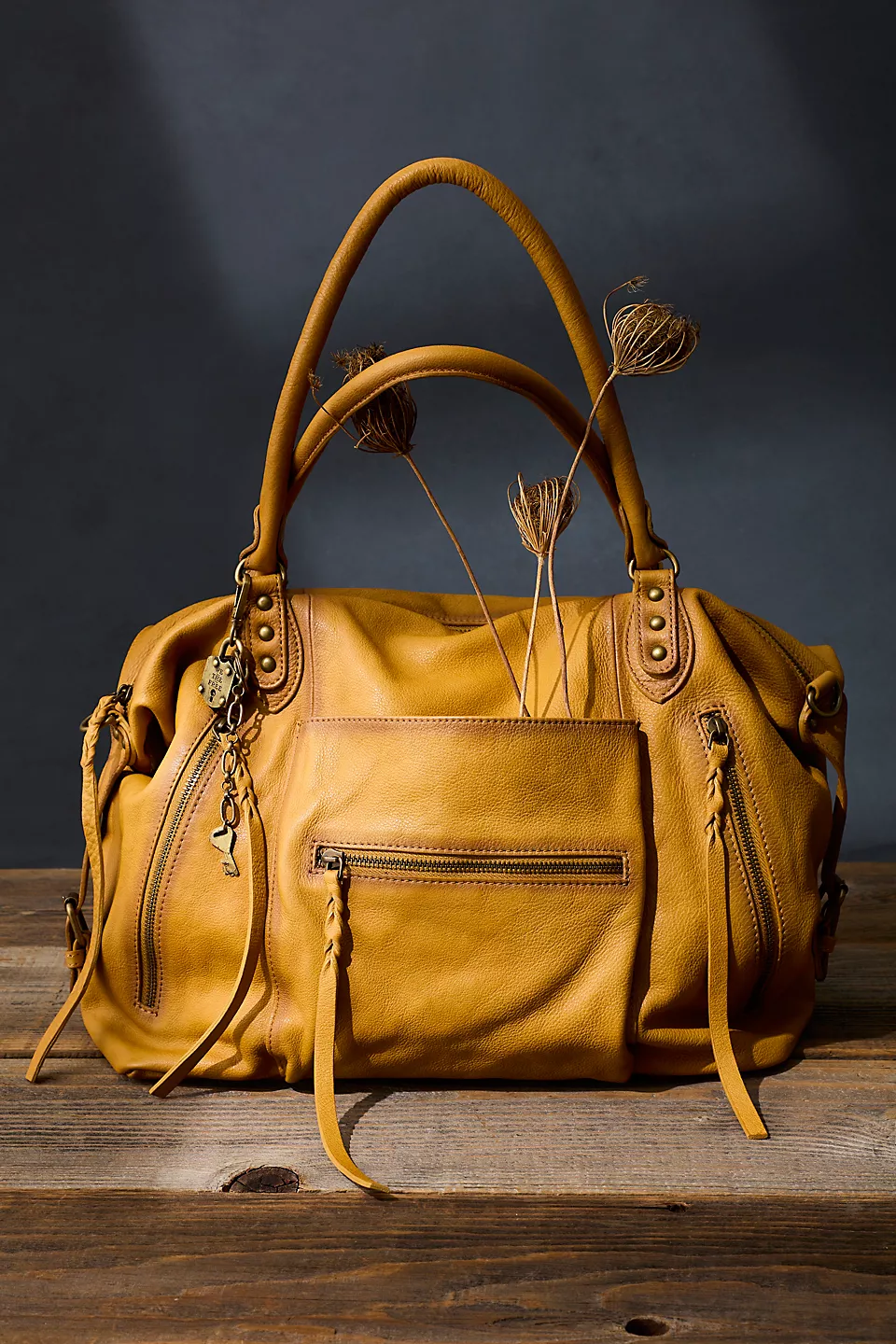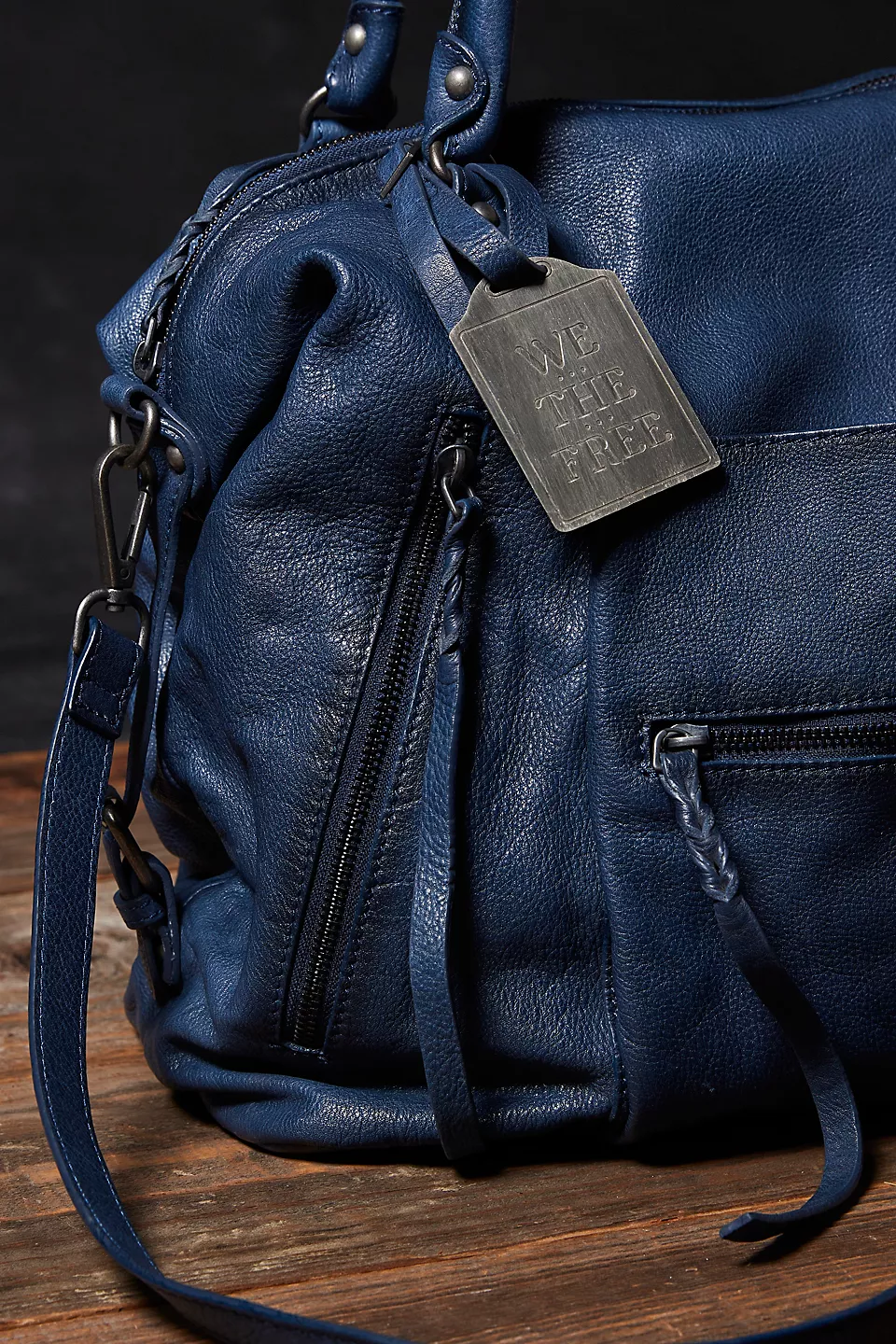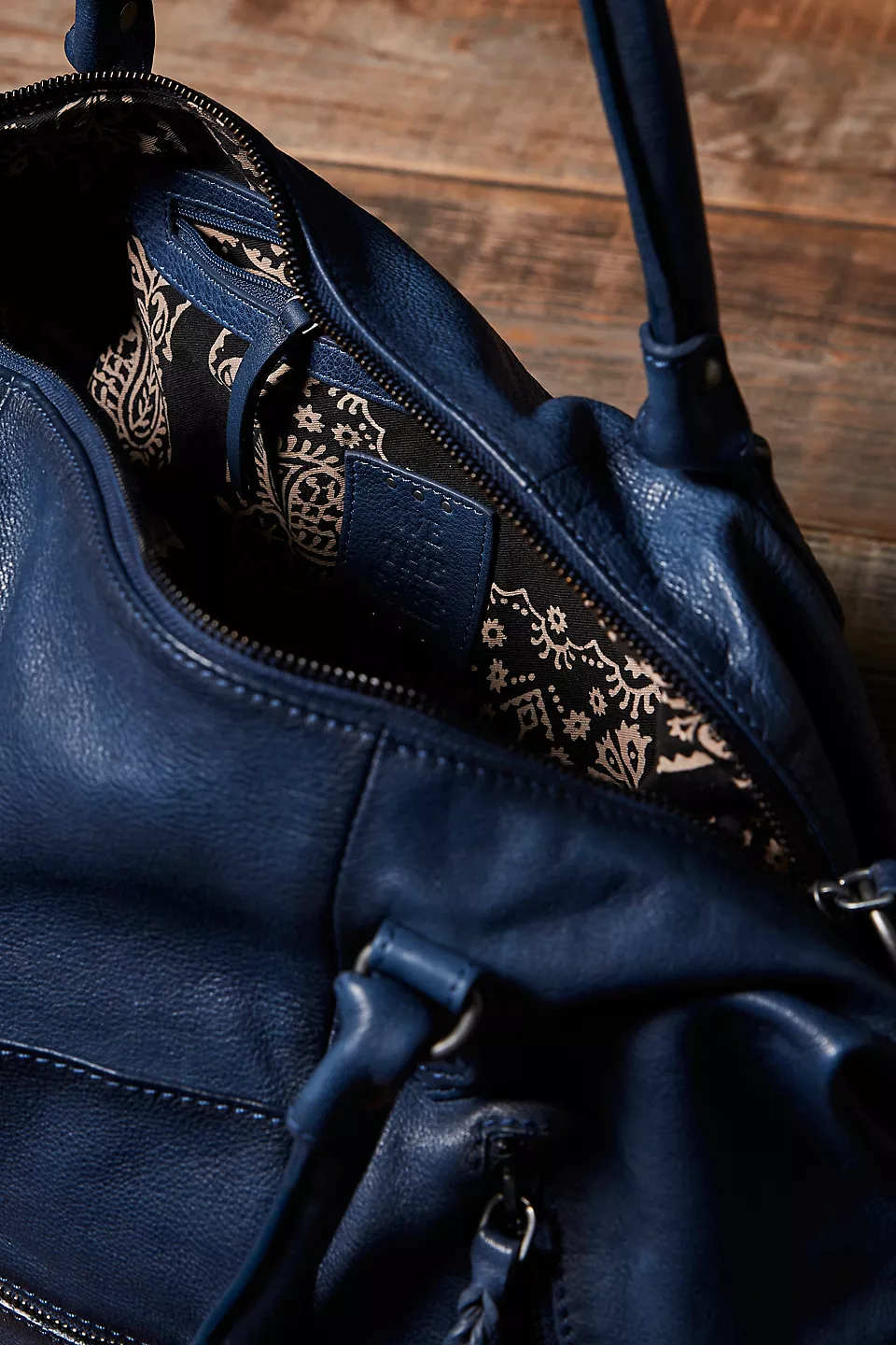 Features: Slouchy style, spacious interior, worn leather fabrication, exterior zipper compartments, exterior and interior pockets, buckle details, two top handles, detachable and adjustable shoulder strap, zipper closure, branded tag