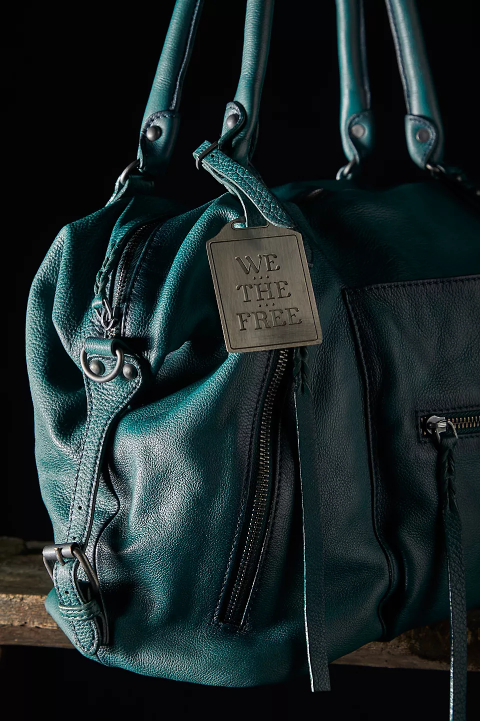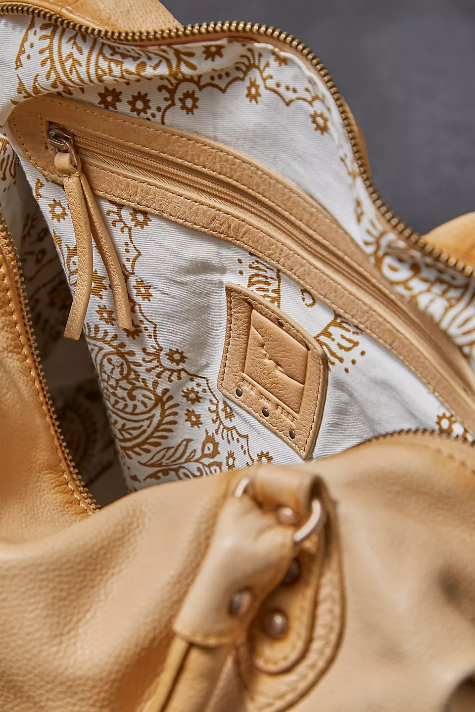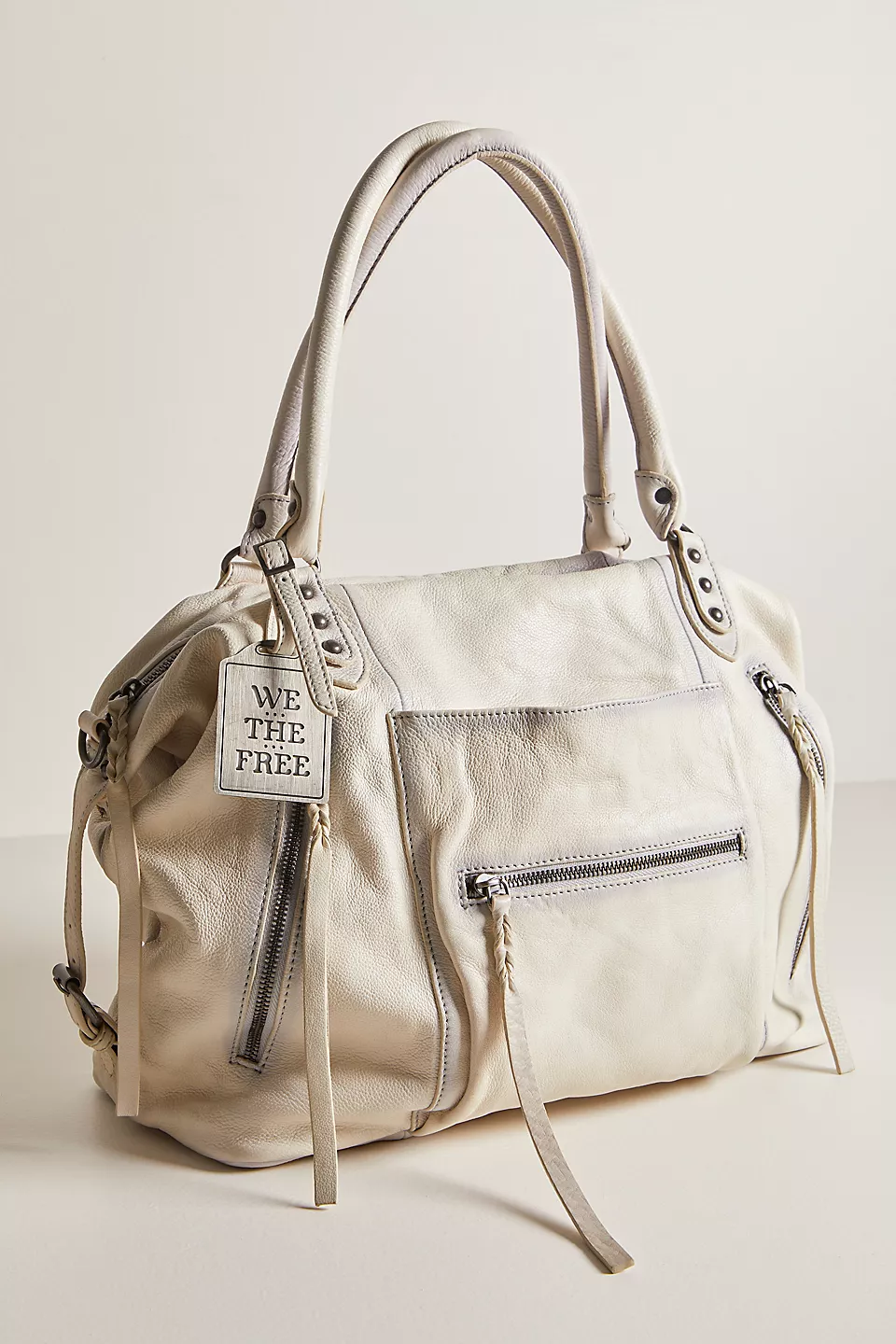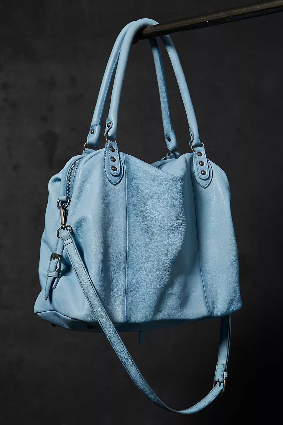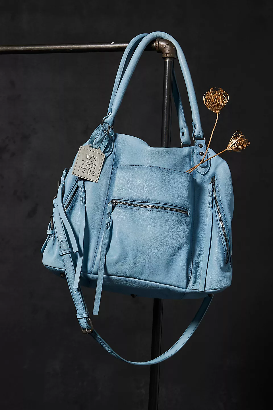 Features: Slouchy style, spacious interior, worn leather fabrication, exterior zipper compartments, exterior and interior pockets, buckle details, two top handles, detachable and adjustable shoulder strap, zipper closure, branded tag