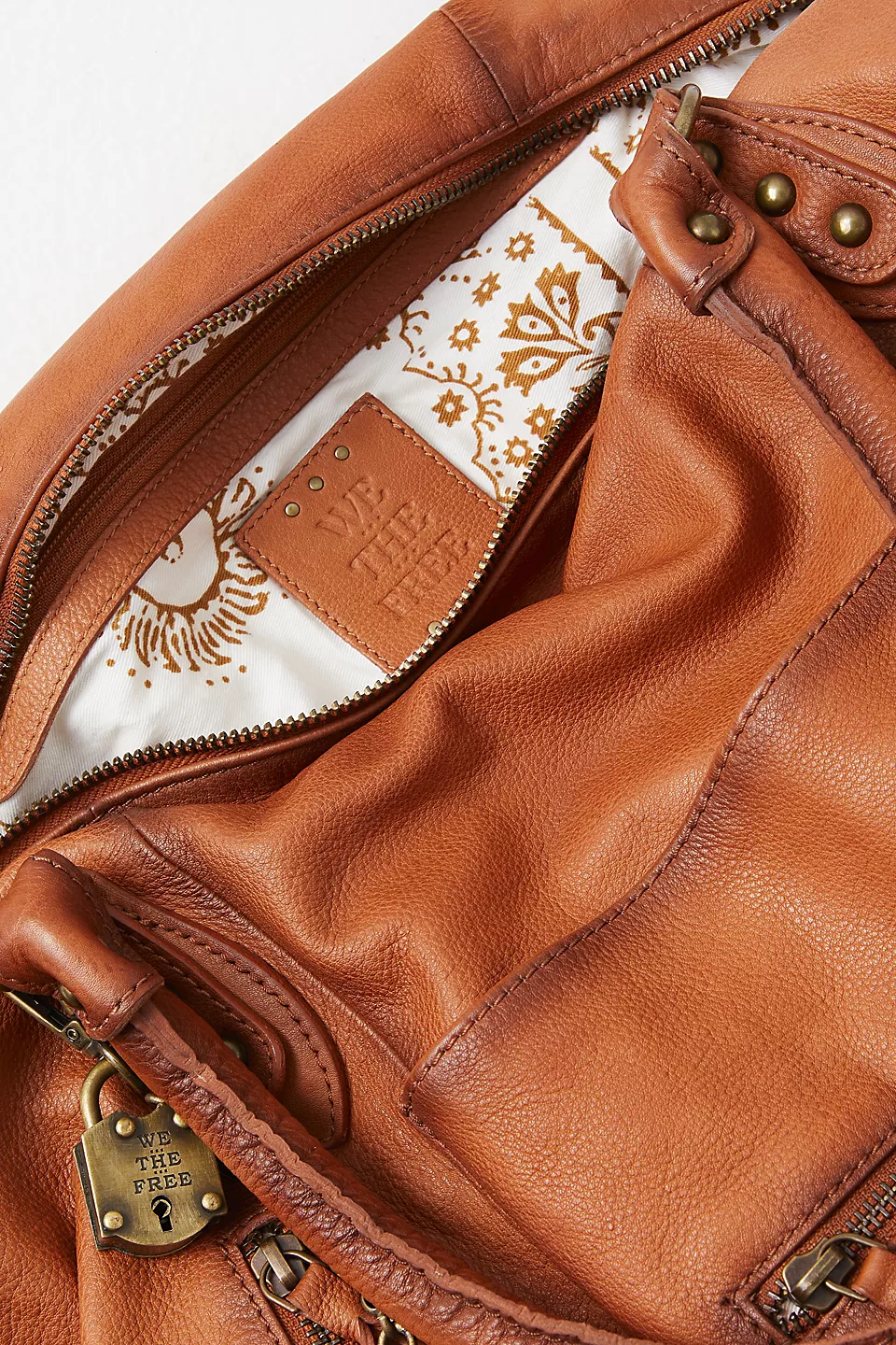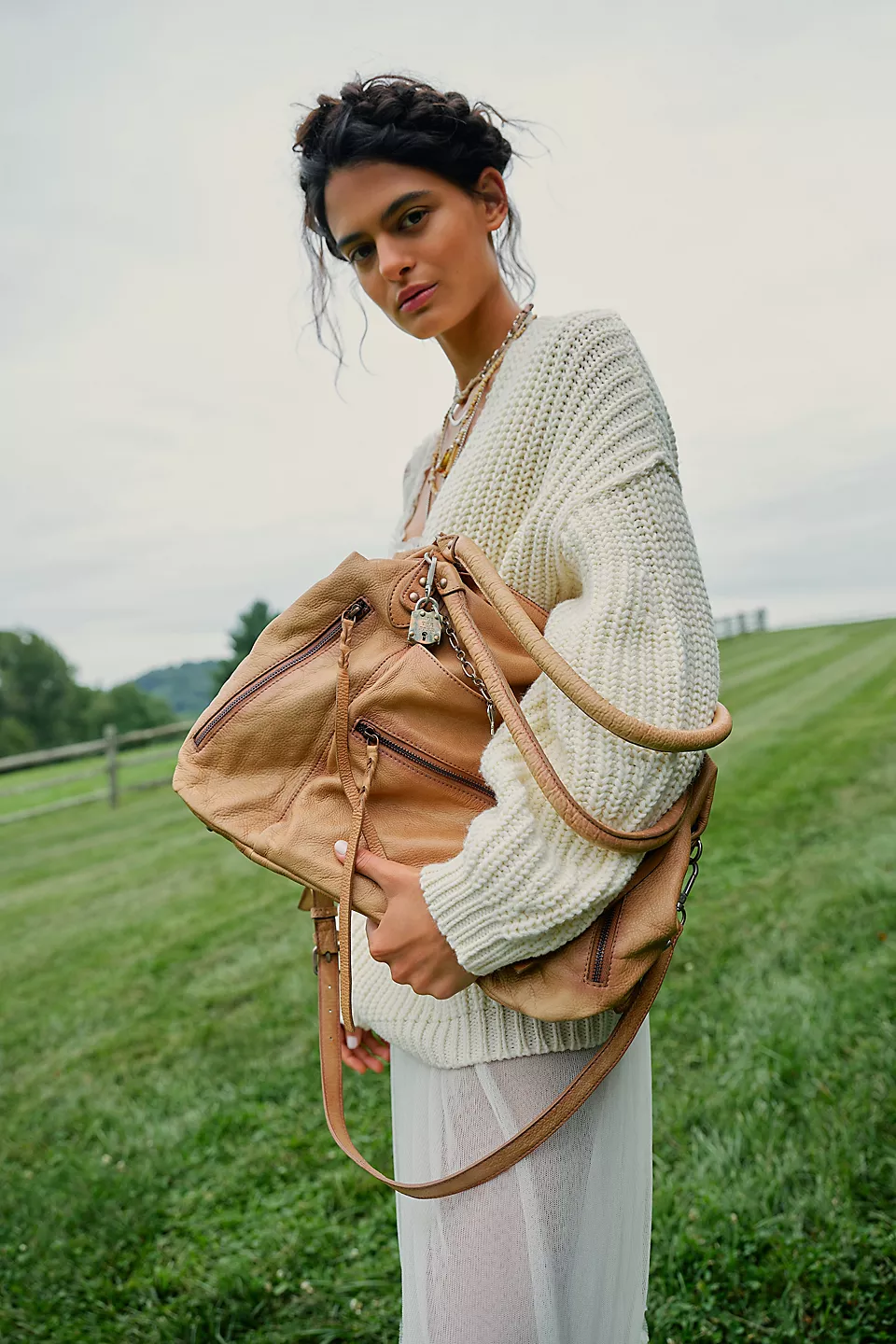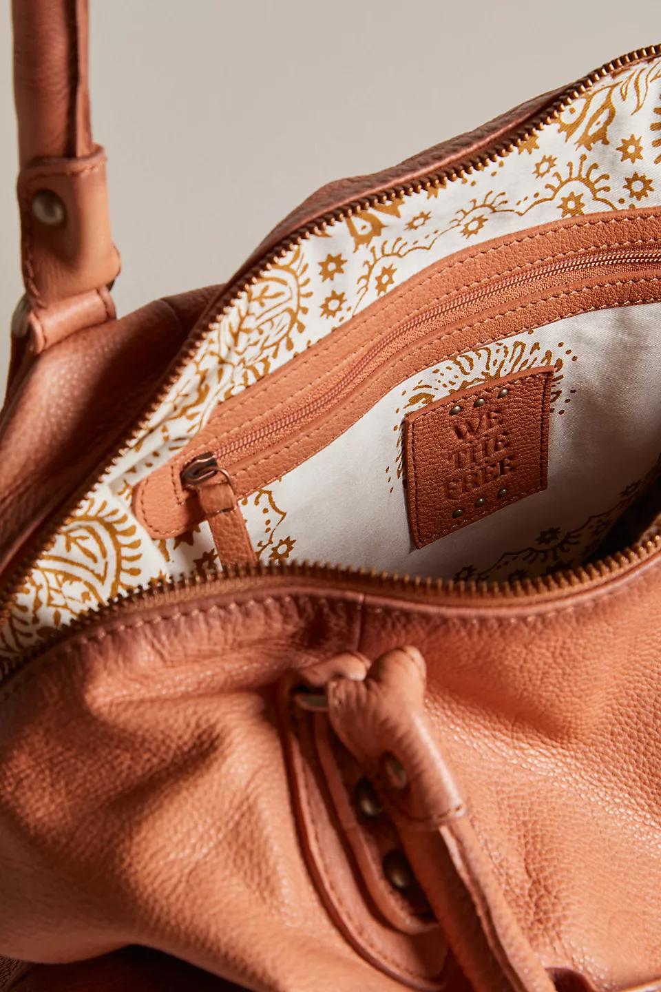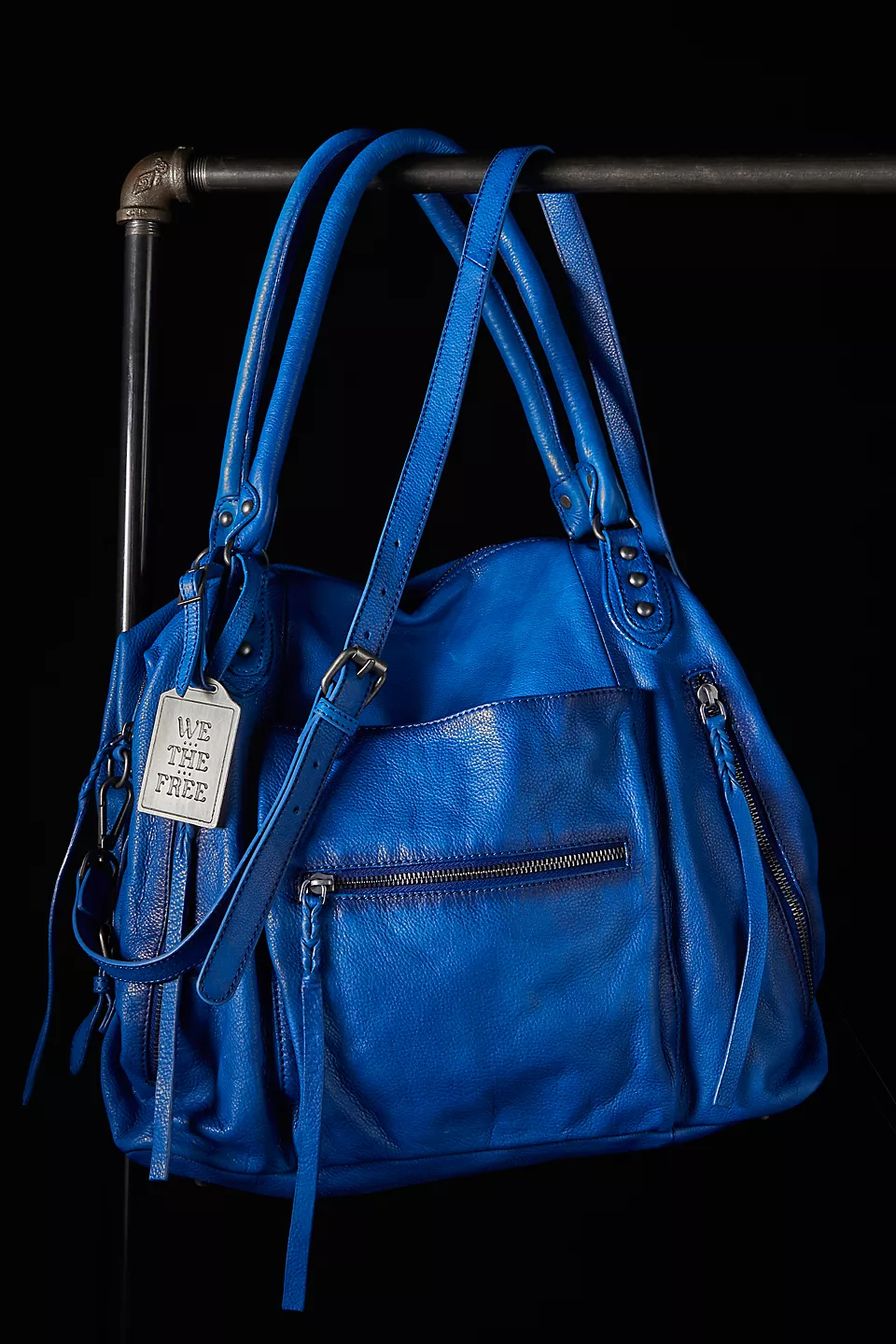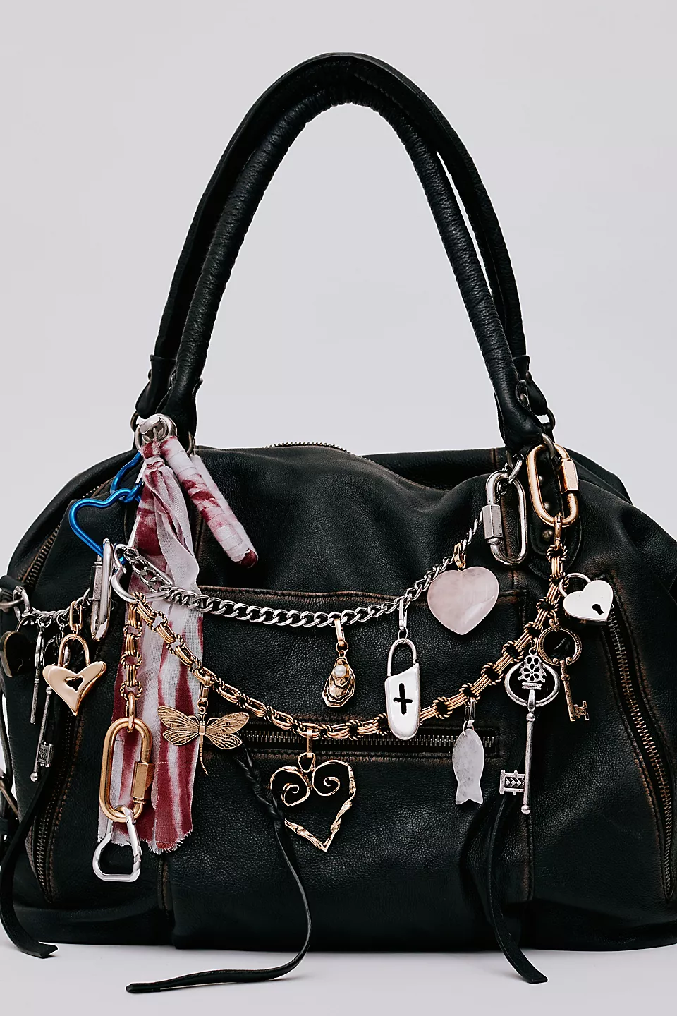 Features: Slouchy style, spacious interior, worn leather fabrication, exterior zipper compartments, exterior and interior pockets, buckle details, two top handles, detachable and adjustable shoulder strap, zipper closure, branded tag